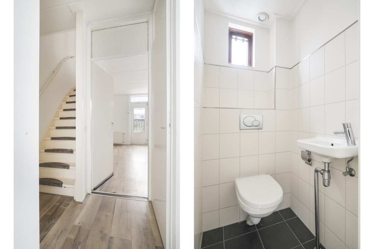Lees verderEntree, met toegang tot het vrij-hangende toilet met fonteintje, meterkast met glasvezelaansluiting, deur naar de woonkamer en trap naar de verdieping.