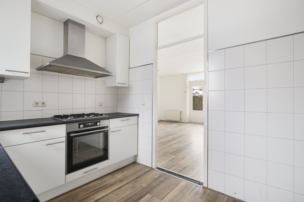 De keuken is voorzien van een vaatwasser, combi-oven, afzuigkap, 4-pits gaskookplaat en voldoende opbergruimte in de laden. Via een deur in de keuken is de voortuin bereikbaar.
