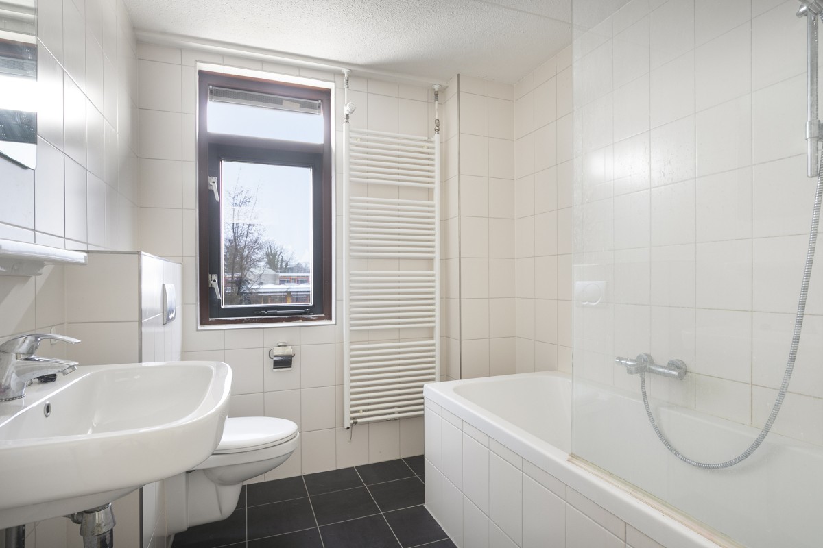 De betegelde badkamer is voorzien van een toilet, wastafel, een bad (douchen in bad).