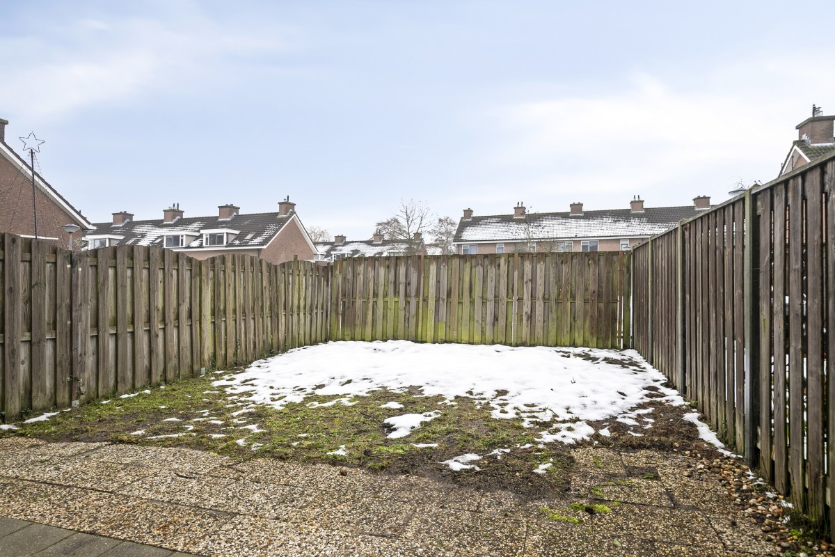 De achtertuin, gelegen op het zuiden, is voorzien van bestrating, gras en schuttingen rondom.