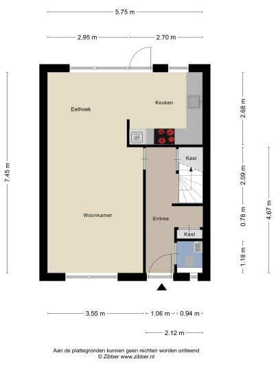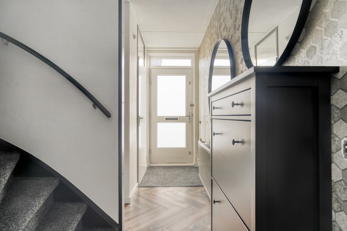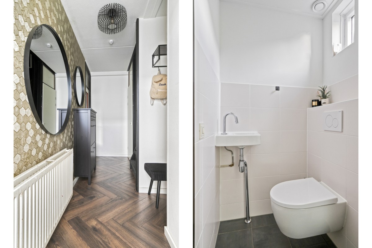 Lees verderEntree, met toegang tot het vrij-hangende toilet met fonteintje, meterkast, trapkast, deur naar de woonkamer en trap naar de verdieping.