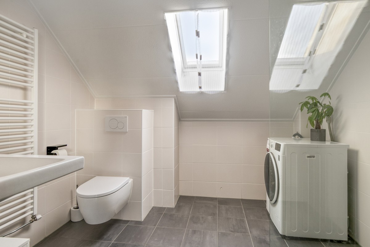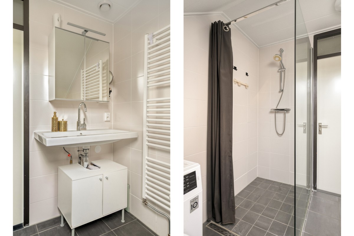 De volledig betegelde badkamer is voorzien van een toilet, wastafel en een douche.