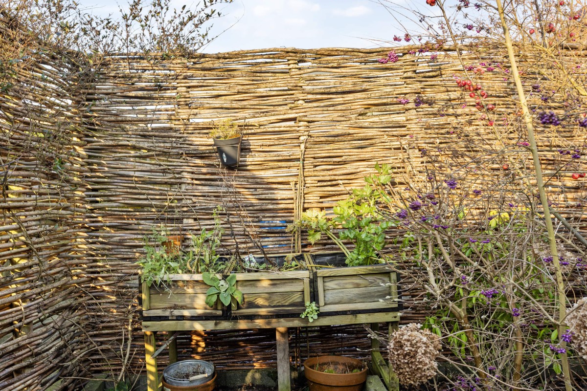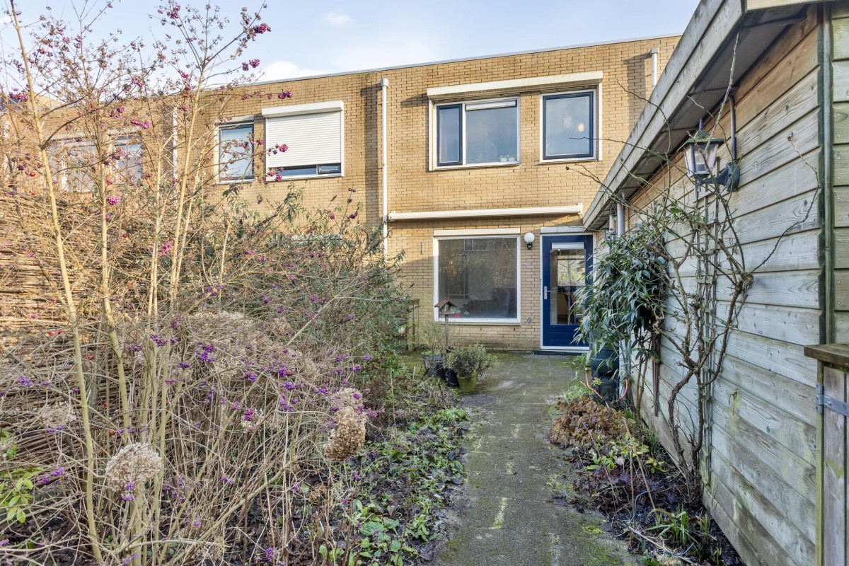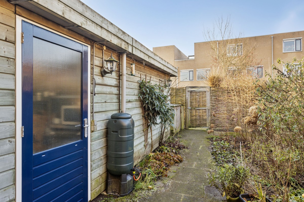 De tuin ligt op het noordwesten en is leuk aangelegd met terras en groene borders. Een aangebouwde houten berging biedt ruimte voor fietsen en er is natuurlijk een achterom.