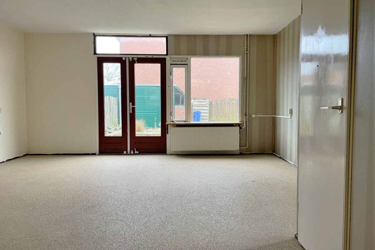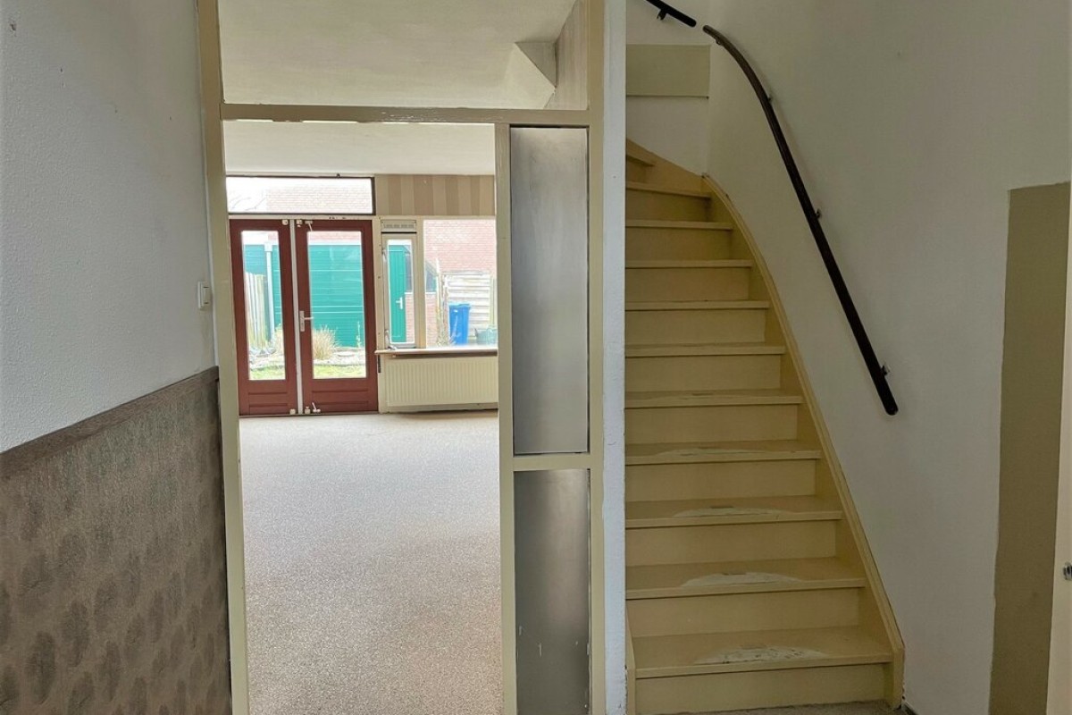 Begane grond: hal, toilet, meterkast en trapopgang. Royale tuingerichte woonkamer met openslaande tuindeuren die toegang geven tot de diepe op het zuidoosten gelegen tuin. Aan de voorkant bevindt zich de halfopen keuken.