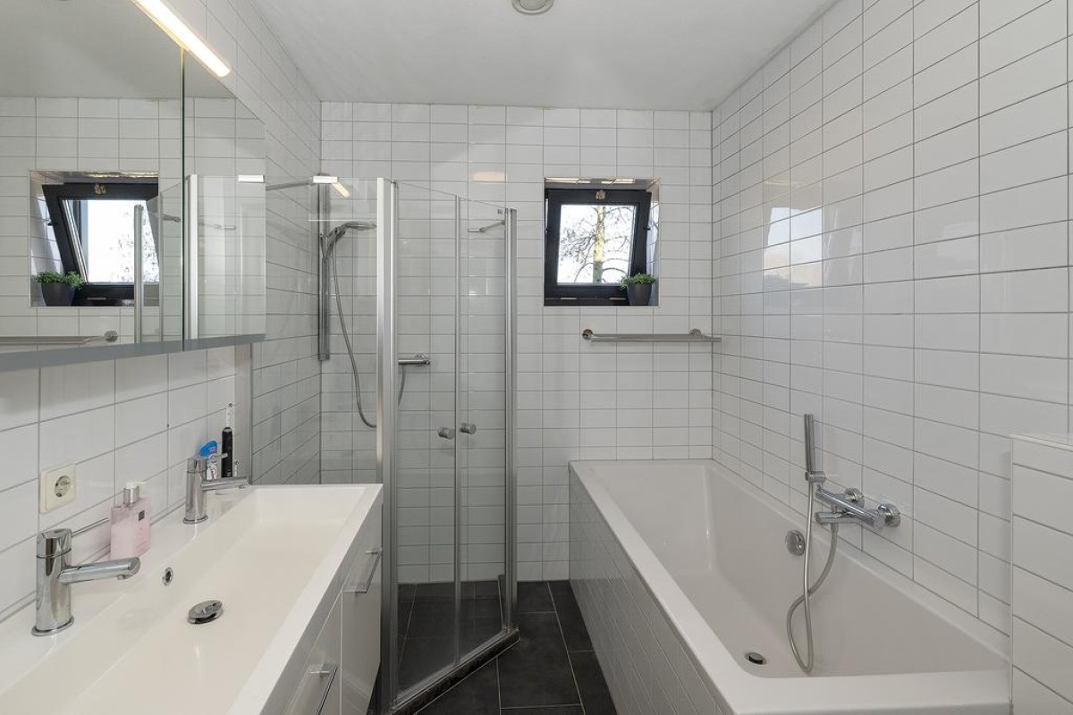 1e Verdieping: overloop met een diepe (werk)kast, één slaapkamer aan de voorzijde met een vaste kastenwand en met een fraai uitzicht over het park, twee slaapkamers aan de achterzijde waarvan één slaapkamer is voorzien van een elektrische screen. De royale badkamer is voorzien van een douchehoek, ligbad, dubbele wastafelmeubel en toilet. Vaste trap naar...