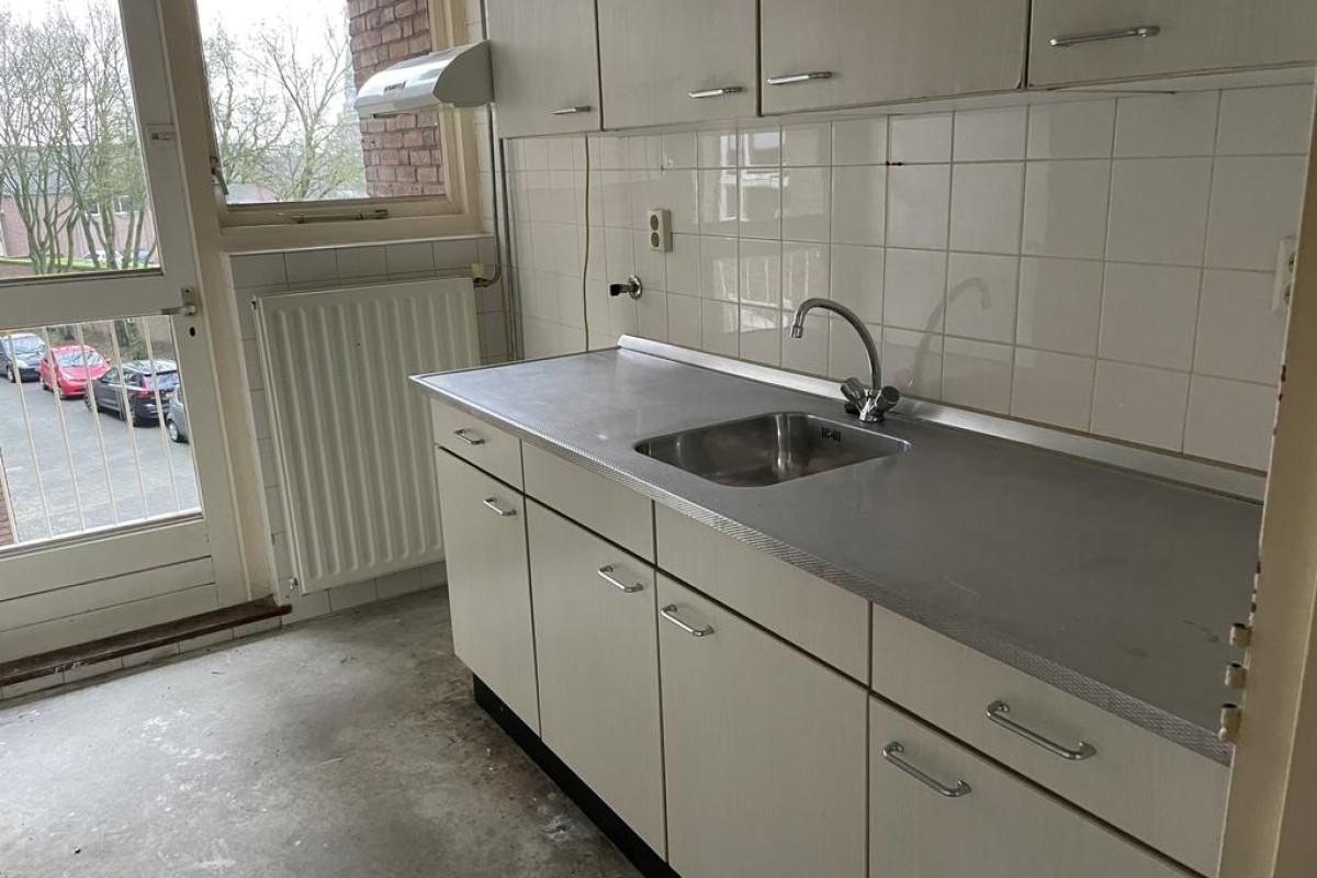 De keuken is gelegen aan de achterzijde van het appartement en voorzien van een eenvoudig keukenblok en geeft toegang tot een klein balkon.