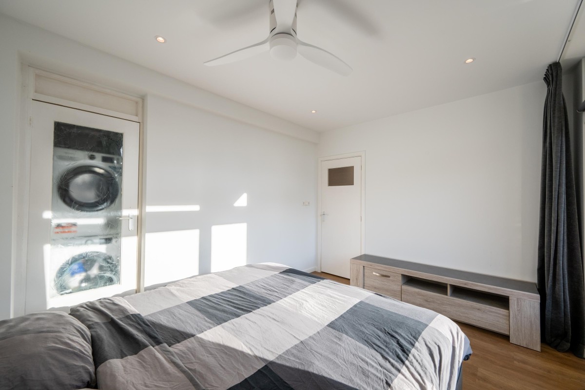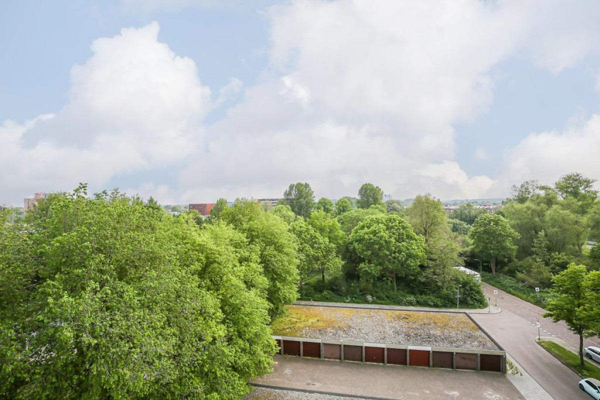 Hal met inloopbergkast, lichte woonkamer met PVC-vloer, open keuken met inbouw-apparatuur (o.a. vaatwasser) en toegang tot het balkon op het westen. In de slaapkamer is het tweede balkon (op het zuiden) en kijkt uit op een dak met sedumbeplanting. Via de slaapkamer kom je bij de berging met aansluiting voor wasmachine en droger. De moderne badkamer is voorzien van douche, wastafel en toilet. Het hele appartement ziet er keurig uit. Het plafond is netjes afgewerkt en in de hal is het plafond verhoogd.