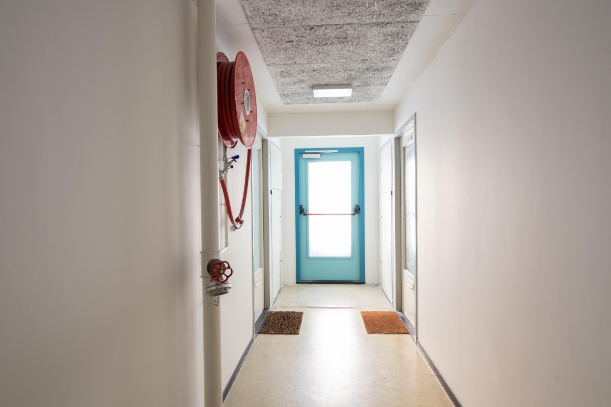 Volledig aan het eind van de gang is de entree van het appartement, dus op de hoek van het complex.
