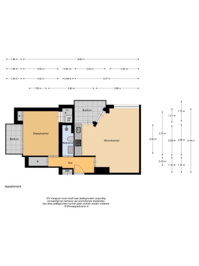 - Woonoppervlakte 46,5 m², totale gebruiksoppervlakte 55,9 m², inhoud ca. 155 m³ (volgens meetinstructie NEN 2580);