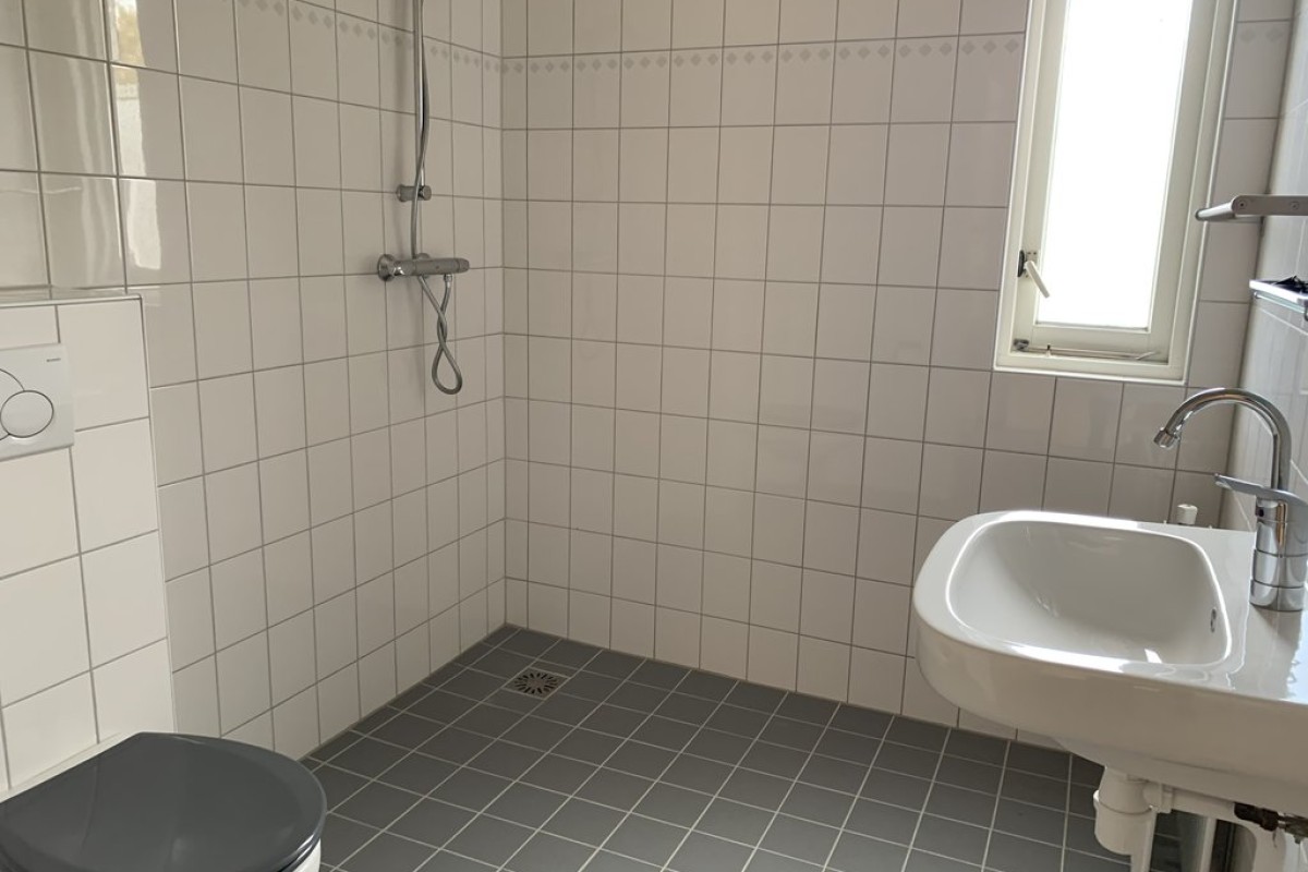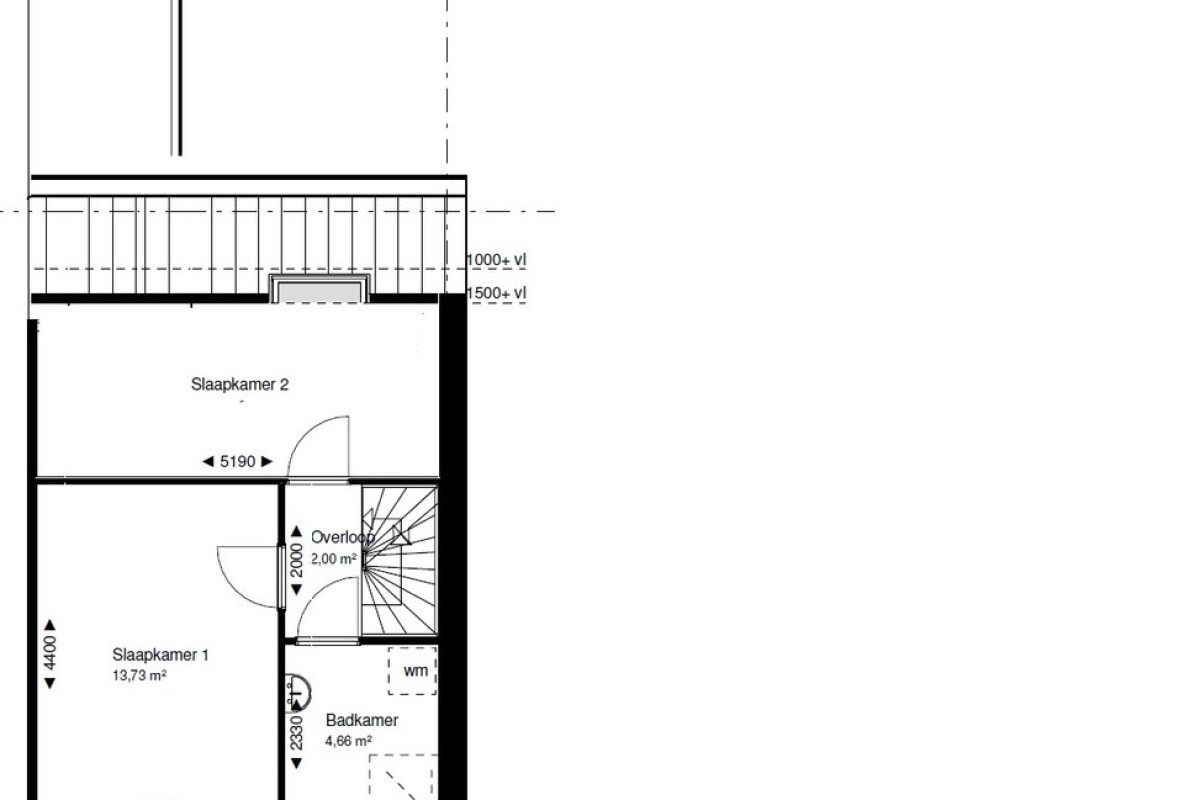 Overloop met toegang tot 2 royale slaapkamers. De slaapkamer aan de achterzijde ligt over de gehele breedte van het woning. De badkamer is voorzien van een douche, vaste wastafel en een wasmachineaansluiting. Via een vaste trap bereikt u de tweede verdieping.