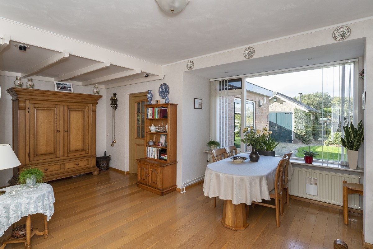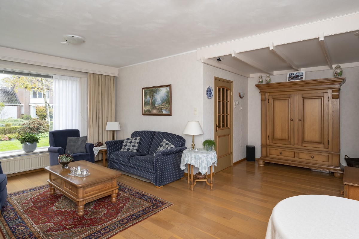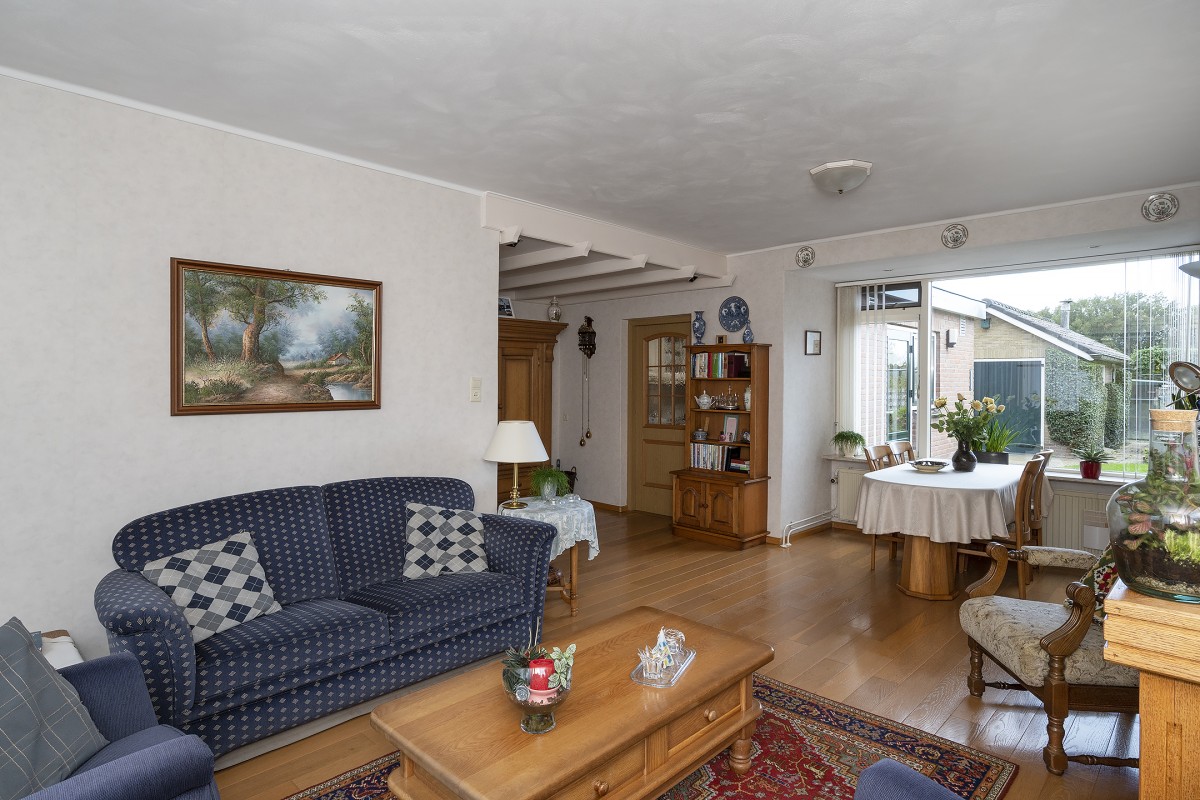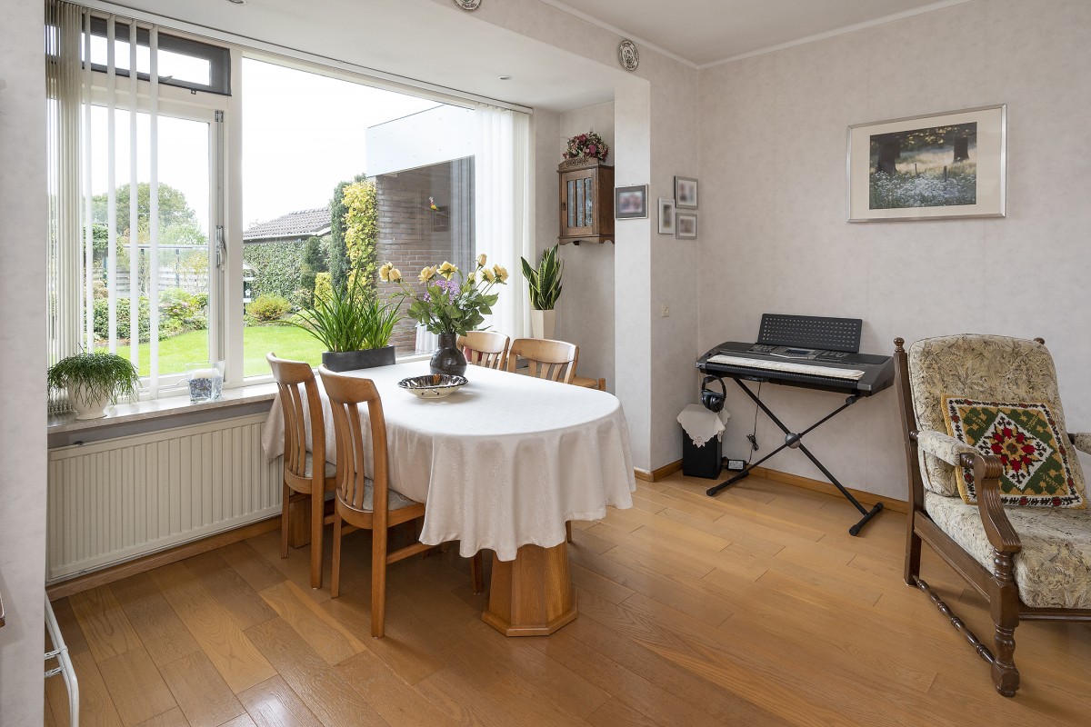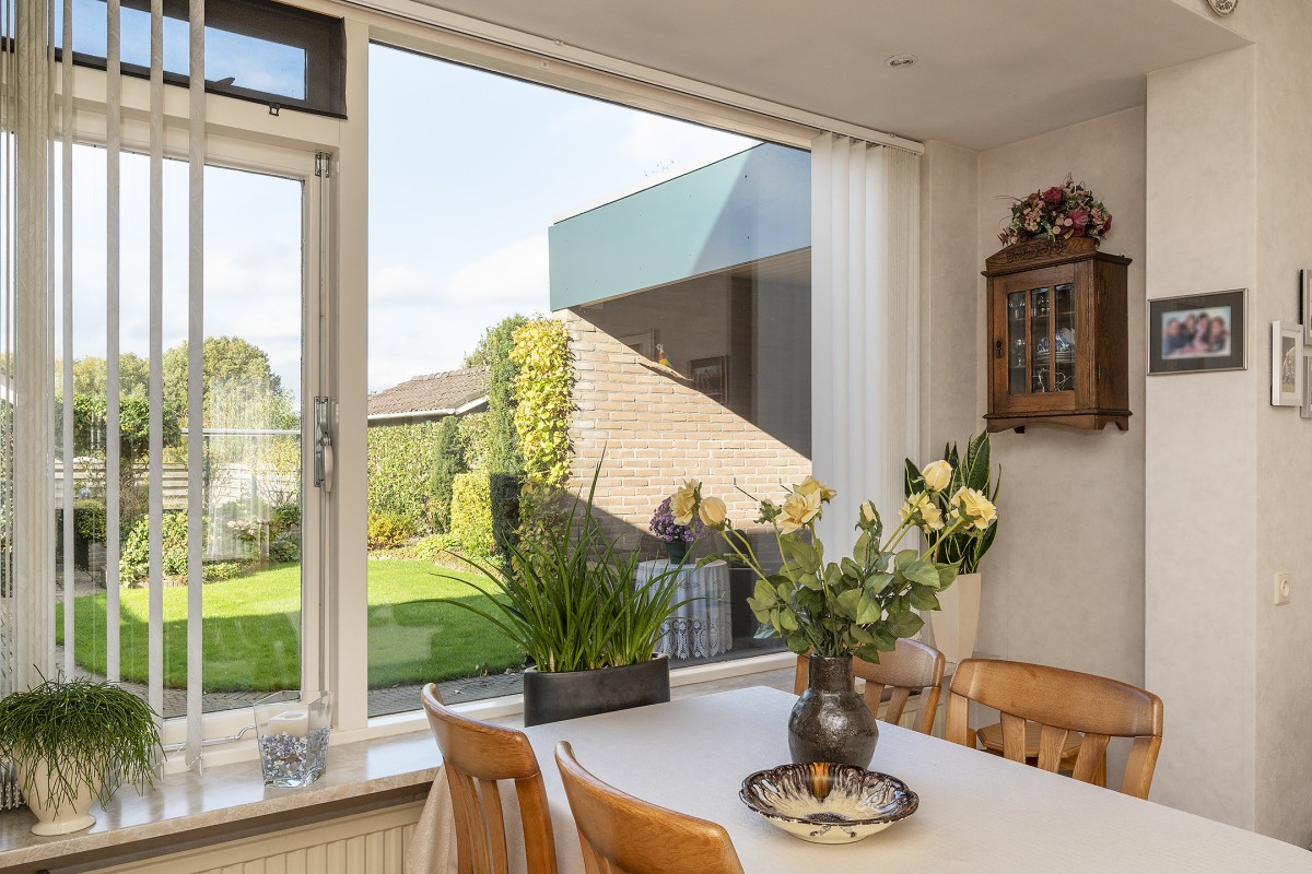 De woonkamer met uitbouw aan de achterzijde is L-vormig. Waar ooit de keuken was gesitueerd is bij de woonkamer getrokken. De keuken heeft een nieuwe plaats gekregen, namelijk in de riante uitbouw aan de achterzijde.