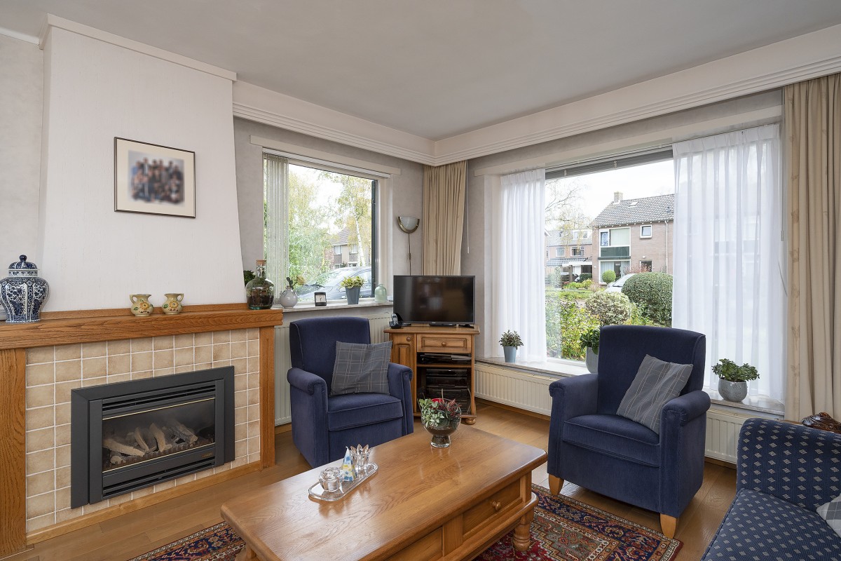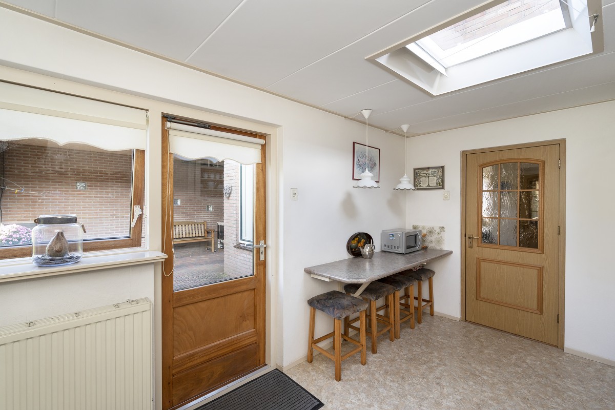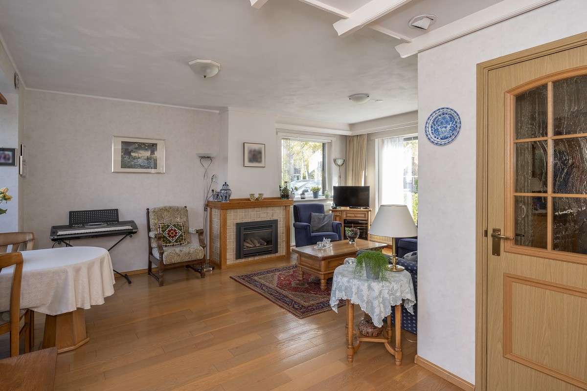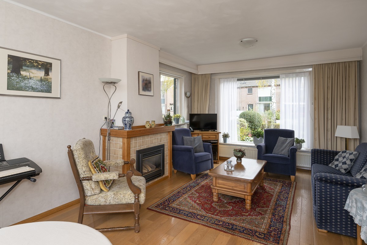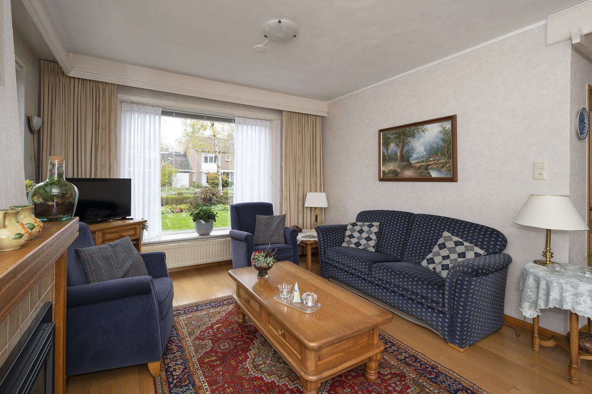 De woonkamer met uitbouw aan de achterzijde is L-vormig. Waar ooit de keuken was gesitueerd is bij de woonkamer getrokken. De keuken heeft een nieuwe plaats gekregen, namelijk in de riante uitbouw aan de achterzijde.