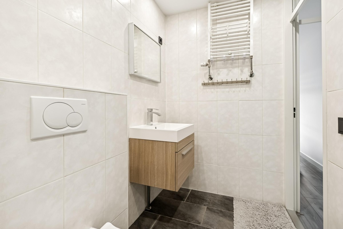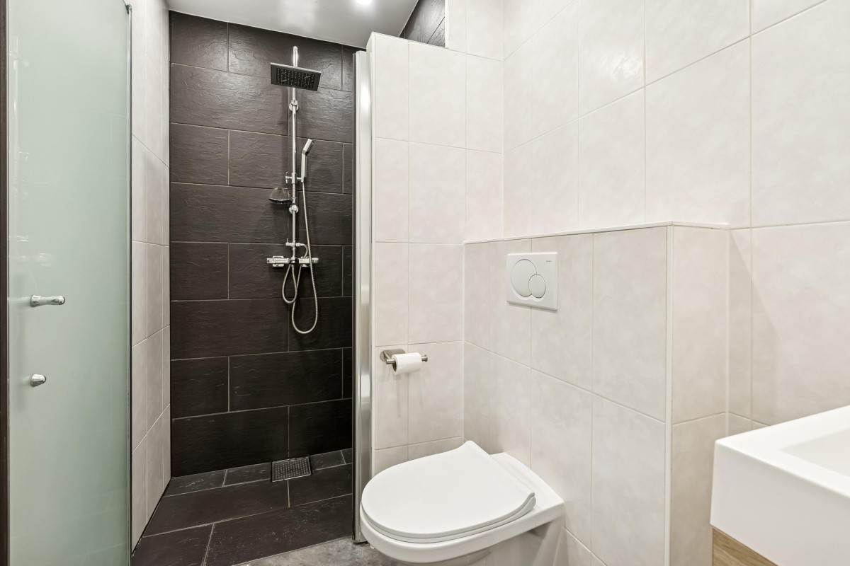 De badkamer is voorzien van een inloopdouche, toilet, wastafel en wastafelmeubel.