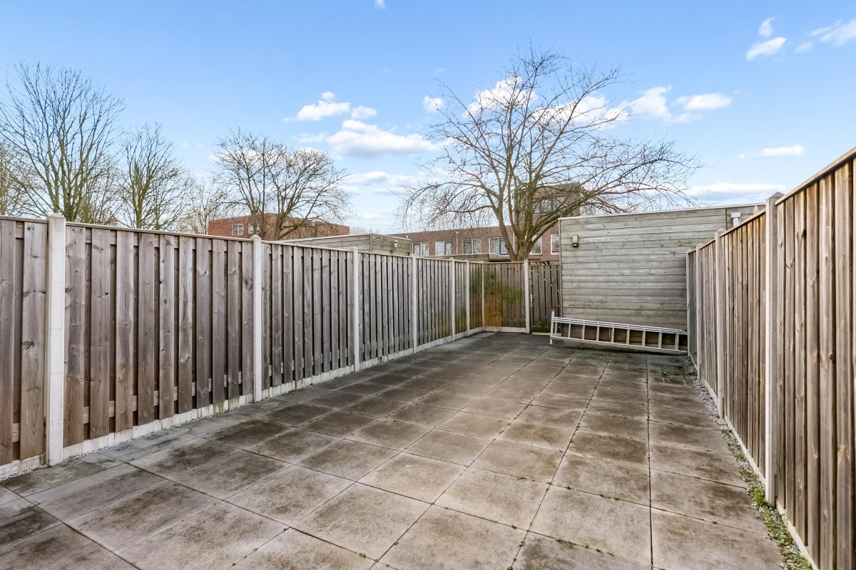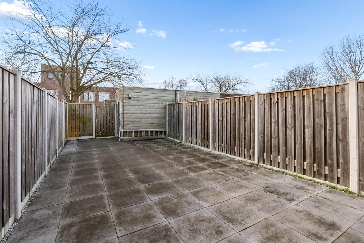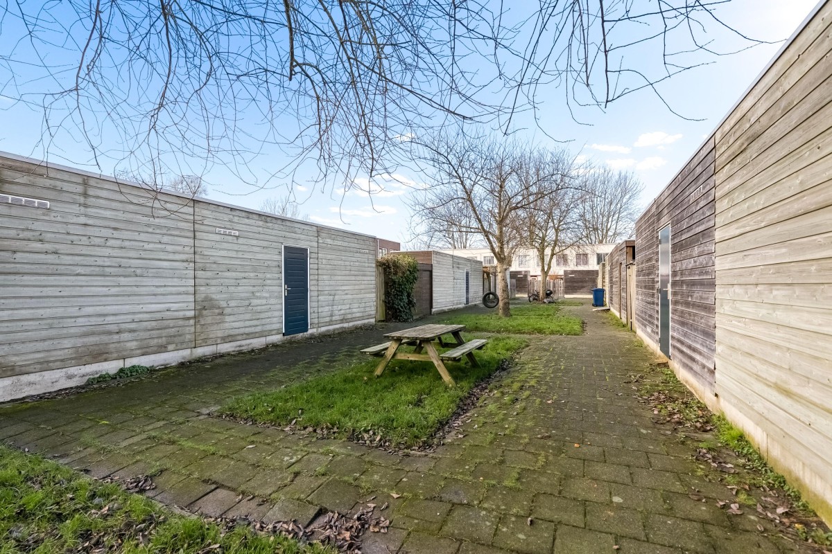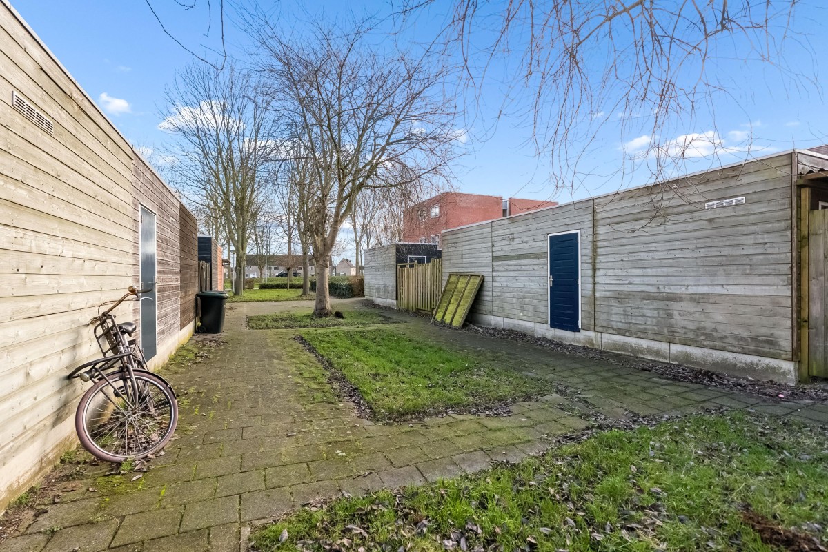De woning beschikt over een voortuin en een achtertuin. De achtertuin ligt gunstig op het zuidwesten, waardoor je hier in de zomer veel zon hebt. Achterin de tuin staat een vrijstaande houten berging met elektra en er is een achterom aanwezig.