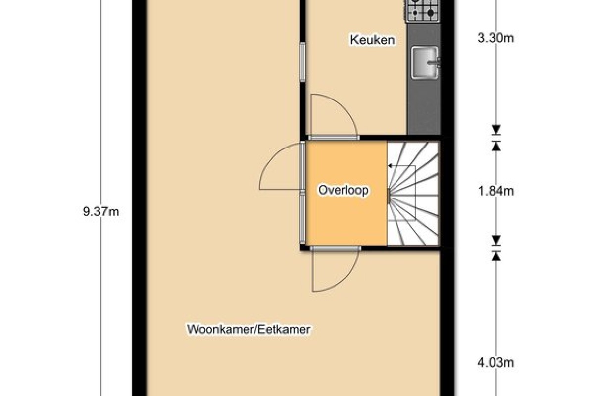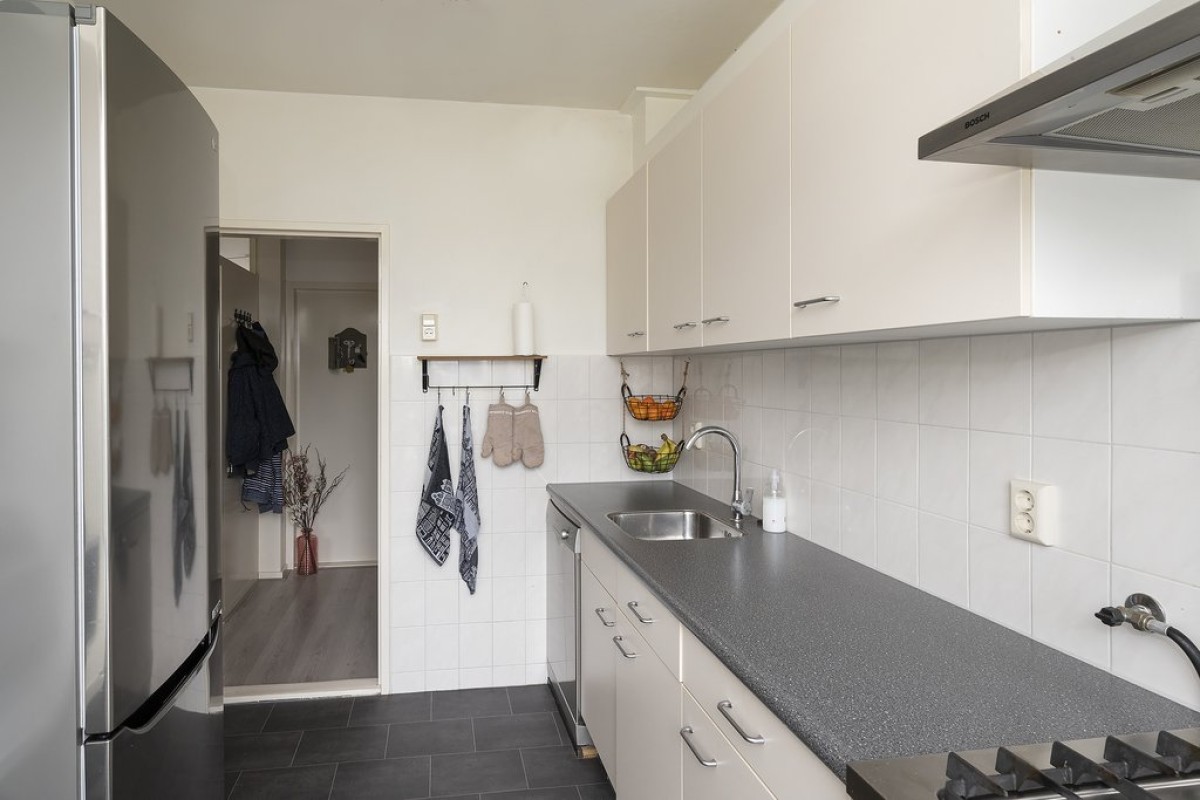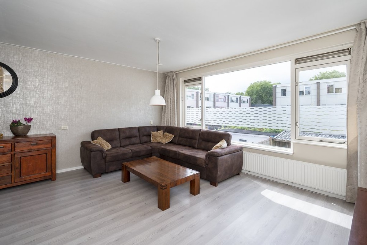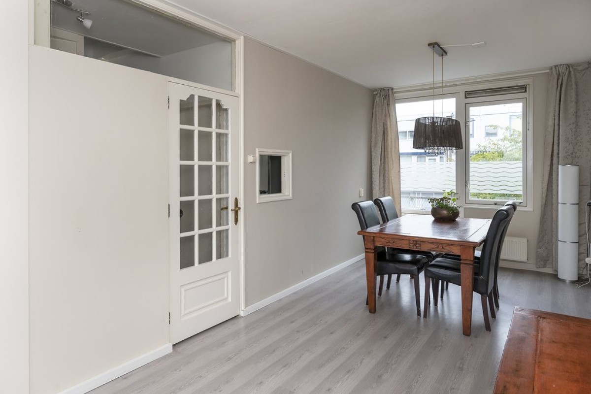 Overloop met toegang tot de woonkamer en keuken. De royale woonkamer (circa 35 m2) beschikt over voldoende ruimte voor een grote eetkamertafel. De grote raampartijen zorgen voor veel lichtinval en hebben een vrij uitzicht over een groenstrook of de achtertuin. De keuken is voorzien van een keukeninrichting in een neutrale kleurstelling. Vanuit de keuken is er toegang tot een balkon over de volle breedte van het woonhuis.