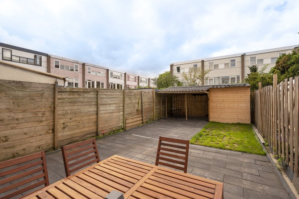 De diepe achtertuin (circa 10 m diep) is speels aangelegd.