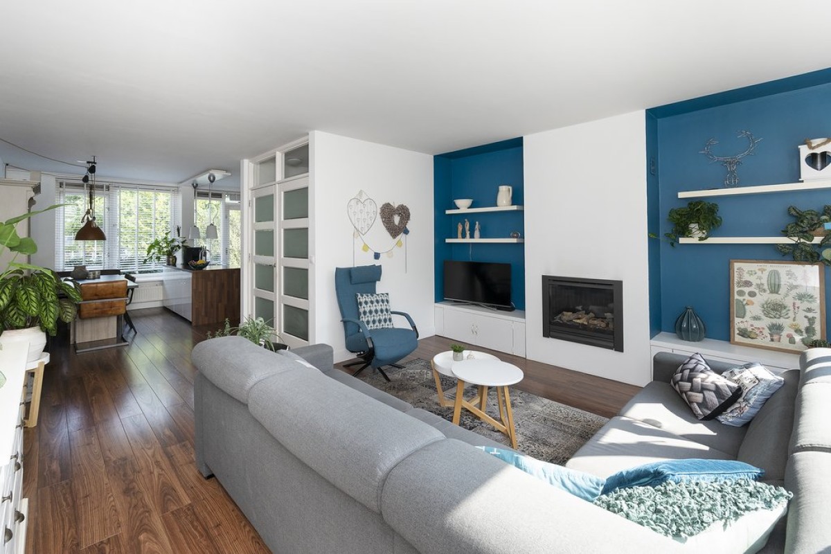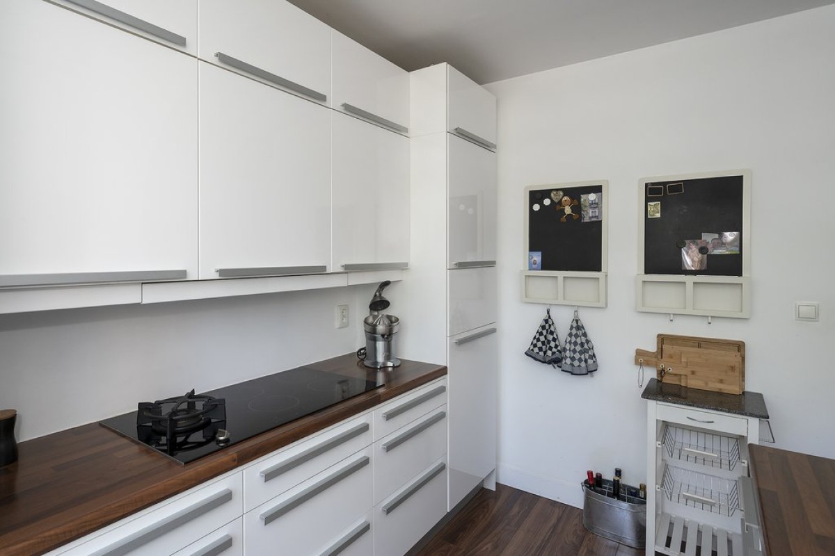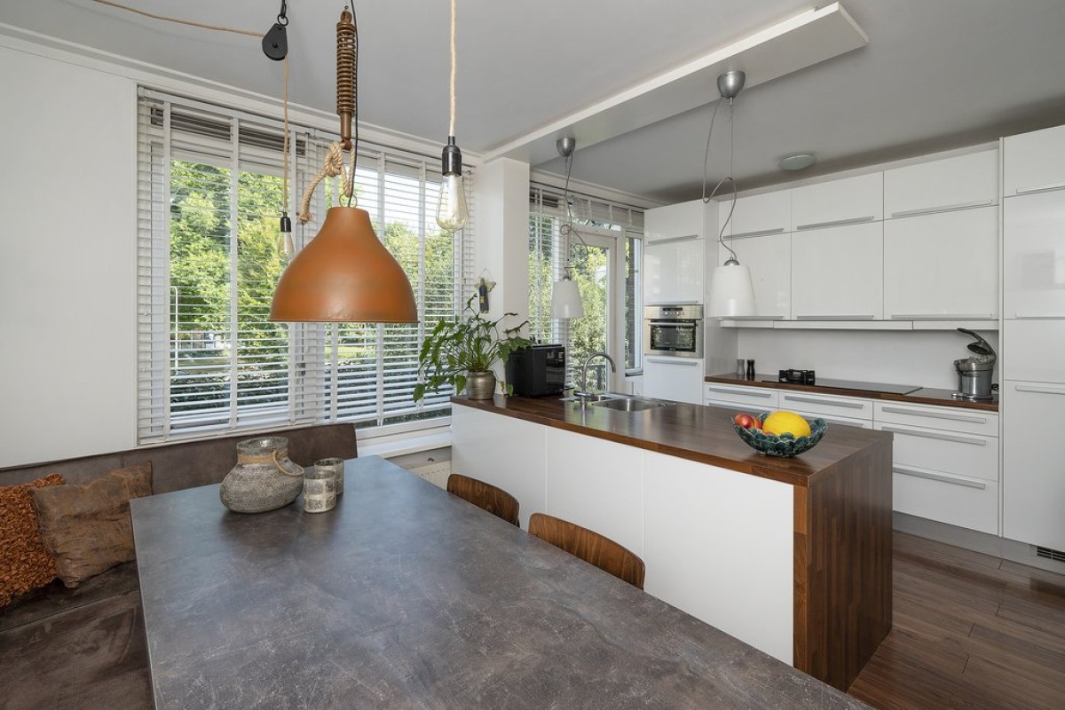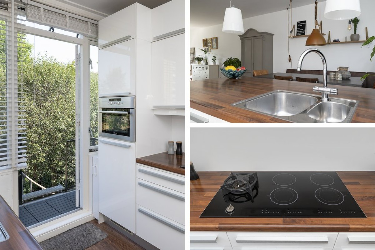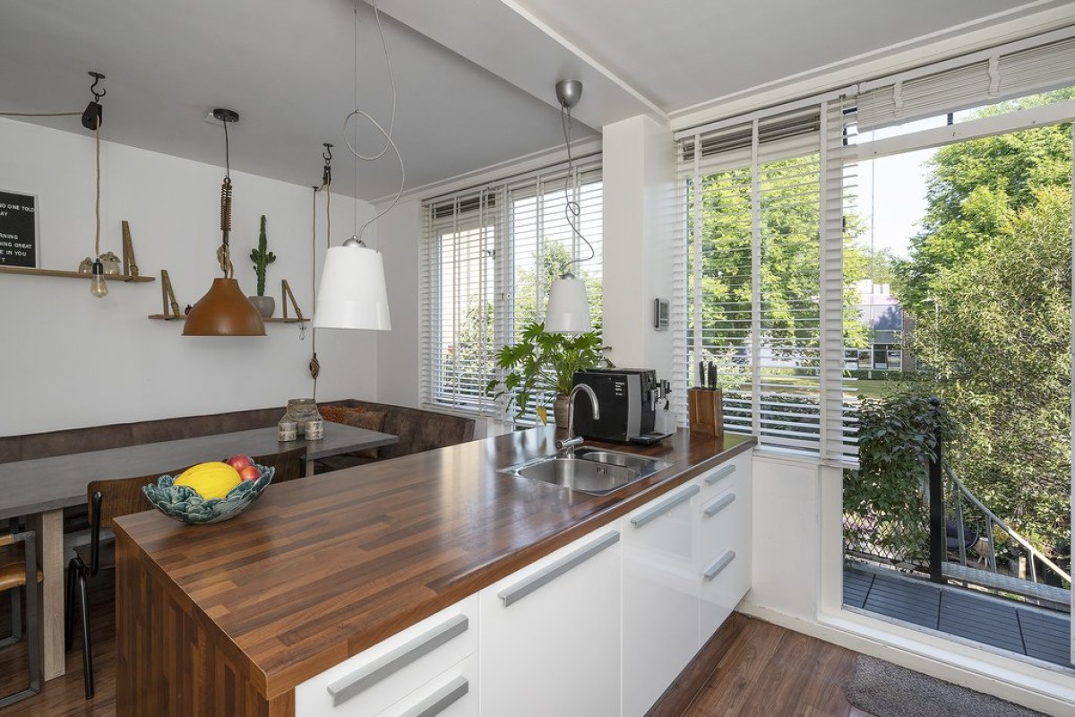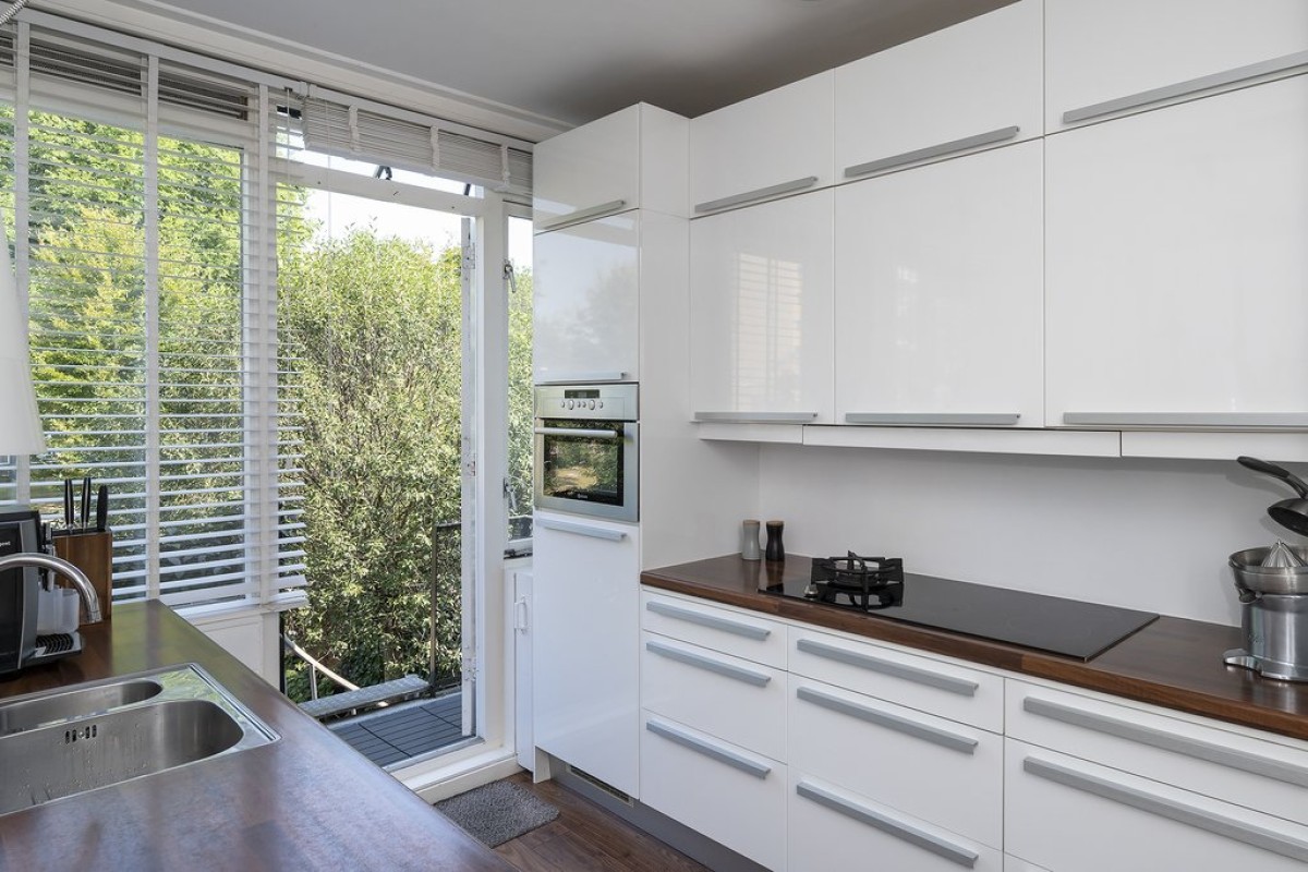 Overloop, royale open keuken met kookeiland welke is voorzien van inbouwapparatuur. Vanuit de keuken is het balkon aan de achterzijde van de woning bereikbaar. Via het balkon is de tuin middels een stalen trap ook bereikbaar. De royale L-vormige woonkamer met gashaard is keurig afgewerkt en biedt fraai uitzicht.