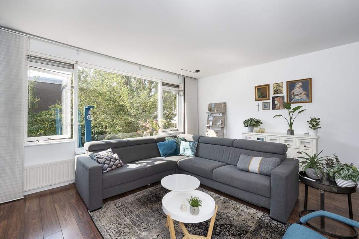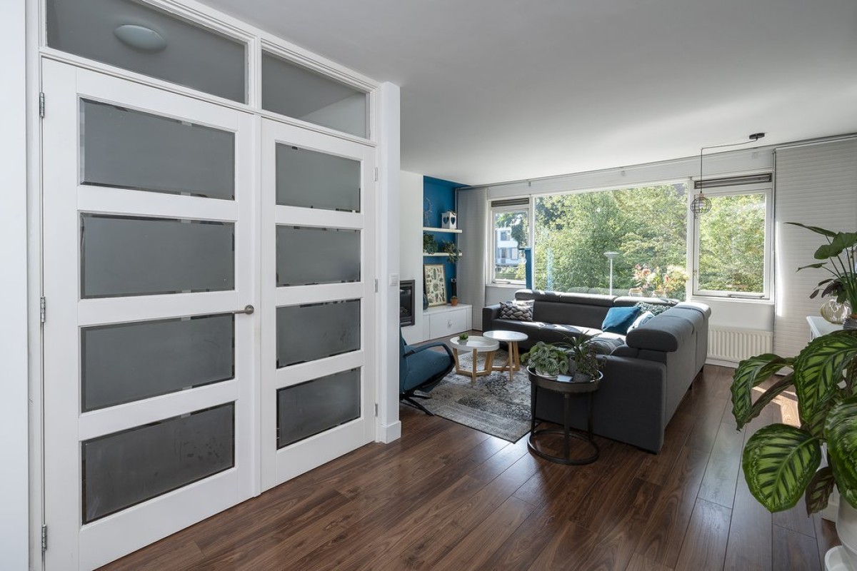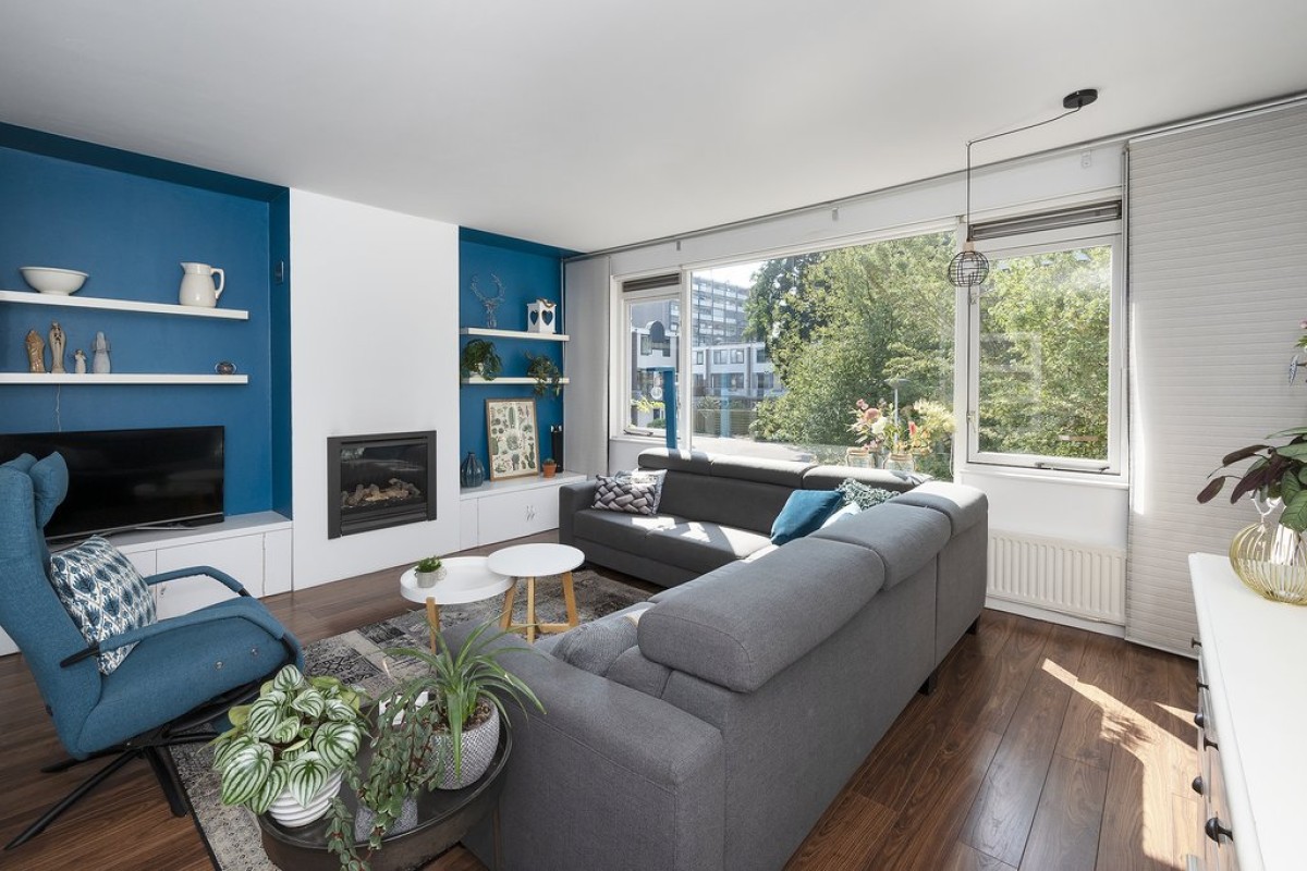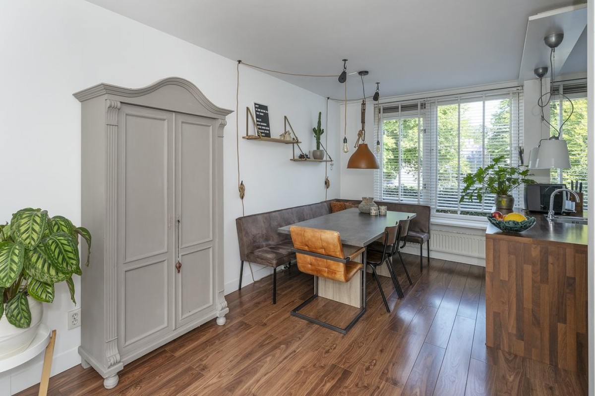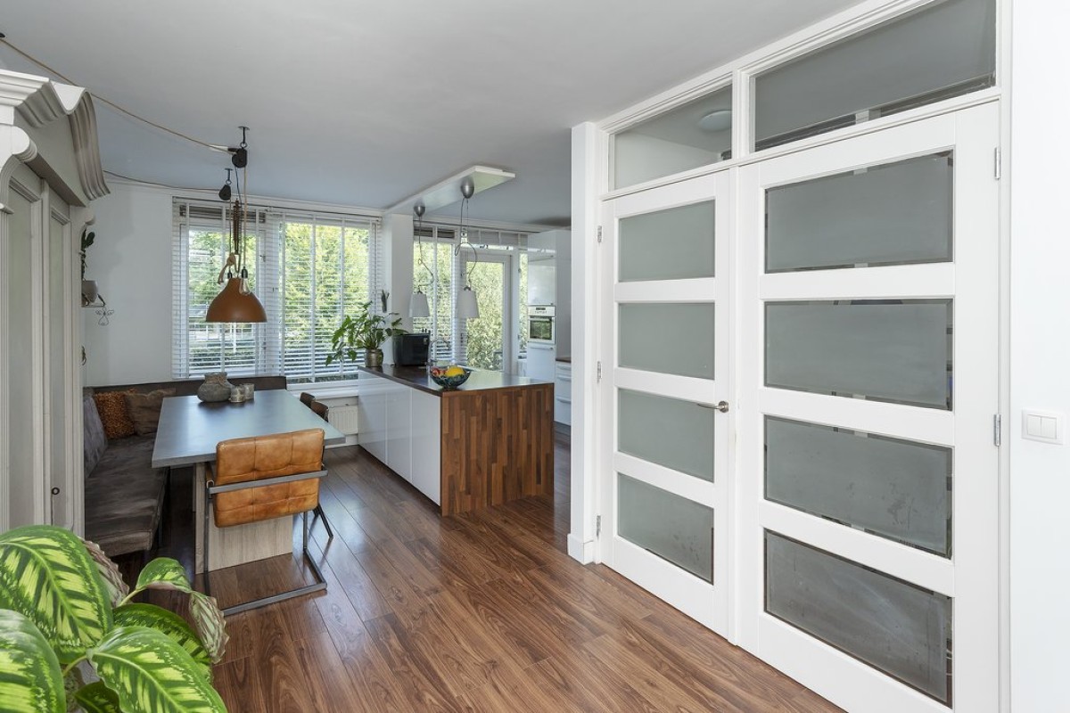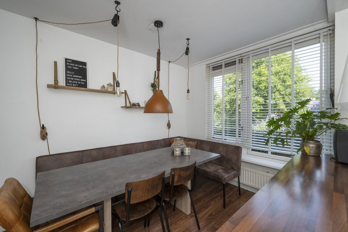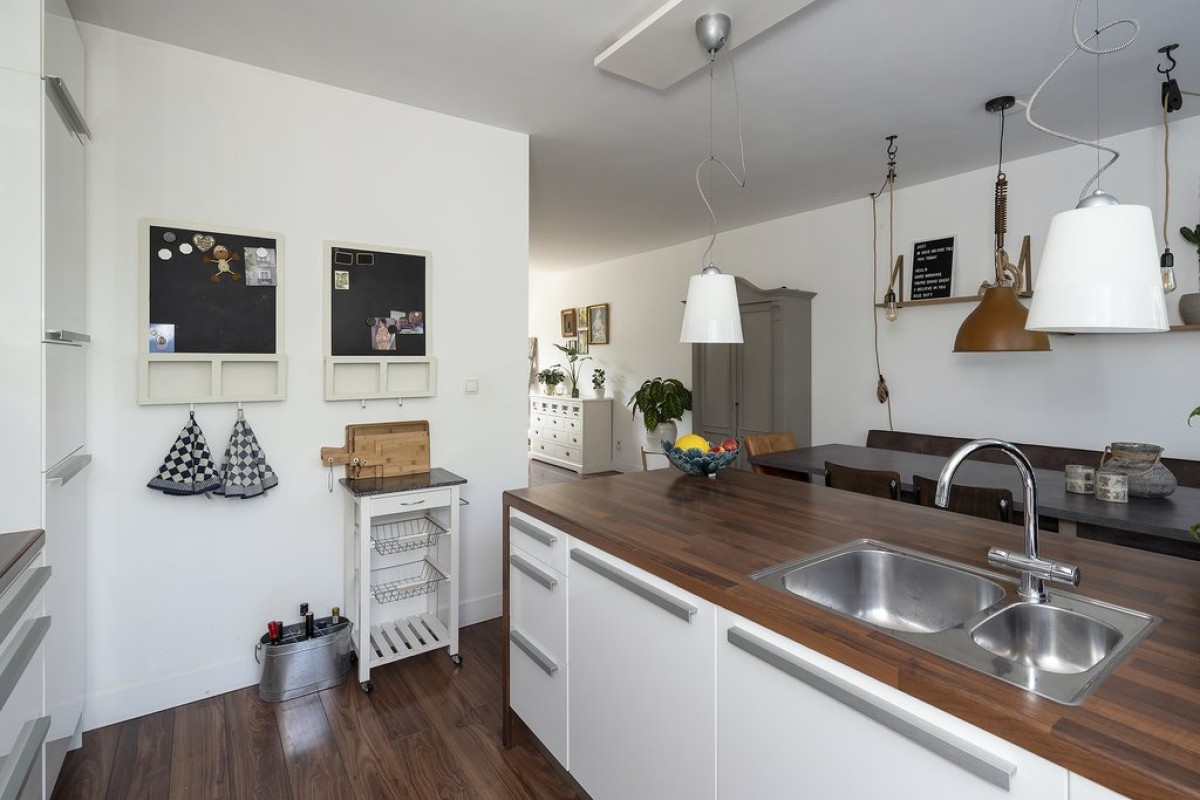 Overloop, royale open keuken met kookeiland welke is voorzien van inbouwapparatuur. Vanuit de keuken is het balkon aan de achterzijde van de woning bereikbaar. Via het balkon is de tuin middels een stalen trap ook bereikbaar. De royale L-vormige woonkamer met gashaard is keurig afgewerkt en biedt fraai uitzicht.