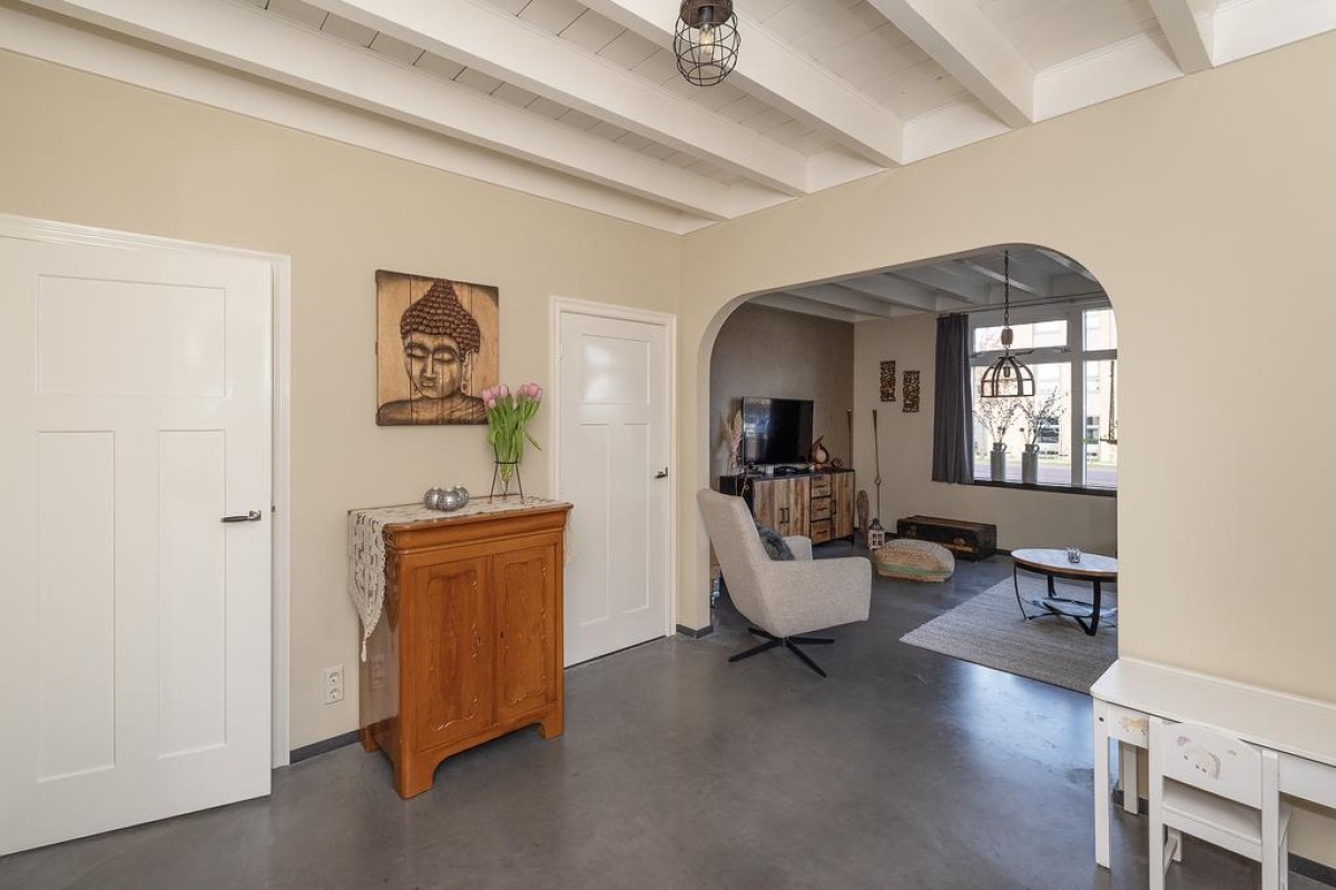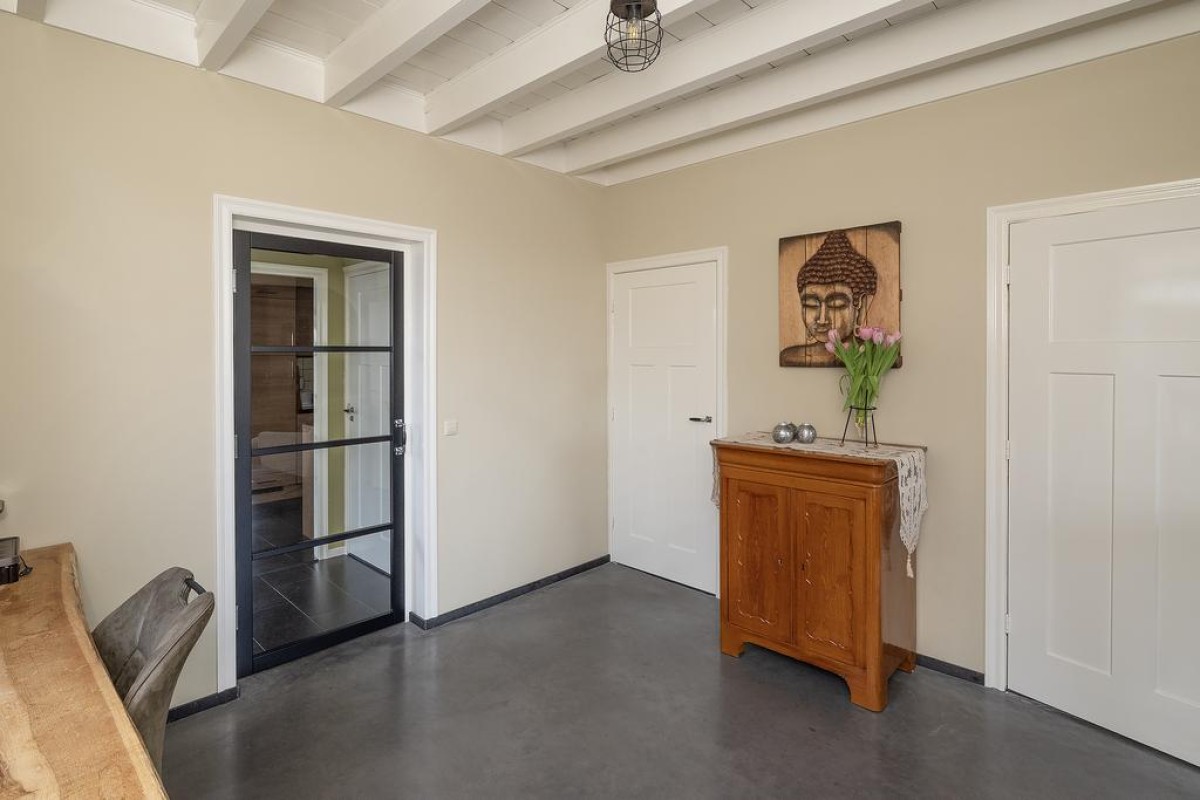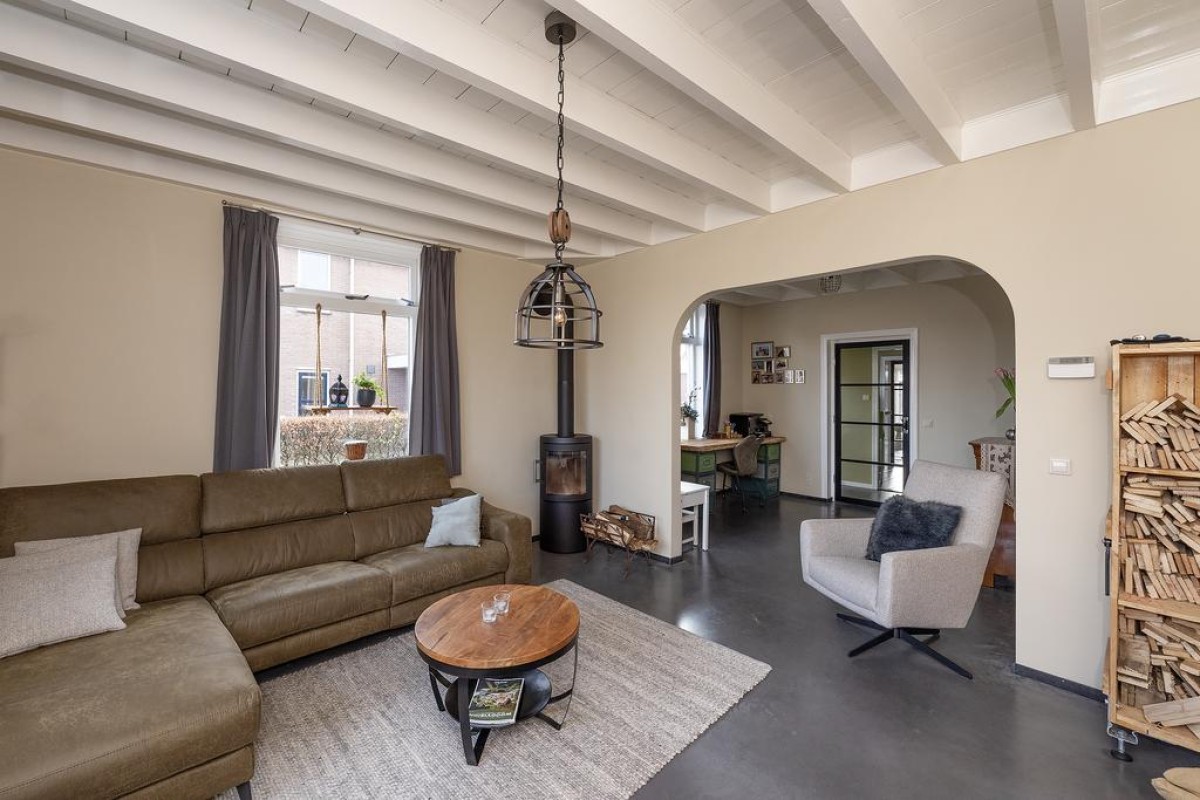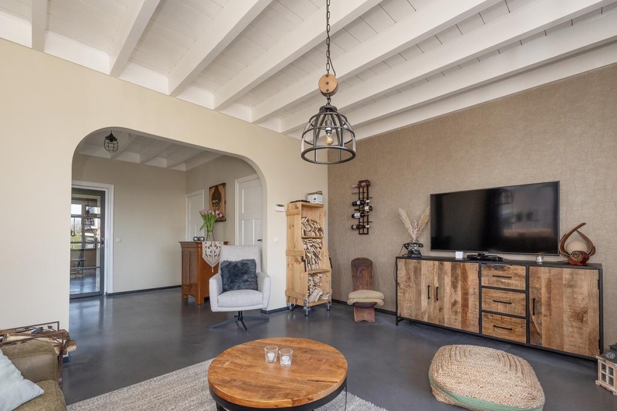 Middels de voordeur kom je in de hal met toegang tot de woonkeuken aan de linkerzijde (waarover later meer) en de woonkamer aan de rechterzijde. De royale en lichte woonkamer is aan de voorzijde gesitueerd en in 2022 volledig gerenoveerd. De grote raampartijen bieden een prettig uitzicht over de Voorsterweg. De hypermoderne elektronisch geregelde houtkachel (2022) en het mooie balkenplafond zorgen voor warmte en gezelligheid. De industriële gepolijste betonvloer is voorzien van vloerverwarming en is zeer onderhoudsvriendelijk. Vanuit de tussenhal is de trapopgang naar de verdieping, in deze tussenhal is tevens een aparte doucheruimte aanwezig.