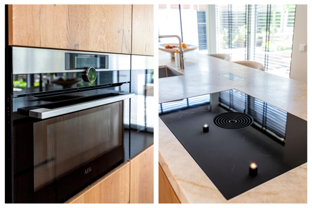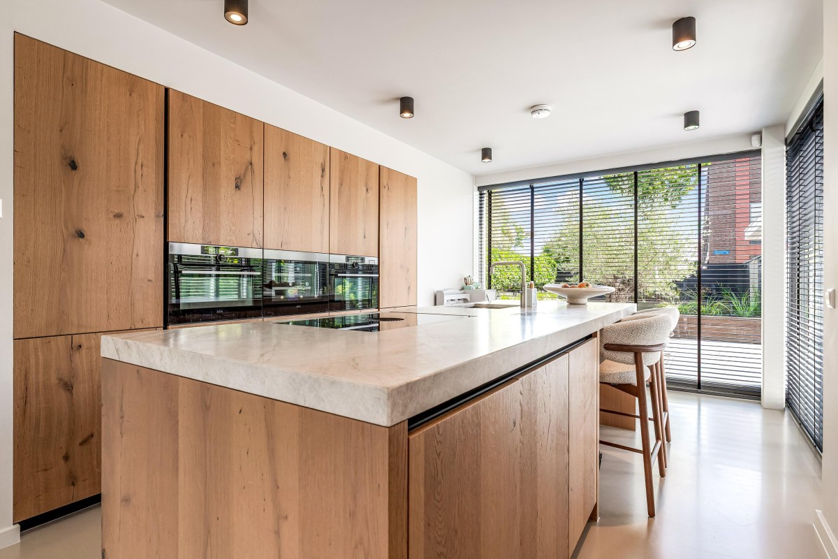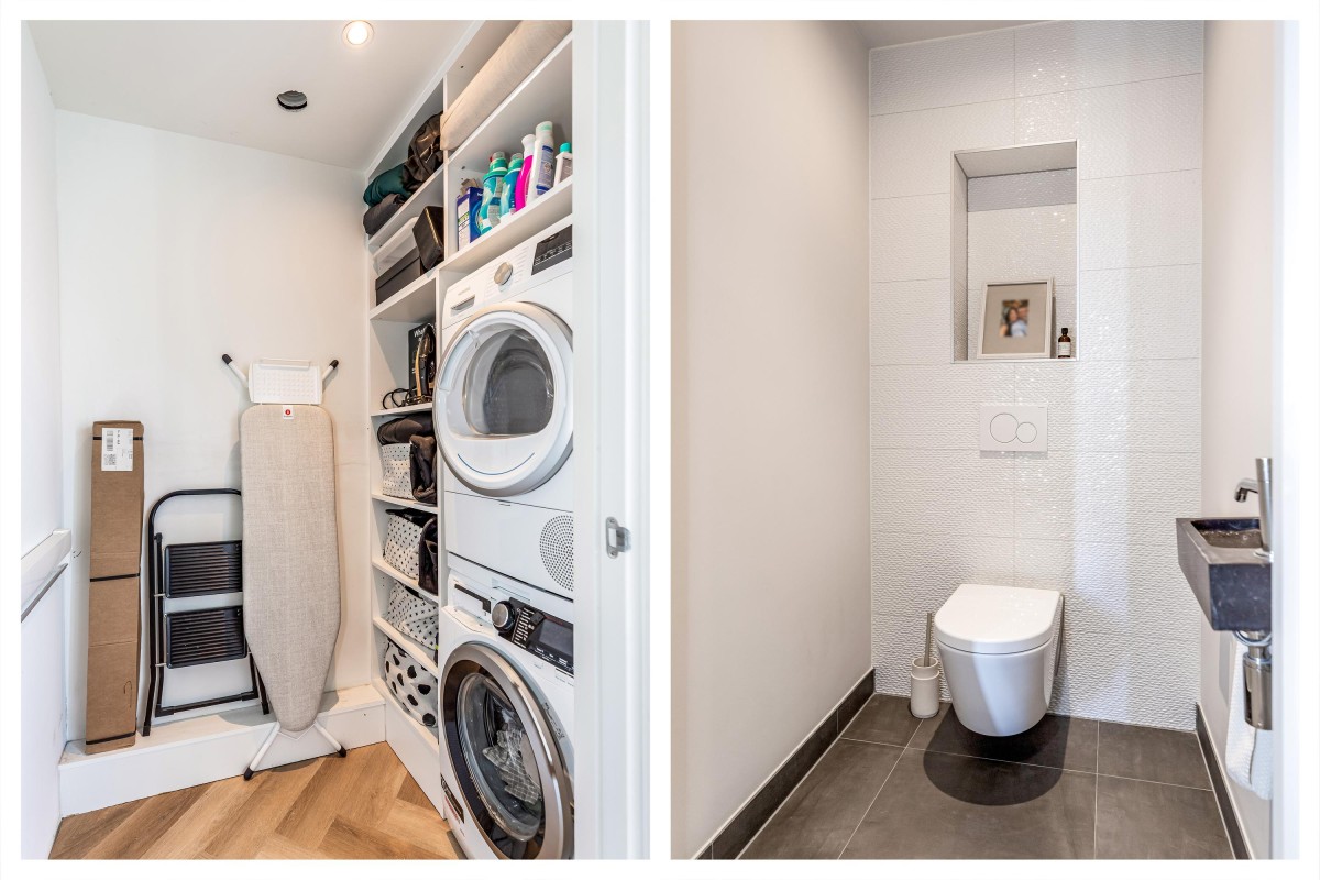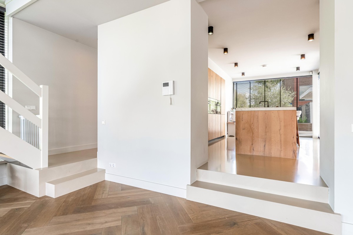 Via de ruime en zonnige voortuin bereikt u de entree. Hal met meterkast, toilet en toegang tot de ruime woonkamer. De keuken ligt op een hoger niveau dan de woonkamer. De plafondhoogte van drie meter geeft de woonkamer een exclusief karakter. De luxe keuken is voorzien van eikenhouten fronten, een kook-/spoeleiland en een ruime kastenwand. De keuken is uitgerust met diverse inbouwapparaten, te weten: vaatwasser, magnetron, oven, wijnkoeling, Quooker, koelkast, vriezer en een Bora-kookplaat met geïntegreerde afzuiging. Zowel de keuken als de hal zijn voorzien van comfortabele vloerverwarming. De living is zeer riant en beschikt over een visgraat parketvloer, convectorput en grote schuifpuien naar de voortuin en het terras aan de achterzijde van de woning.