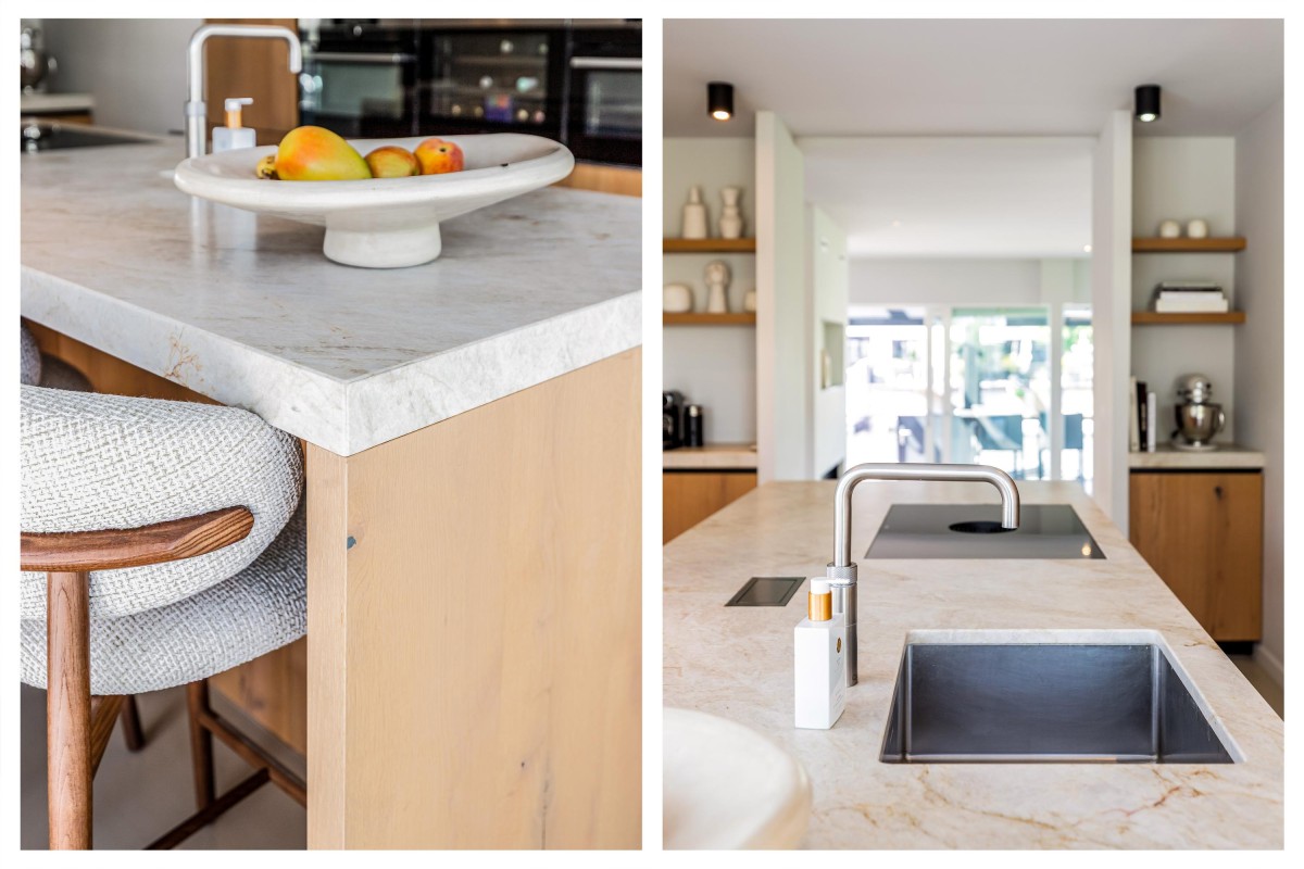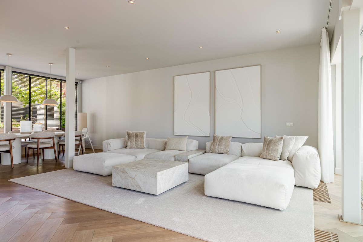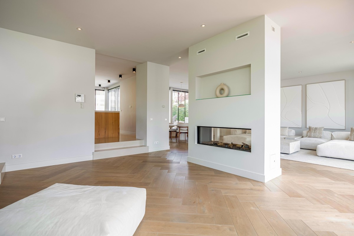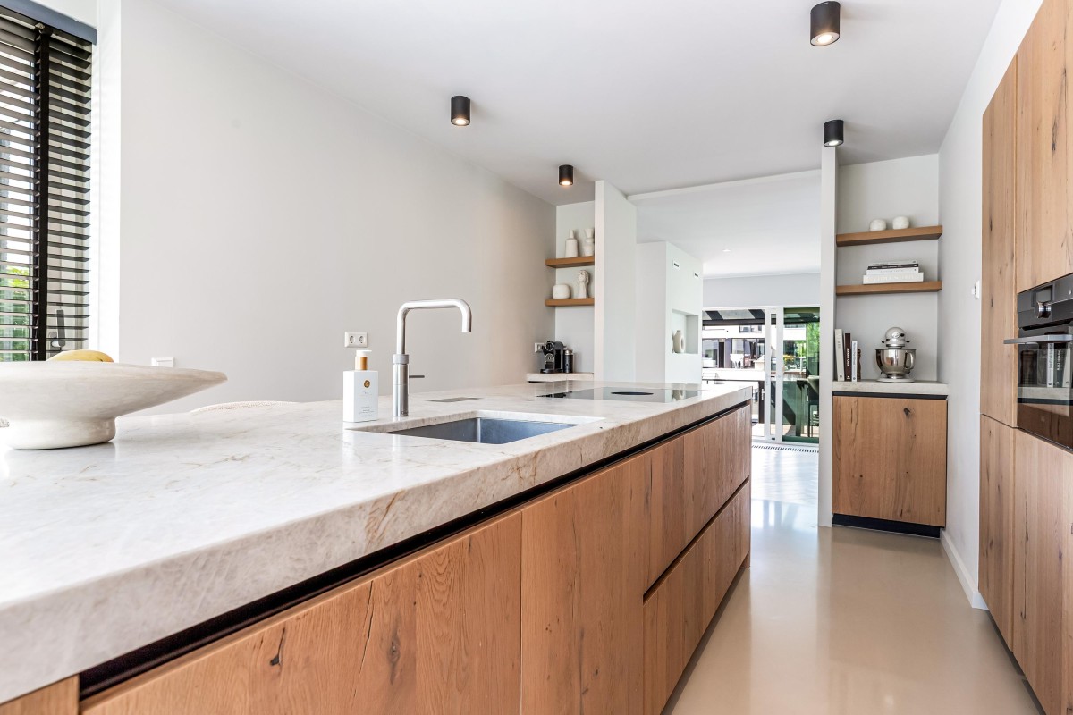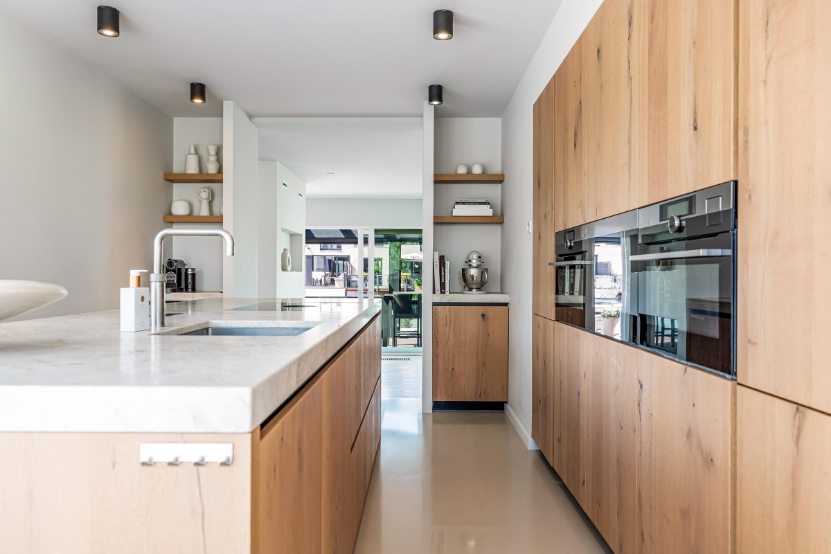 Via de ruime en zonnige voortuin bereikt u de entree. Hal met meterkast, toilet en toegang tot de ruime woonkamer. De keuken ligt op een hoger niveau dan de woonkamer. De plafondhoogte van drie meter geeft de woonkamer een exclusief karakter. De luxe keuken is voorzien van eikenhouten fronten, een kook-/spoeleiland en een ruime kastenwand. De keuken is uitgerust met diverse inbouwapparaten, te weten: vaatwasser, magnetron, oven, wijnkoeling, Quooker, koelkast, vriezer en een Bora-kookplaat met geïntegreerde afzuiging. Zowel de keuken als de hal zijn voorzien van comfortabele vloerverwarming. De living is zeer riant en beschikt over een visgraat parketvloer, convectorput en grote schuifpuien naar de voortuin en het terras aan de achterzijde van de woning.