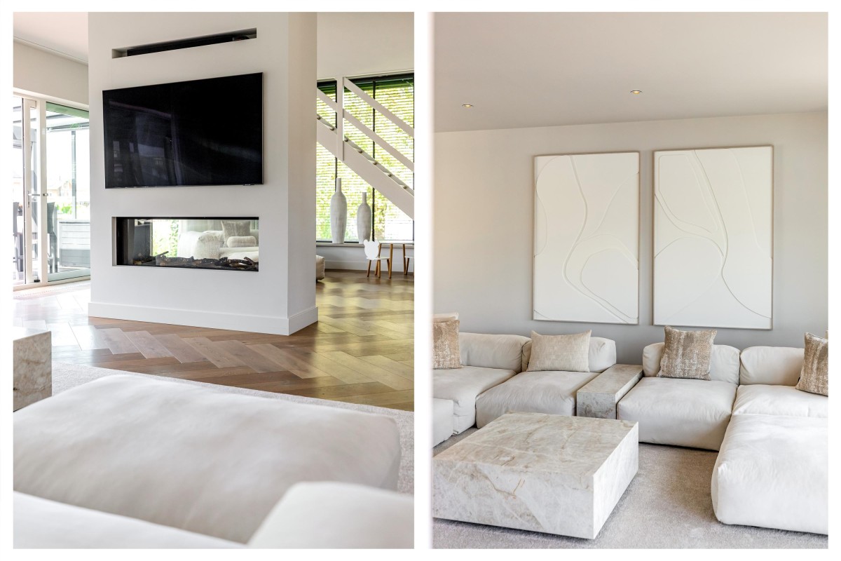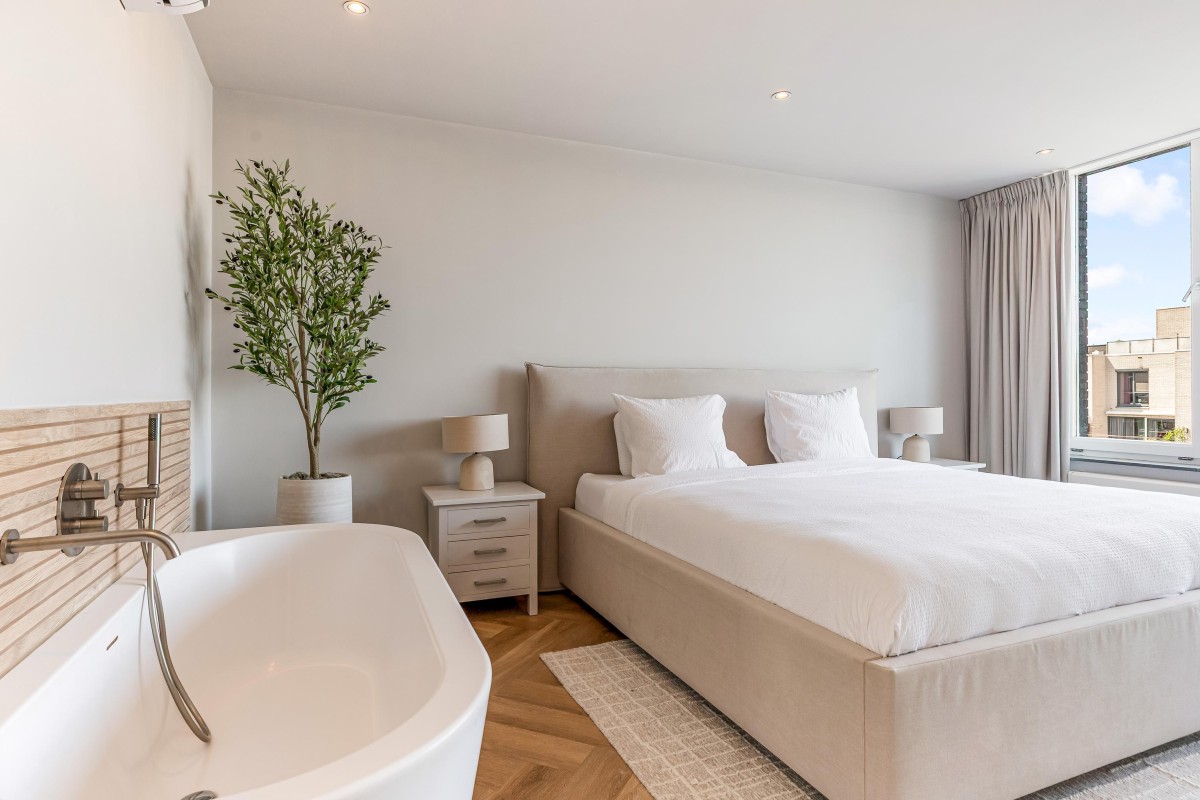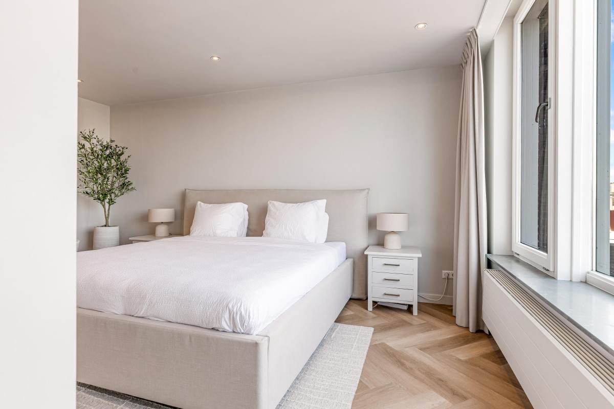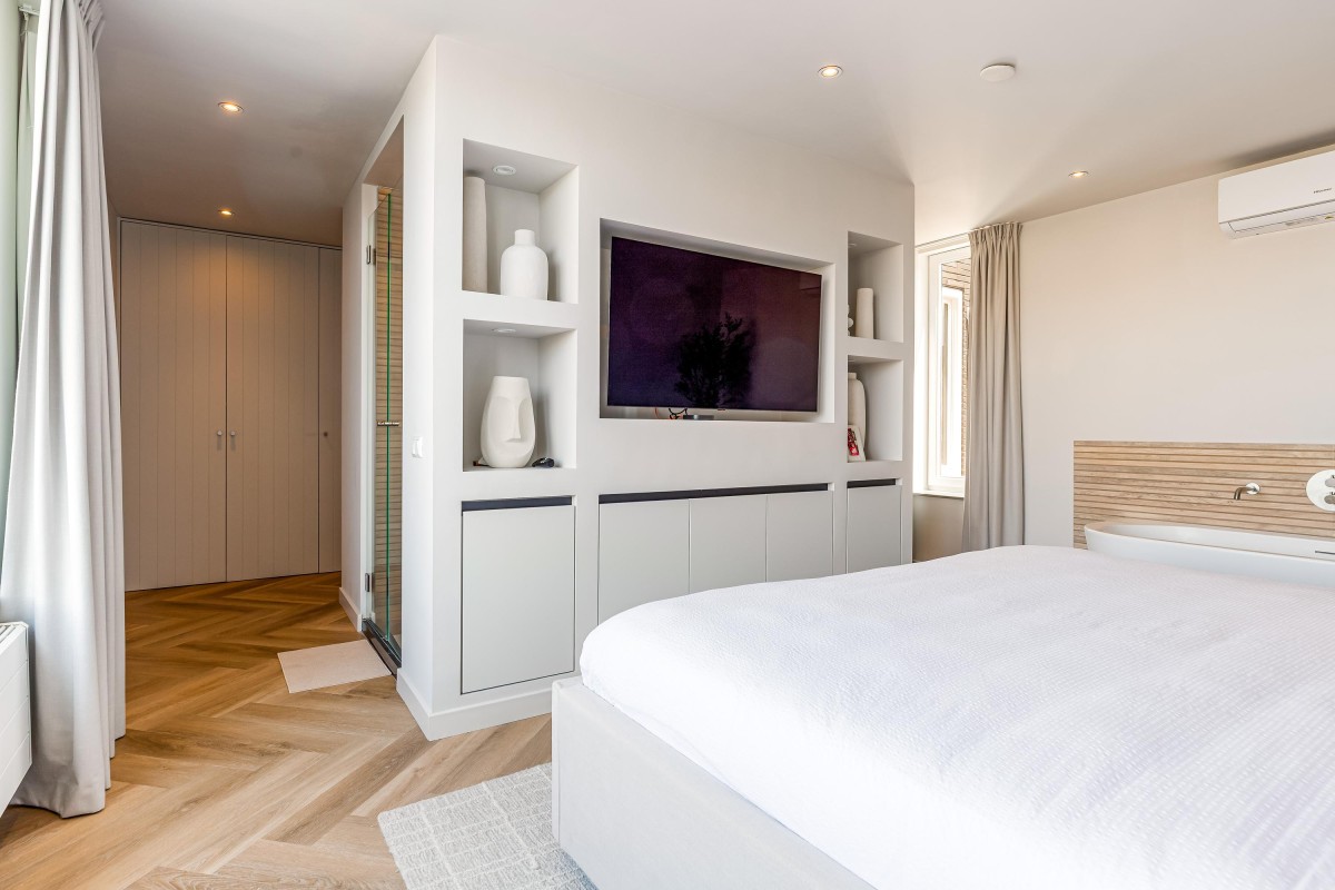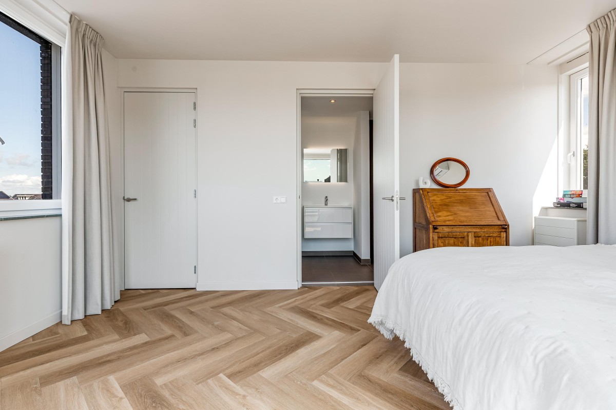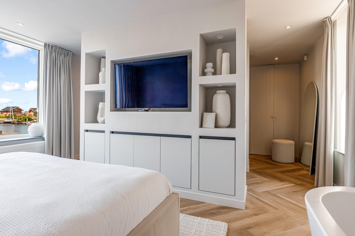 Overloop met daglicht en toegang tot twee ruime slaapkamers, elk met een eigen badkamer. De luxueuze hoofdslaapkamer biedt een echte hotelbeleving. Deze kamer beschikt over meerdere op maat gemaakte inbouwkasten, een toilet, inloopdouche, wastafelmeubel, vrijstaand ligbad, cinewall en – als kers op de taart – een raam met een fantastisch uitzicht over de Noorderplassen. De tweede slaapkamer ligt aan de voorzijde en is eveneens voorzien van een eigen badkamer met toilet, inloopdouche en wastafelmeubel. De volledige vloer op de eerste verdieping is afgewerkt met een hoogwaardige pvc-vloer. Beide slaapkamers zijn bovendien voorzien van een airco-unit.