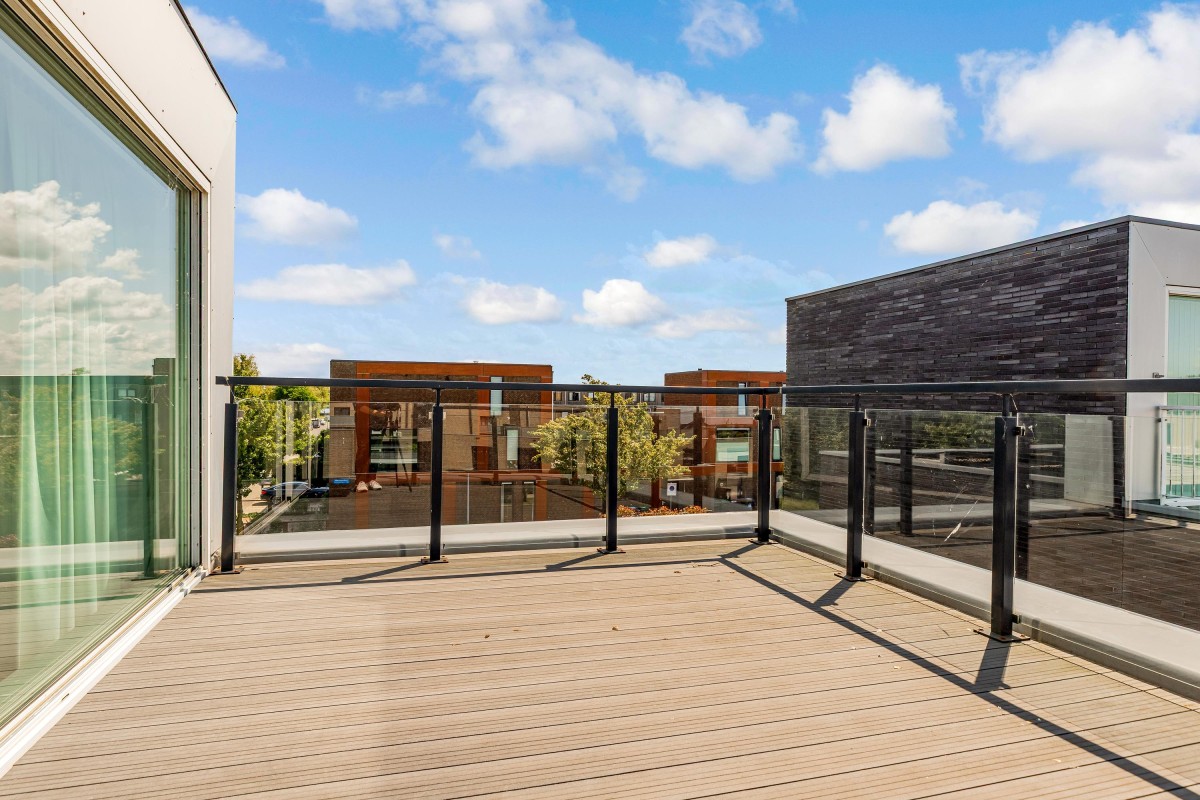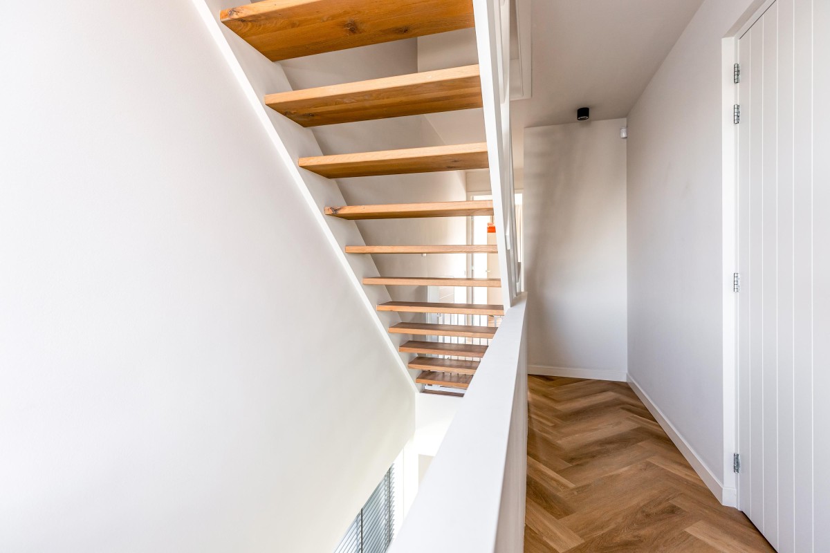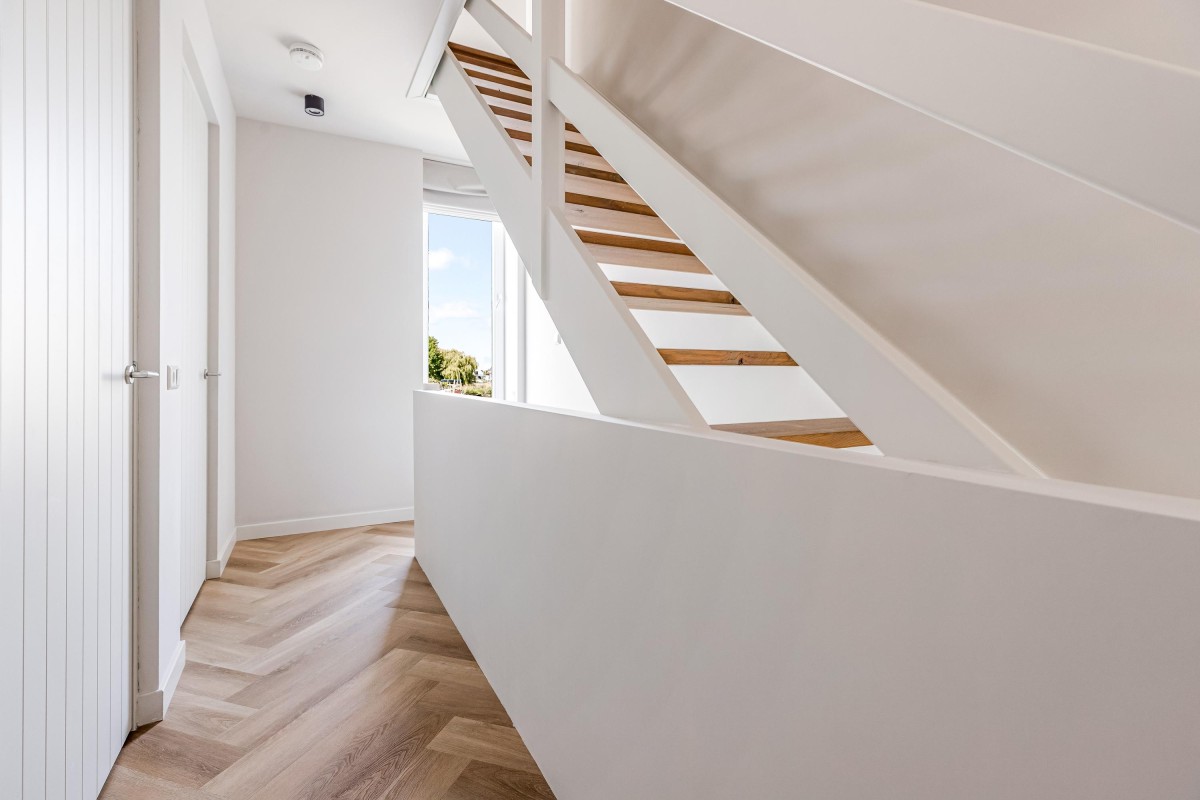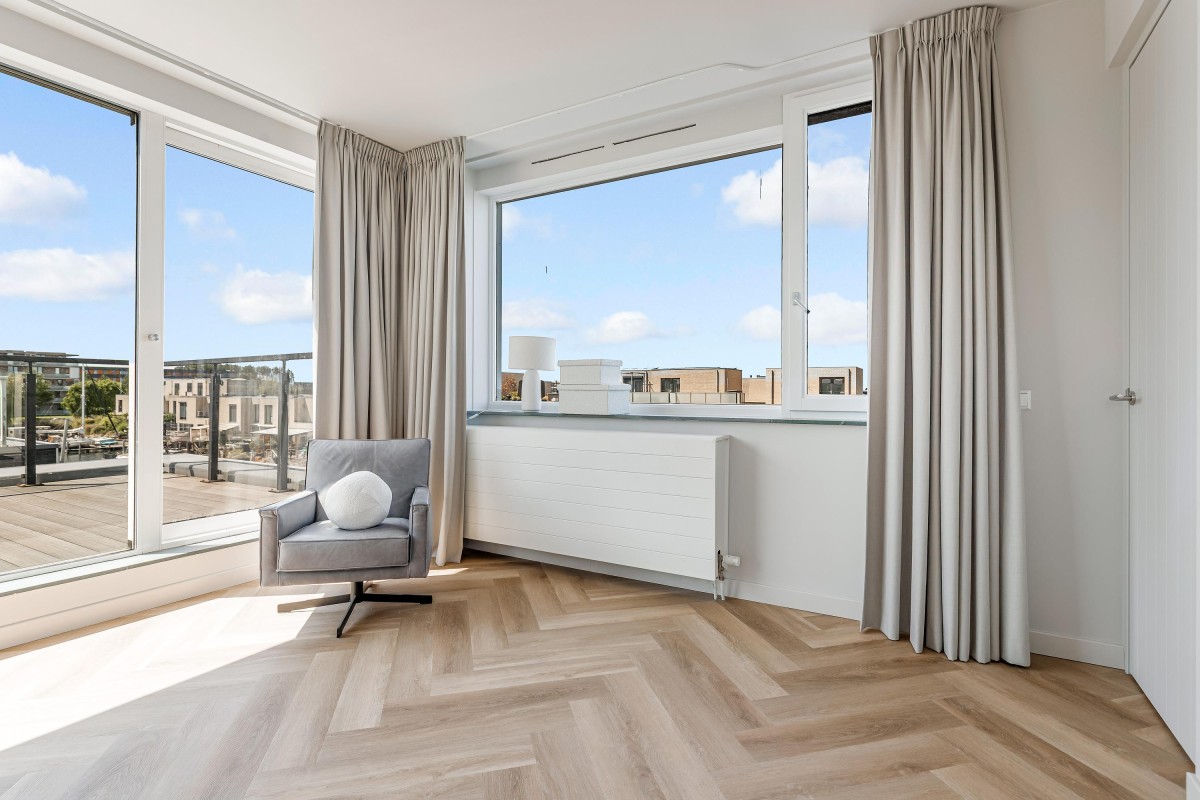 Overloop met toegang tot de derde slaapkamer, ook met eigen badkamer. Deze badkamer beschikt over een inloopdouche, wastafelmeubel en toilet. De kamer heeft via een grote schuifpui toegang tot een (onofficieel) dakterras met prachtig uitzicht over de Noorderplassen. Ook deze kamer is voorzien van een airco-unit en een hoogwaardige pvc-vloer.