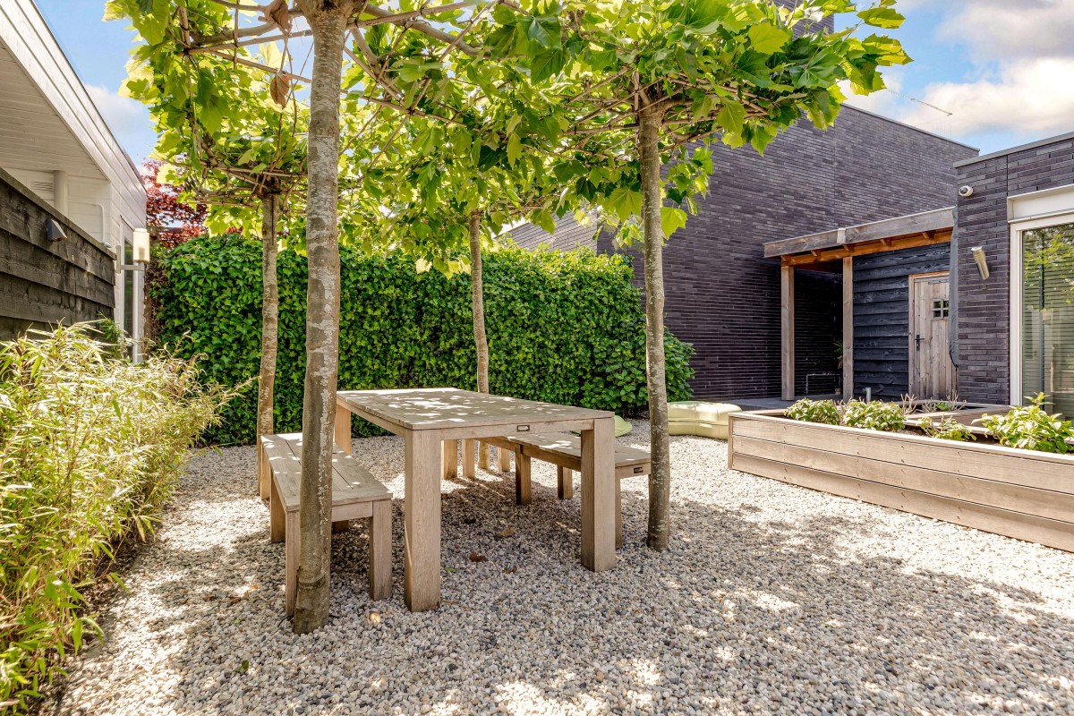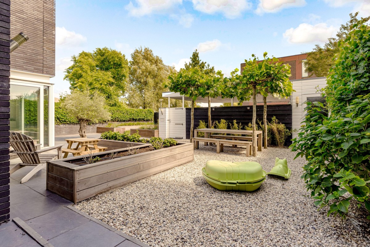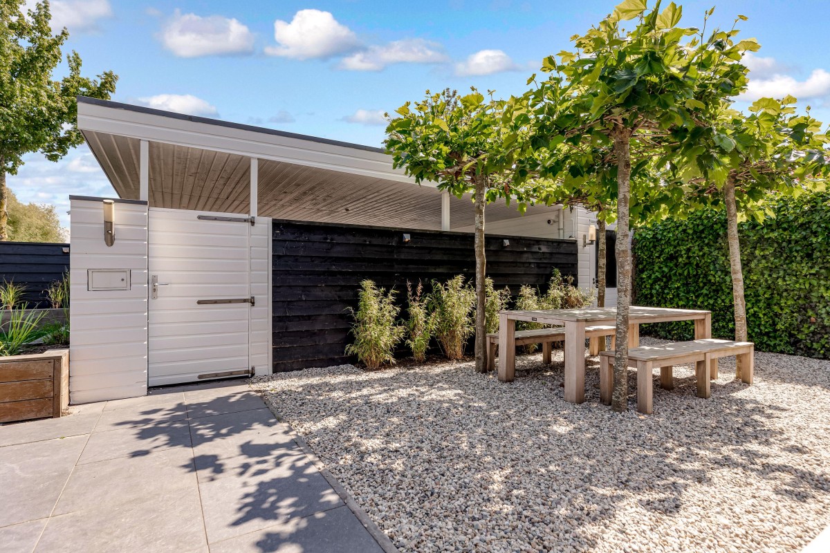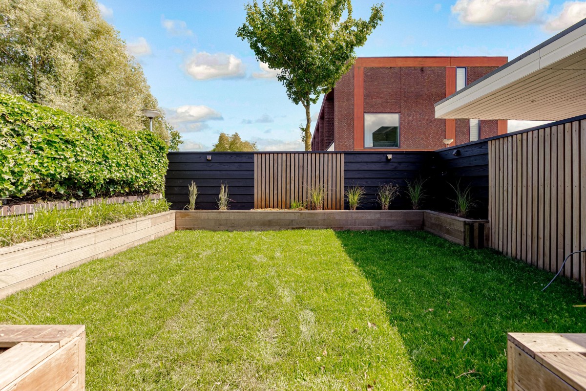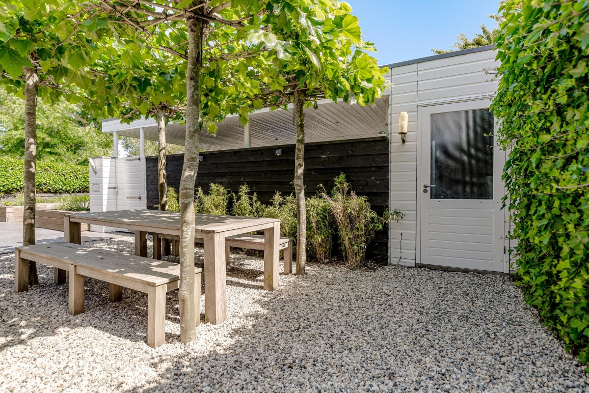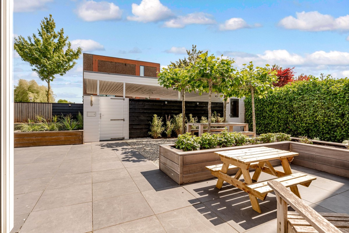 Lees verderDe fraai aangelegde voortuin is voorzien van een zonneterras, gazon, twee aparte bergingen en een carport.