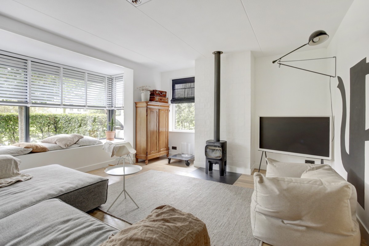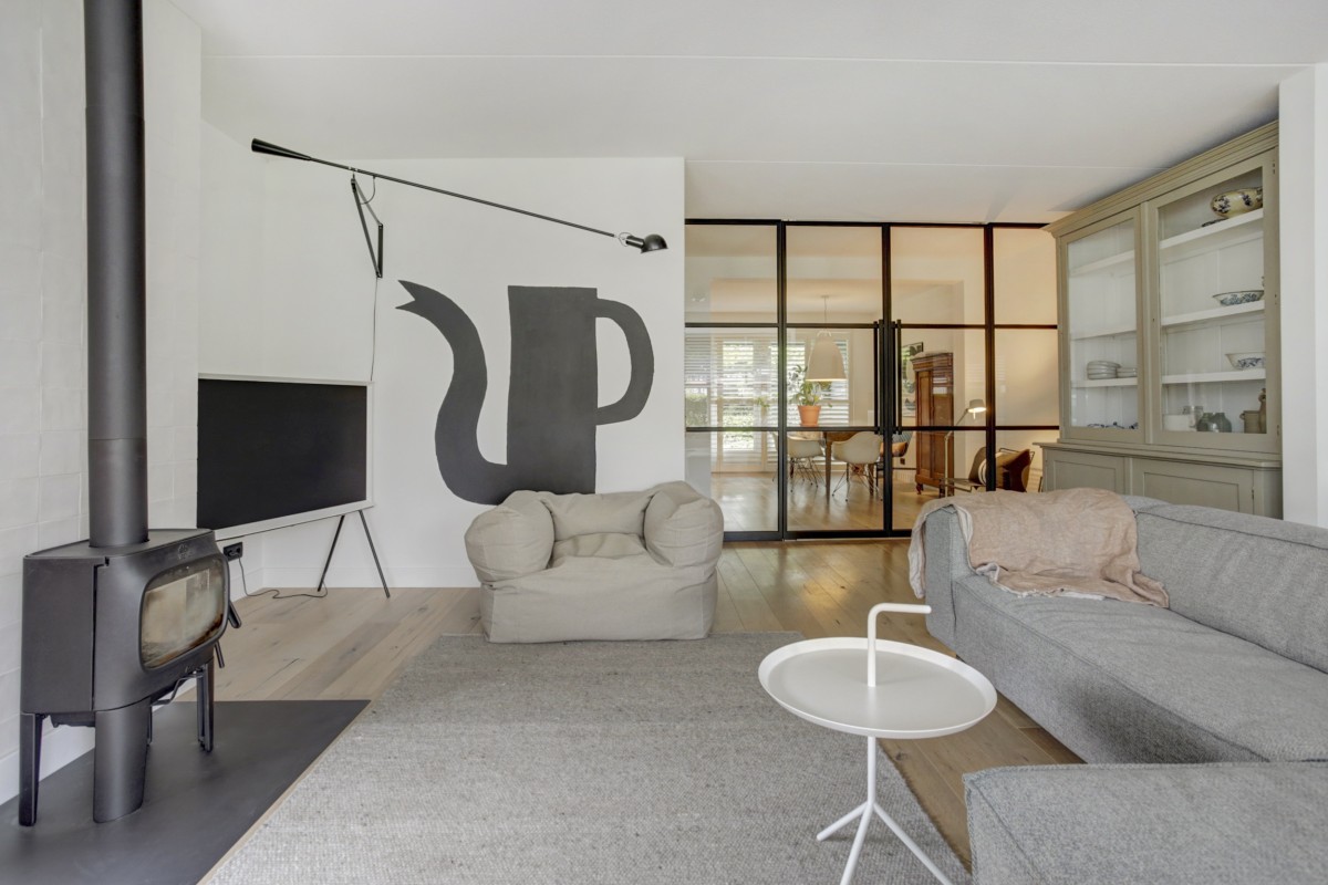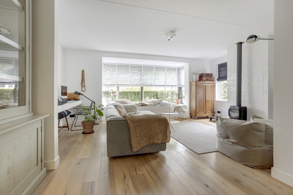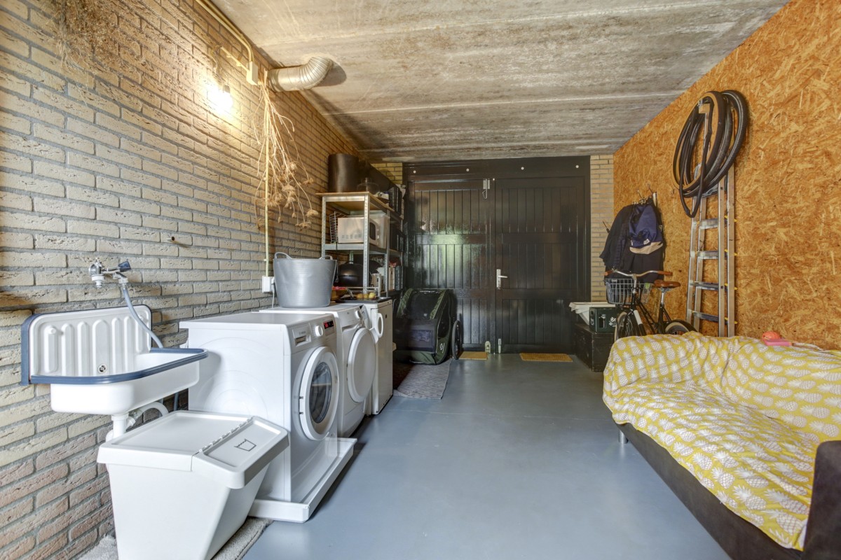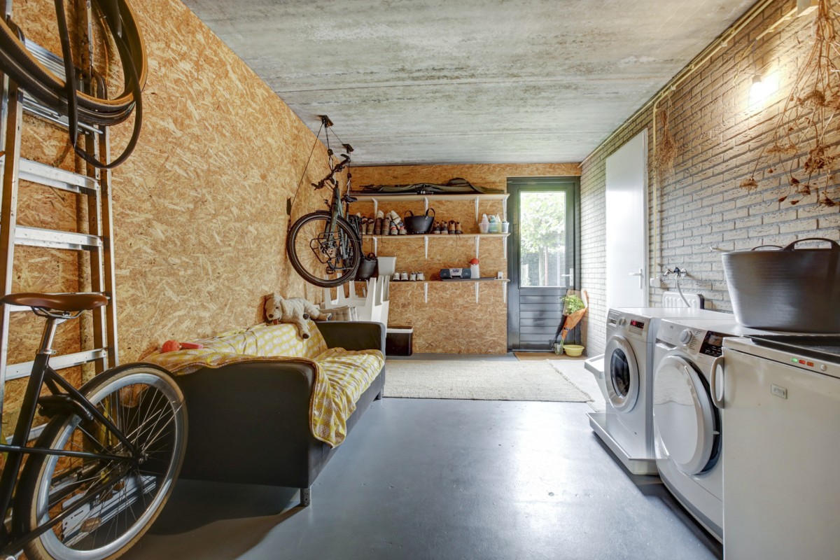 Begane grond: overdekte entree, hal met uitgebreide meterkast, garderobe, moderne toiletruimte met hangcloset en fonteintje, middels een glasdeur is de living bereikbaar. De woonkamer bevindt zich aan de voorzijde van de woning en heeft dankzij de brede erker vrij uitzicht over groen. Deze brede erker is ingericht als fijne zithoek in de zon. De living is tevens voorzien van een mooie houtkachel (Jotul) alsmede een design glazenwand met openslaande deuren naar de woonkeuken. De woonkeuken is middels de glasdeuren afsluitbaar en voorzien van een mooie eethoek alsmede een professionele designkeuken. De keuken bestaat uit een eiland met wastafel en vaatwasser. De achterwand van de keuken bestaat uit een aluminium werkblad met kortlades en een 5-pits gaskookplaat met afzuigschouw. Vanuit de eethoek geven openslaande deuren toegang tot de tuin en een doorgang naar de bijkeuken biedt een extra kastenwand met ingebouwde koelkast, wasapparatuur en combimagnetron. De bijkeuken beschikt ook over een loopdeur naar de tuin en binnendoor naar de geïsoleerde garage. Vanuit de garage geeft een loopdeur toegang tot de tuin en openslaande garagedeuren toegang tot de oprit. De hal, living en eethoek zijn voorzien van een mooie houten vloer, waarbij de keuken en bijkeuken voorzien is van kleine design vloertegels. De wanden zijn onderhoudsarm afgewerkt met hoge plinten en de garagevloer bestaat uit een geïsoleerde betonvloer. De tuin is prachtig aangelegd met "volwassen groen" waardoor de tuin veel privacy geeft. De vrijstaande schuur past hel goed in het gehele concept van de tuin, waarmee tevens veel bergruimte beschikbaar is.