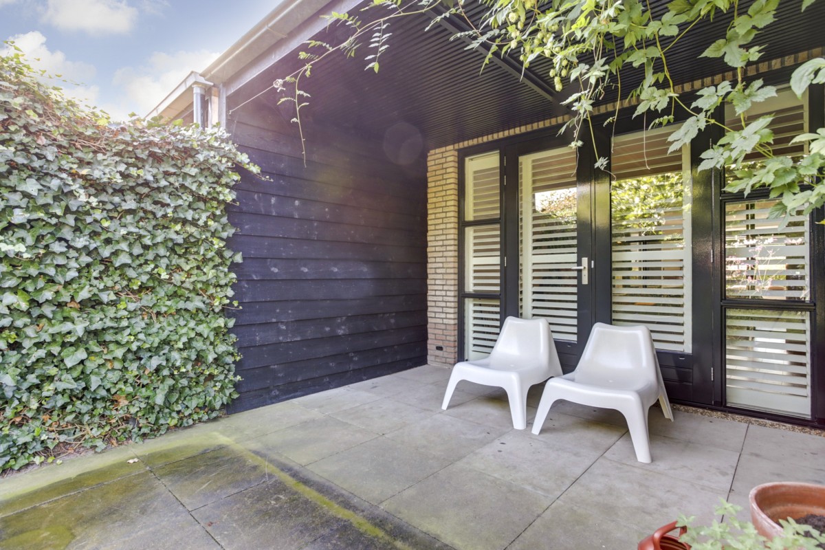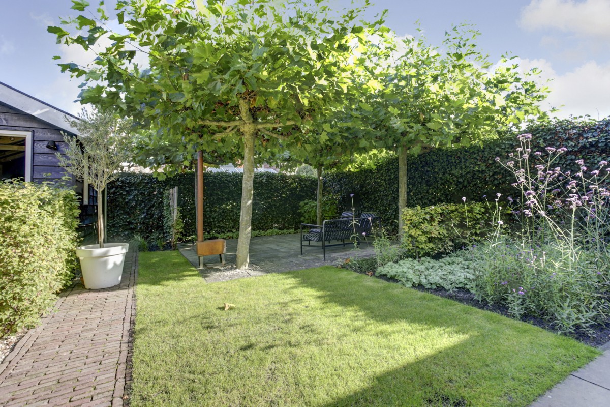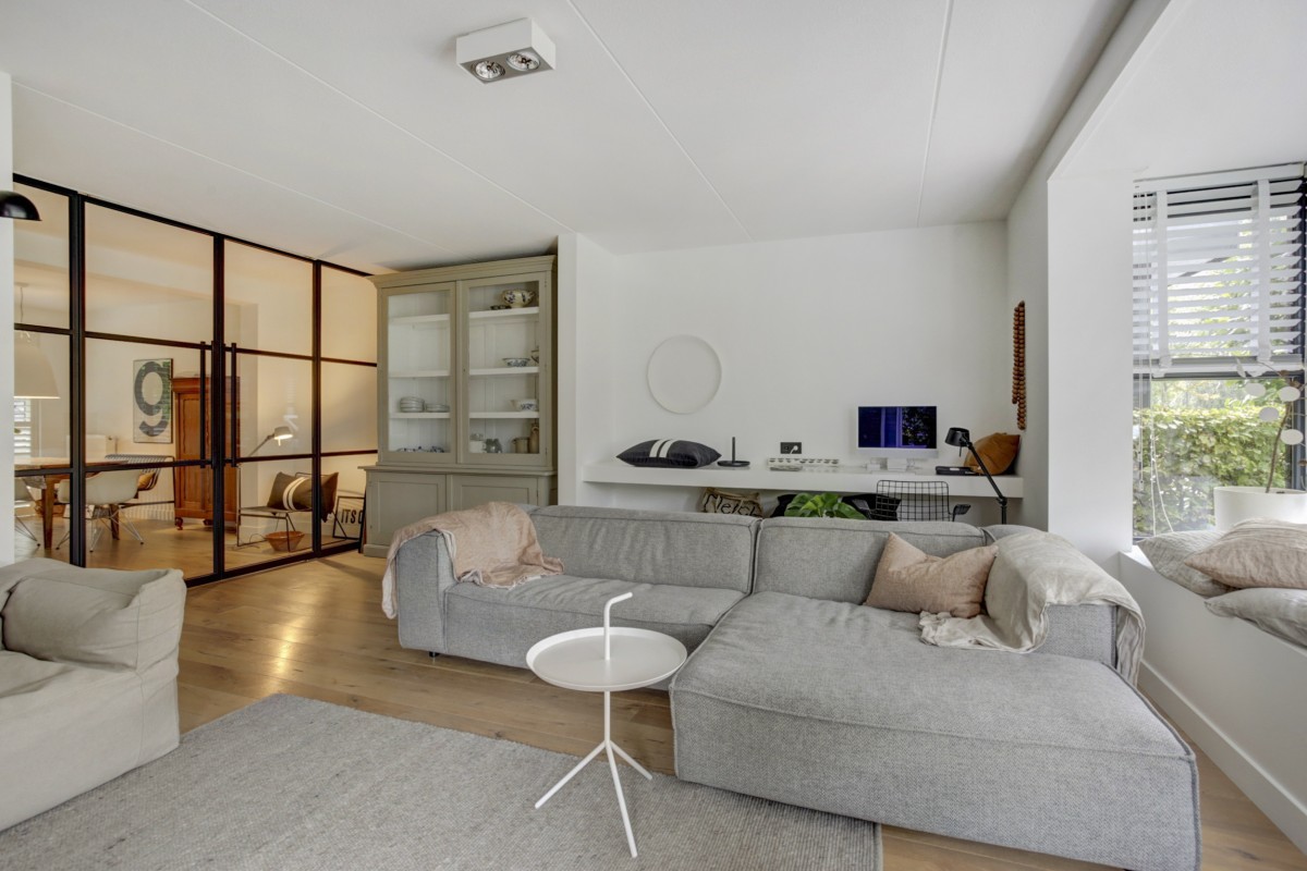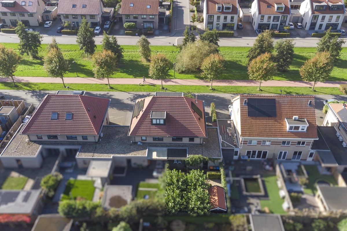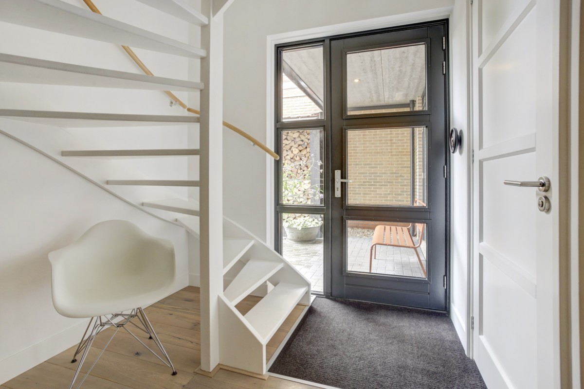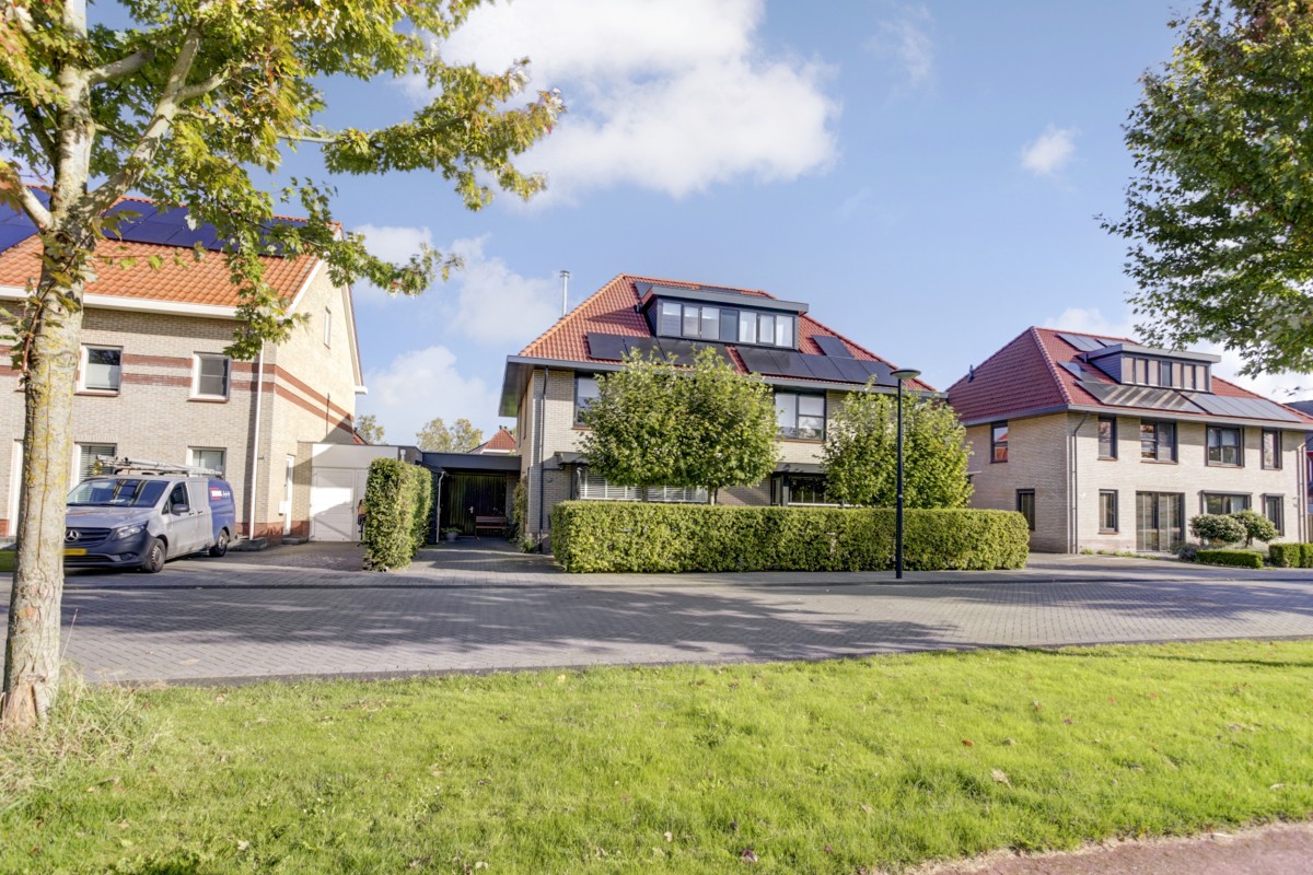 Begane grond: overdekte entree, hal met uitgebreide meterkast, garderobe, moderne toiletruimte met hangcloset en fonteintje, middels een glasdeur is de living bereikbaar. De woonkamer bevindt zich aan de voorzijde van de woning en heeft dankzij de brede erker vrij uitzicht over groen. Deze brede erker is ingericht als fijne zithoek in de zon. De living is tevens voorzien van een mooie houtkachel (Jotul) alsmede een design glazenwand met openslaande deuren naar de woonkeuken. De woonkeuken is middels de glasdeuren afsluitbaar en voorzien van een mooie eethoek alsmede een professionele designkeuken. De keuken bestaat uit een eiland met wastafel en vaatwasser. De achterwand van de keuken bestaat uit een aluminium werkblad met kortlades en een 5-pits gaskookplaat met afzuigschouw. Vanuit de eethoek geven openslaande deuren toegang tot de tuin en een doorgang naar de bijkeuken biedt een extra kastenwand met ingebouwde koelkast, wasapparatuur en combimagnetron. De bijkeuken beschikt ook over een loopdeur naar de tuin en binnendoor naar de geïsoleerde garage. Vanuit de garage geeft een loopdeur toegang tot de tuin en openslaande garagedeuren toegang tot de oprit. De hal, living en eethoek zijn voorzien van een mooie houten vloer, waarbij de keuken en bijkeuken voorzien is van kleine design vloertegels. De wanden zijn onderhoudsarm afgewerkt met hoge plinten en de garagevloer bestaat uit een geïsoleerde betonvloer. De tuin is prachtig aangelegd met "volwassen groen" waardoor de tuin veel privacy geeft. De vrijstaande schuur past hel goed in het gehele concept van de tuin, waarmee tevens veel bergruimte beschikbaar is.