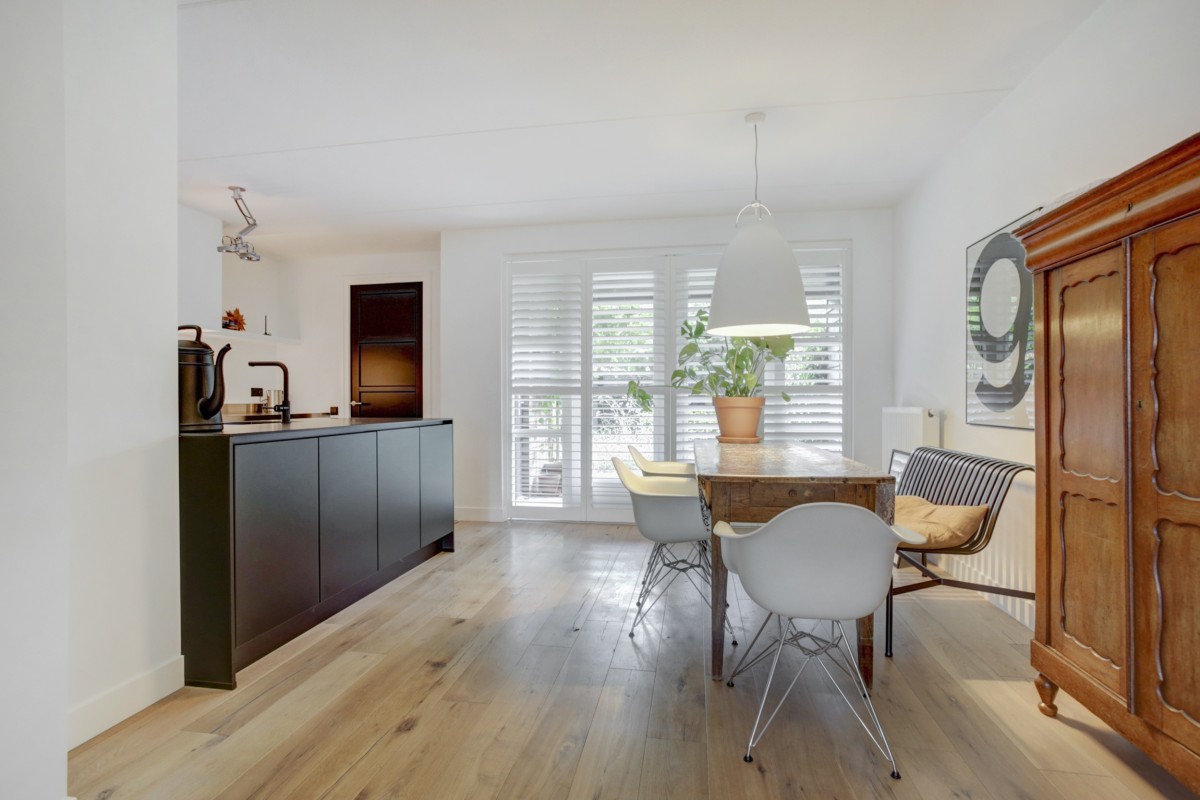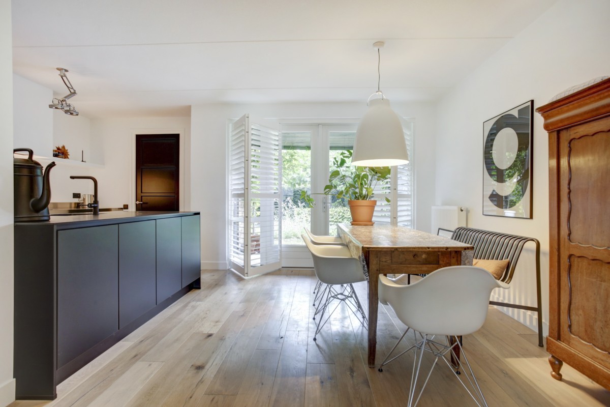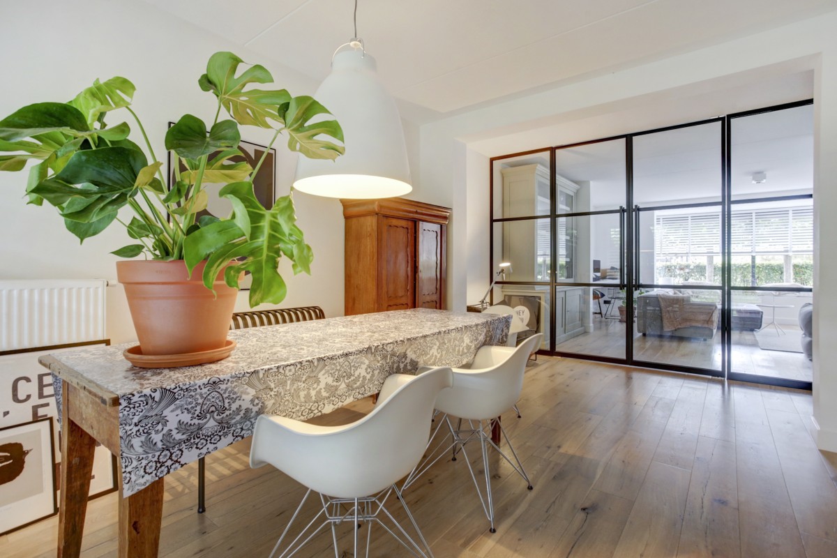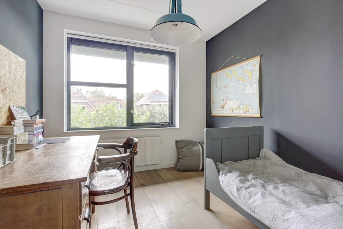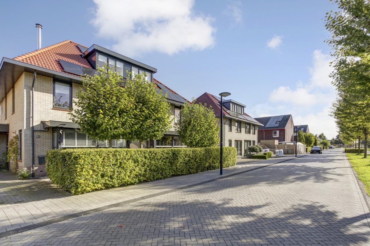 Begane grond: overdekte entree, hal met uitgebreide meterkast, garderobe, moderne toiletruimte met hangcloset en fonteintje, middels een glasdeur is de living bereikbaar. De woonkamer bevindt zich aan de voorzijde van de woning en heeft dankzij de brede erker vrij uitzicht over groen. Deze brede erker is ingericht als fijne zithoek in de zon. De living is tevens voorzien van een mooie houtkachel (Jotul) alsmede een design glazenwand met openslaande deuren naar de woonkeuken. De woonkeuken is middels de glasdeuren afsluitbaar en voorzien van een mooie eethoek alsmede een professionele designkeuken. De keuken bestaat uit een eiland met wastafel en vaatwasser. De achterwand van de keuken bestaat uit een aluminium werkblad met kortlades en een 5-pits gaskookplaat met afzuigschouw. Vanuit de eethoek geven openslaande deuren toegang tot de tuin en een doorgang naar de bijkeuken biedt een extra kastenwand met ingebouwde koelkast, wasapparatuur en combimagnetron. De bijkeuken beschikt ook over een loopdeur naar de tuin en binnendoor naar de geïsoleerde garage. Vanuit de garage geeft een loopdeur toegang tot de tuin en openslaande garagedeuren toegang tot de oprit. De hal, living en eethoek zijn voorzien van een mooie houten vloer, waarbij de keuken en bijkeuken voorzien is van kleine design vloertegels. De wanden zijn onderhoudsarm afgewerkt met hoge plinten en de garagevloer bestaat uit een geïsoleerde betonvloer. De tuin is prachtig aangelegd met "volwassen groen" waardoor de tuin veel privacy geeft. De vrijstaande schuur past hel goed in het gehele concept van de tuin, waarmee tevens veel bergruimte beschikbaar is.