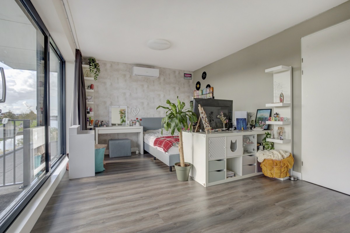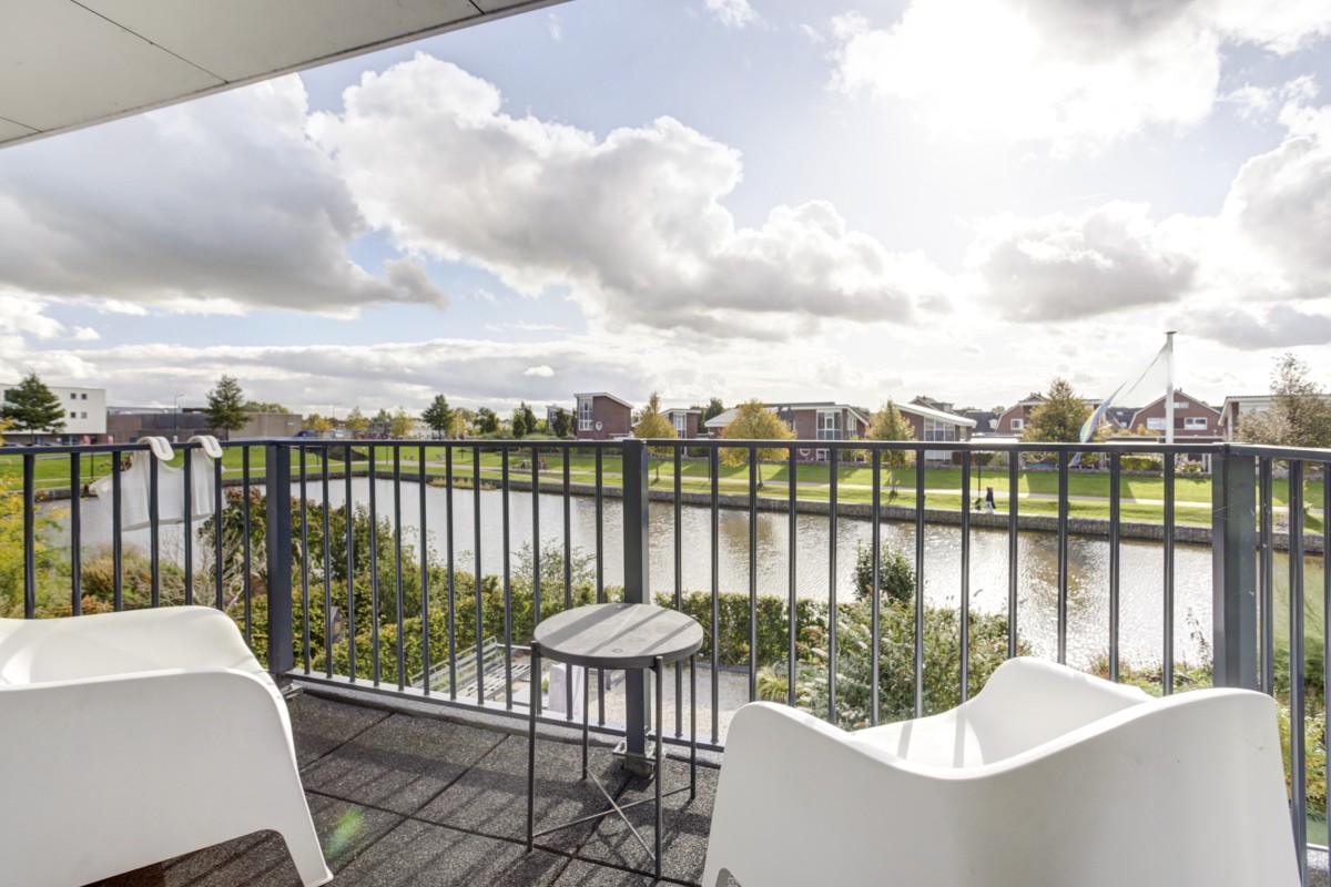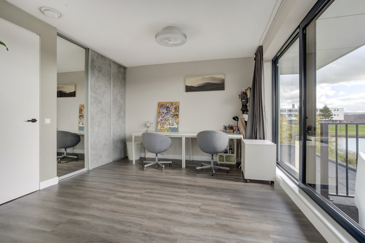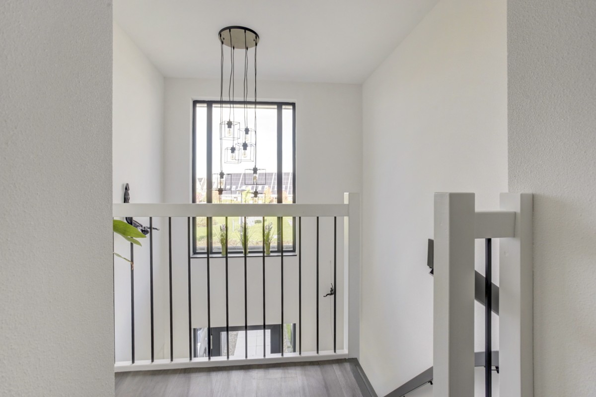Eerste verdieping: mooie open trap met vide naar de ruime lichte overloop met aansluitend 3 grote slaapkamers en de 2e badkamer. De luxe badkamer beschikt over een ruime inloopdouche, 2e hangcloset, elektrische designradiator en dubbele wastafel. De grote slaapkamer aan de achterzijde is voorzien van een schuifpui naar een balkon met prachtig weids uitzicht over het water en de woonwijk. Tevens beschikt deze verdieping over een zeer riante berging. Twee slaapkamers zijn eveneens voorzien van vaste kasten van Storhus.