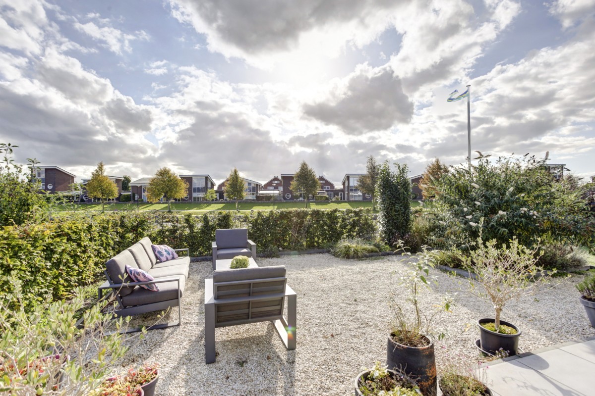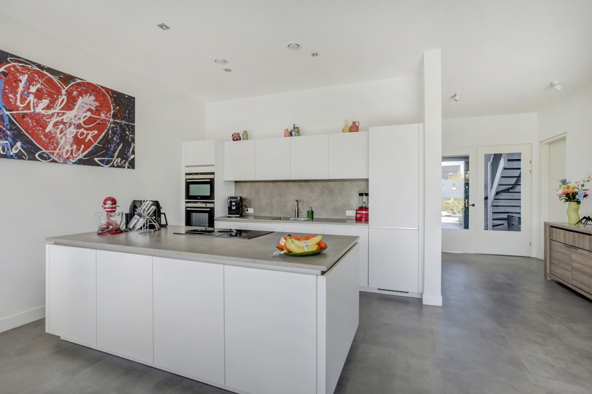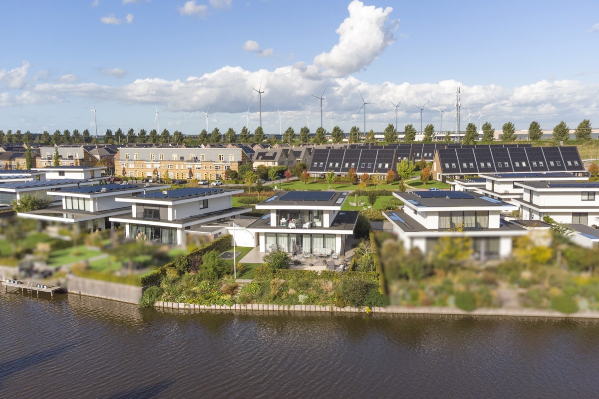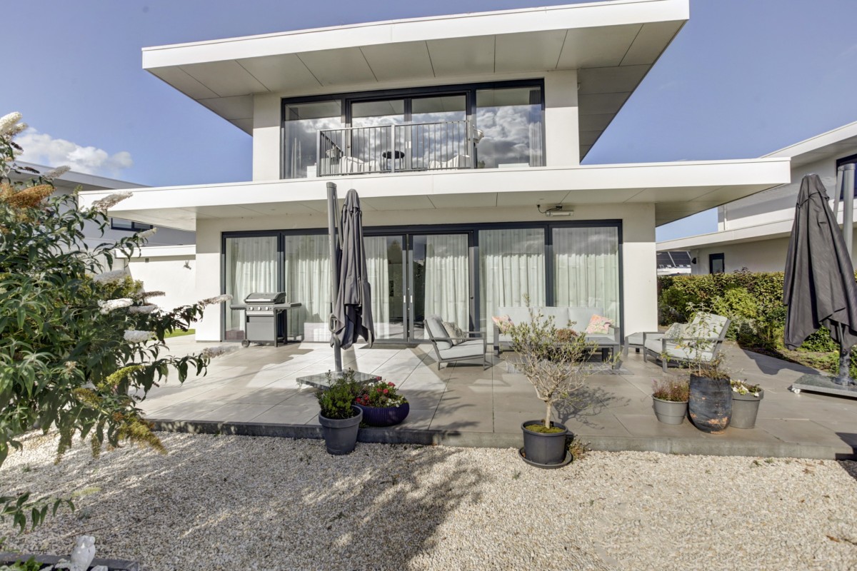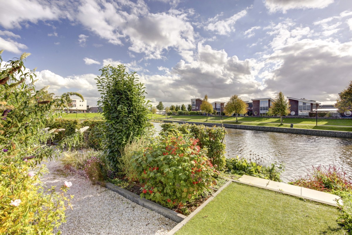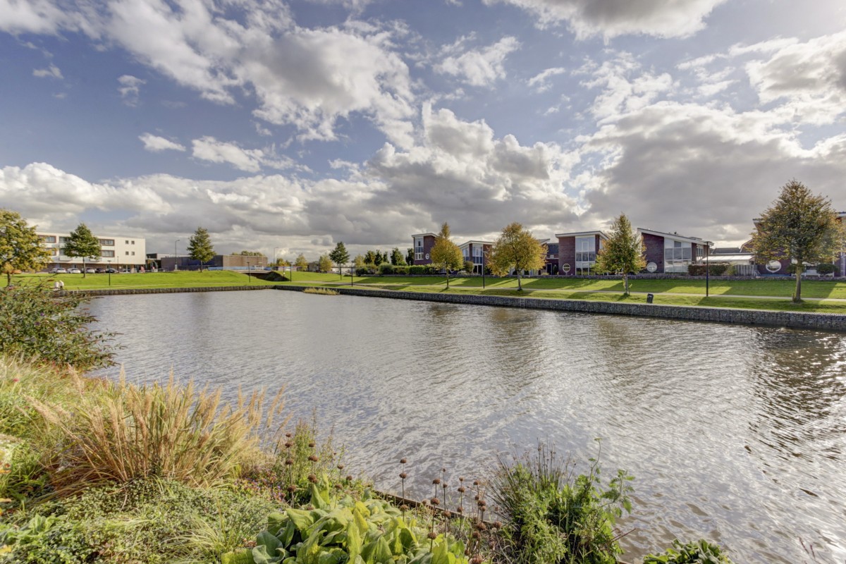 Begane grond: entree, ruime hal met vide en dubbele openslaande glazen deuren, uitgebreide meterkast, moderne ruime toiletruimte met hangcloset en fonteintje, trapopgang naar de eerste verdieping. Doorgang naar de berging/bijkeuken waar o.a. de was-apparatuur, de boiler, waterontharder, WTW en de water/water warmtepomp staan opgesteld. Vanuit de bijkeuken/berging is een mogelijkheid gebruik te maken van een loopdeur naar de oprit. De ruime slaapkamer beschikt over en een grote ingebouwde kastenwand welke op maat gemaakt is door Storhus Interieur. Aangrenzend is de luxe badkamer gesitueerd welke voorzien is van een ligbad, ruime inloopdouche, wastafel en hangcloset. Een tweede grote slaapkamer is in gebruik als multifunctionele werkkamer en eveneens voorzien van een op maak gemaakt kastenwand. De living is aan de tuinzijde gesitueerd en over de gehele breedte van de woning gerealiseerd. Het uitzicht en licht van deze ruimte is mede door de hoogte ongekend mooi! De luxe keuken bestaat uit een kastenwand met aanrechtdeel en een eiland met groot werkblad welke tevens voorzien is van ingebouwde koelkast, oven, vaatwasser, oven met magnetron functie en inductiekookplaat met geïntegreerde downdrift afzuiging. Een grote schuifpui geeft toegang tot de brede tuin. De achtertuin is op het zuiden gesitueerd en grenst aan de achterzijde aan water. Rondom de woning is de tuin aangelegd waarbij meerdere terrassen beschikbaar, ruime parkeergelegenheid en een grote vrijstaande schuur aanwezig zijn. De kap van de woning steekt ruim over, waardoor de woning rondom een overkapping biedt om droog rondom de woning te lopen. Aan de voorzijde grenst de woning aan een hofje waar een ruime speelgelegenheid gerealiseerd is.
