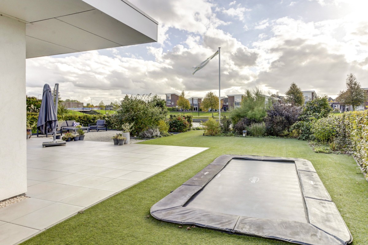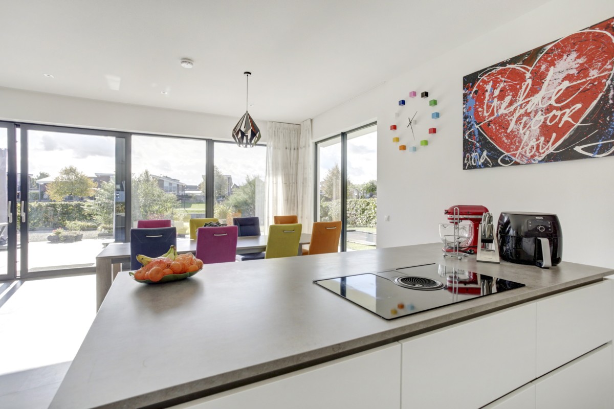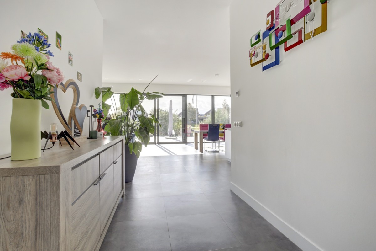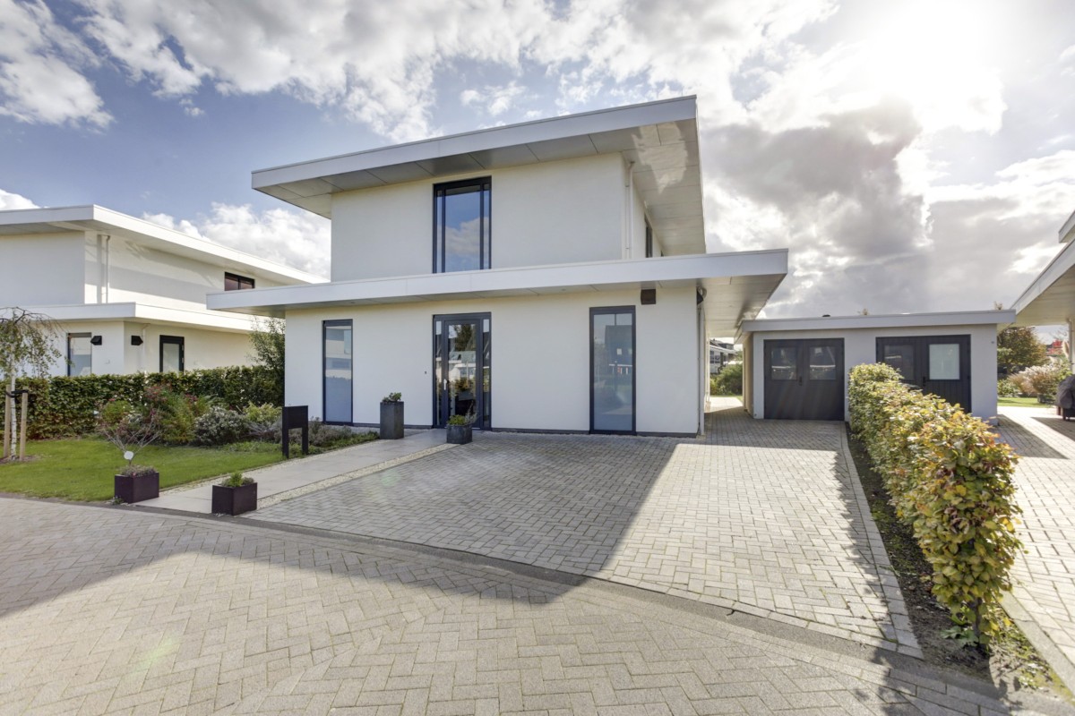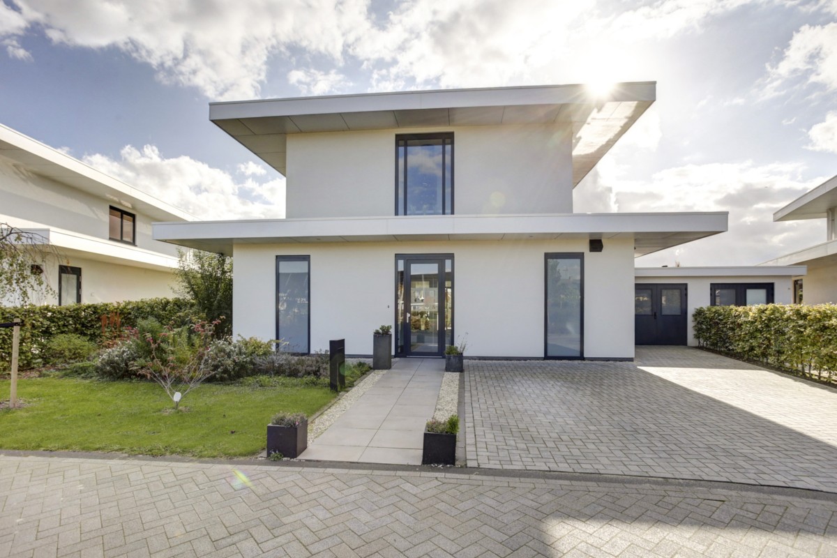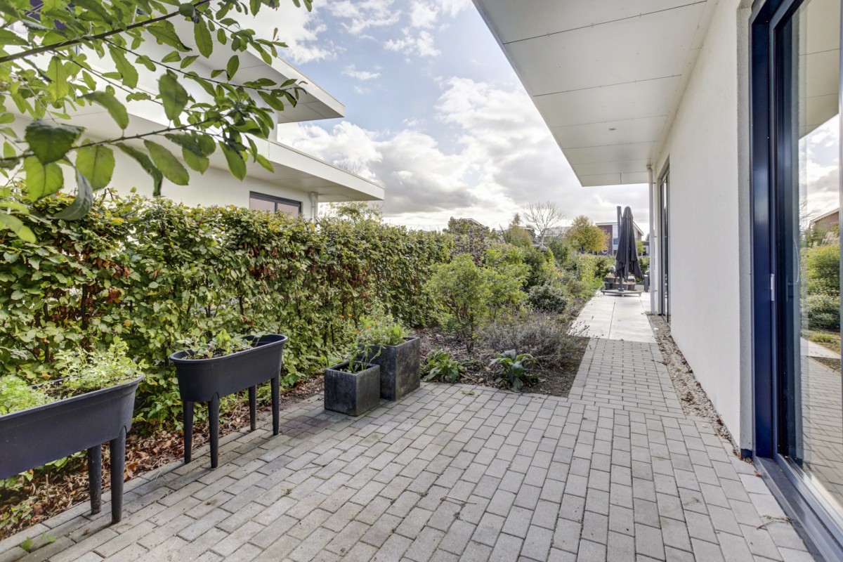 Begane grond: entree, ruime hal met vide en dubbele openslaande glazen deuren, uitgebreide meterkast, moderne ruime toiletruimte met hangcloset en fonteintje, trapopgang naar de eerste verdieping. Doorgang naar de berging/bijkeuken waar o.a. de was-apparatuur, de boiler, waterontharder, WTW en de water/water warmtepomp staan opgesteld. Vanuit de bijkeuken/berging is een mogelijkheid gebruik te maken van een loopdeur naar de oprit. De ruime slaapkamer beschikt over en een grote ingebouwde kastenwand welke op maat gemaakt is door Storhus Interieur. Aangrenzend is de luxe badkamer gesitueerd welke voorzien is van een ligbad, ruime inloopdouche, wastafel en hangcloset. Een tweede grote slaapkamer is in gebruik als multifunctionele werkkamer en eveneens voorzien van een op maak gemaakt kastenwand. De living is aan de tuinzijde gesitueerd en over de gehele breedte van de woning gerealiseerd. Het uitzicht en licht van deze ruimte is mede door de hoogte ongekend mooi! De luxe keuken bestaat uit een kastenwand met aanrechtdeel en een eiland met groot werkblad welke tevens voorzien is van ingebouwde koelkast, oven, vaatwasser, oven met magnetron functie en inductiekookplaat met geïntegreerde downdrift afzuiging. Een grote schuifpui geeft toegang tot de brede tuin. De achtertuin is op het zuiden gesitueerd en grenst aan de achterzijde aan water. Rondom de woning is de tuin aangelegd waarbij meerdere terrassen beschikbaar, ruime parkeergelegenheid en een grote vrijstaande schuur aanwezig zijn. De kap van de woning steekt ruim over, waardoor de woning rondom een overkapping biedt om droog rondom de woning te lopen. Aan de voorzijde grenst de woning aan een hofje waar een ruime speelgelegenheid gerealiseerd is.