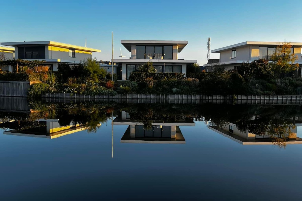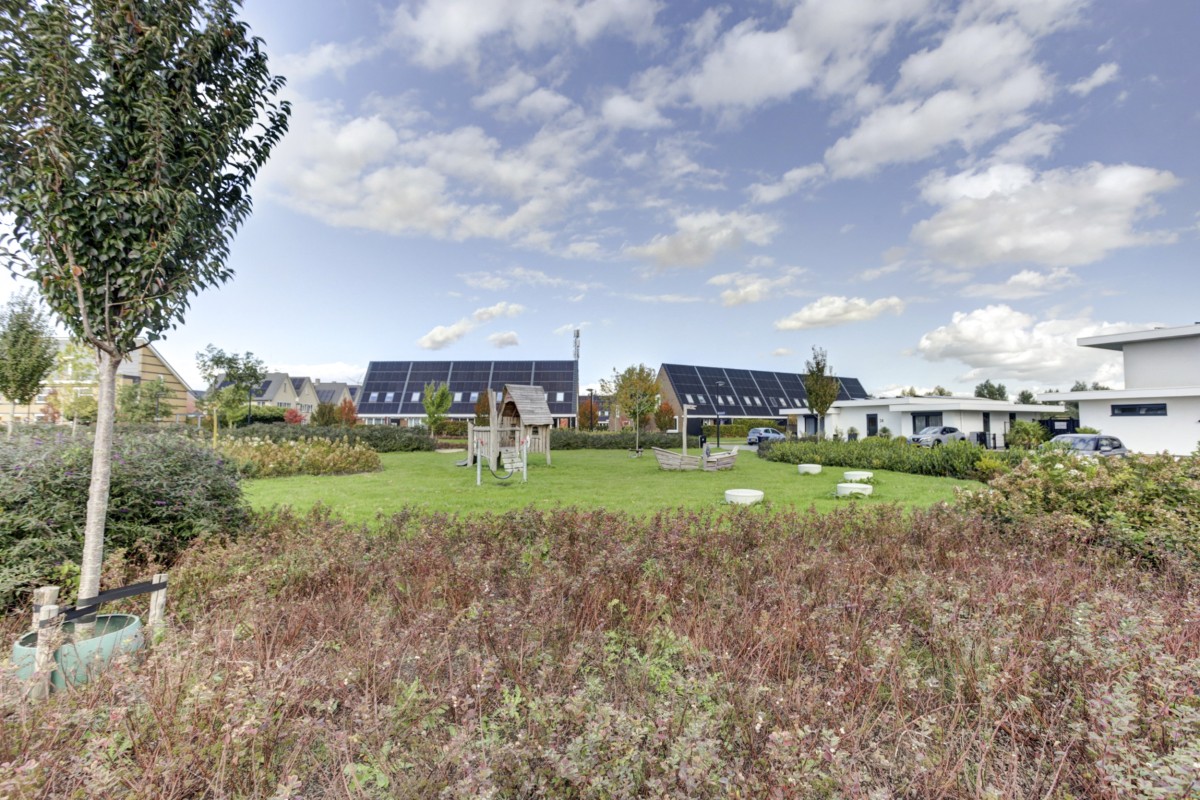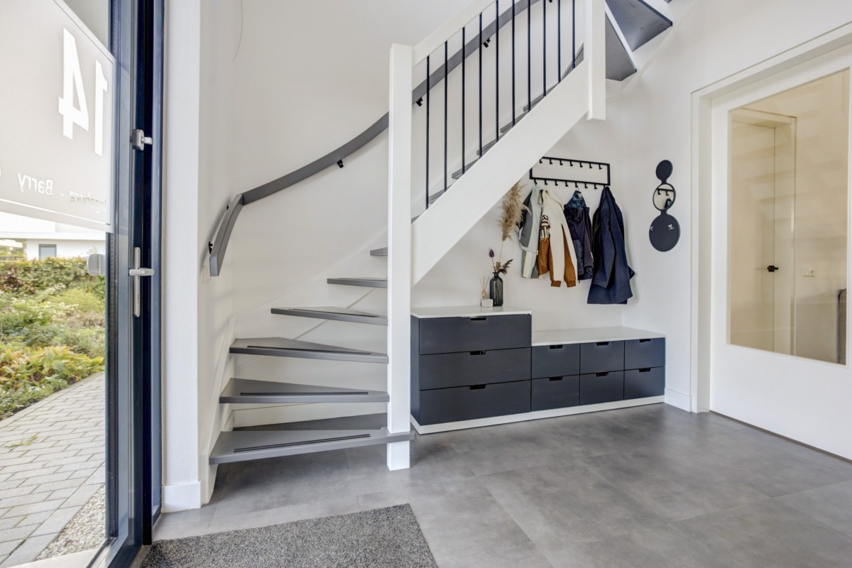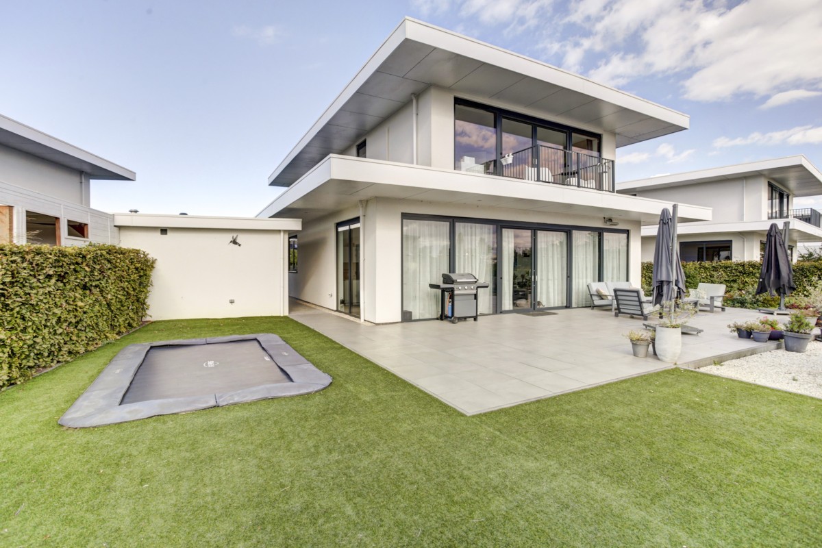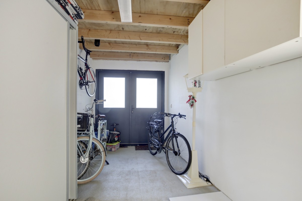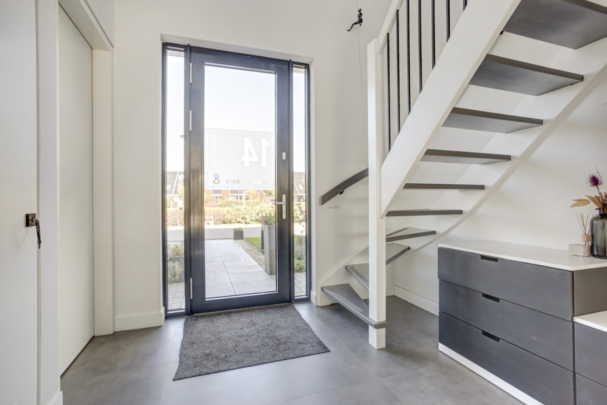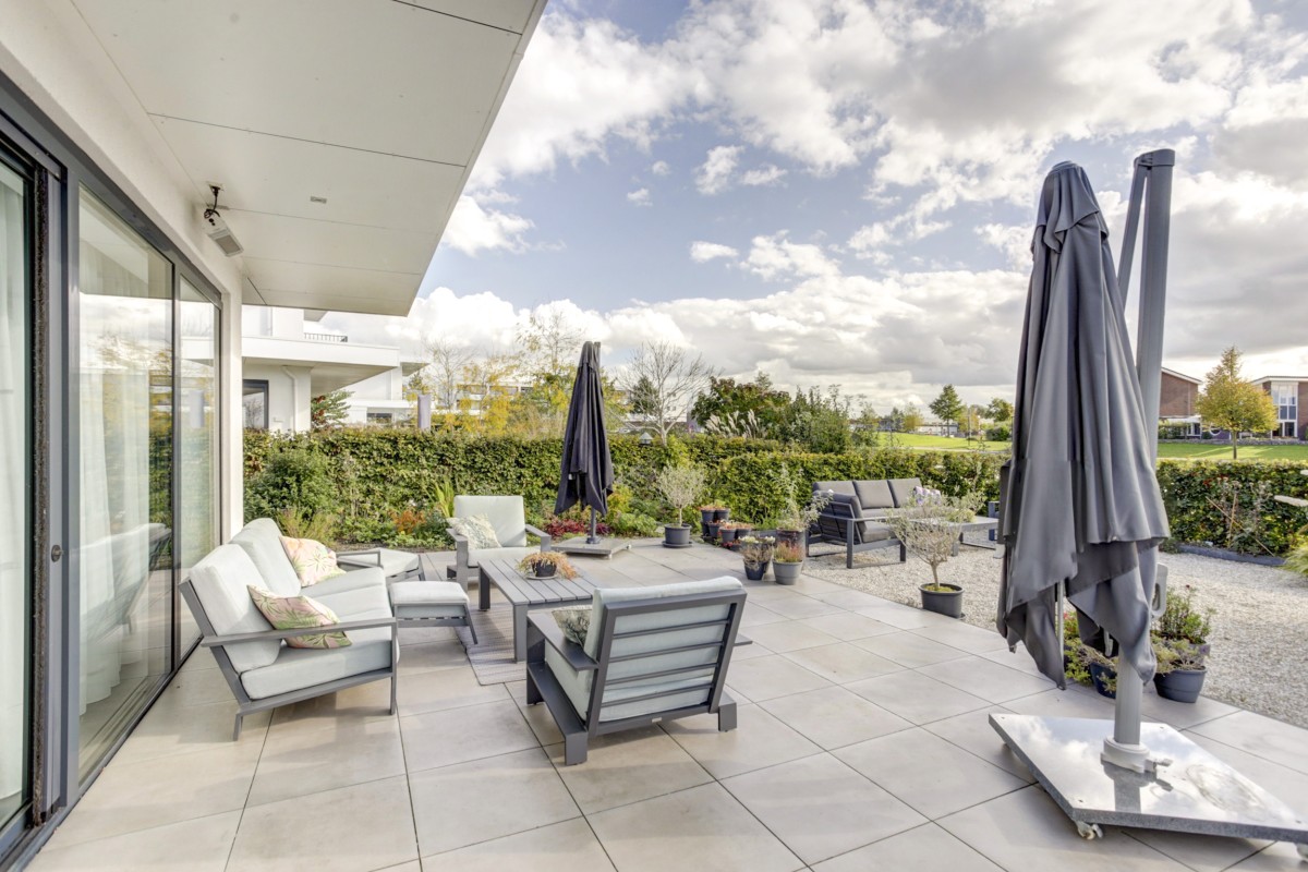 Begane grond: entree, ruime hal met vide en dubbele openslaande glazen deuren, uitgebreide meterkast, moderne ruime toiletruimte met hangcloset en fonteintje, trapopgang naar de eerste verdieping. Doorgang naar de berging/bijkeuken waar o.a. de was-apparatuur, de boiler, waterontharder, WTW en de water/water warmtepomp staan opgesteld. Vanuit de bijkeuken/berging is een mogelijkheid gebruik te maken van een loopdeur naar de oprit. De ruime slaapkamer beschikt over en een grote ingebouwde kastenwand welke op maat gemaakt is door Storhus Interieur. Aangrenzend is de luxe badkamer gesitueerd welke voorzien is van een ligbad, ruime inloopdouche, wastafel en hangcloset. Een tweede grote slaapkamer is in gebruik als multifunctionele werkkamer en eveneens voorzien van een op maak gemaakt kastenwand. De living is aan de tuinzijde gesitueerd en over de gehele breedte van de woning gerealiseerd. Het uitzicht en licht van deze ruimte is mede door de hoogte ongekend mooi! De luxe keuken bestaat uit een kastenwand met aanrechtdeel en een eiland met groot werkblad welke tevens voorzien is van ingebouwde koelkast, oven, vaatwasser, oven met magnetron functie en inductiekookplaat met geïntegreerde downdrift afzuiging. Een grote schuifpui geeft toegang tot de brede tuin. De achtertuin is op het zuiden gesitueerd en grenst aan de achterzijde aan water. Rondom de woning is de tuin aangelegd waarbij meerdere terrassen beschikbaar, ruime parkeergelegenheid en een grote vrijstaande schuur aanwezig zijn. De kap van de woning steekt ruim over, waardoor de woning rondom een overkapping biedt om droog rondom de woning te lopen. Aan de voorzijde grenst de woning aan een hofje waar een ruime speelgelegenheid gerealiseerd is.