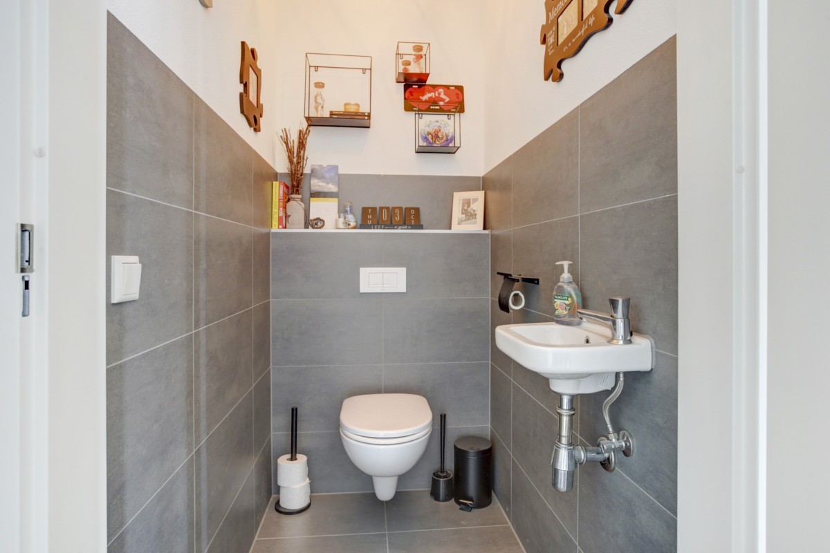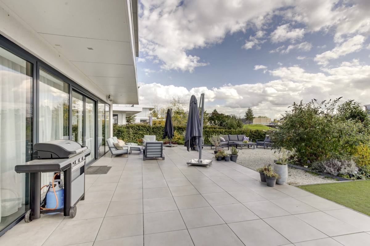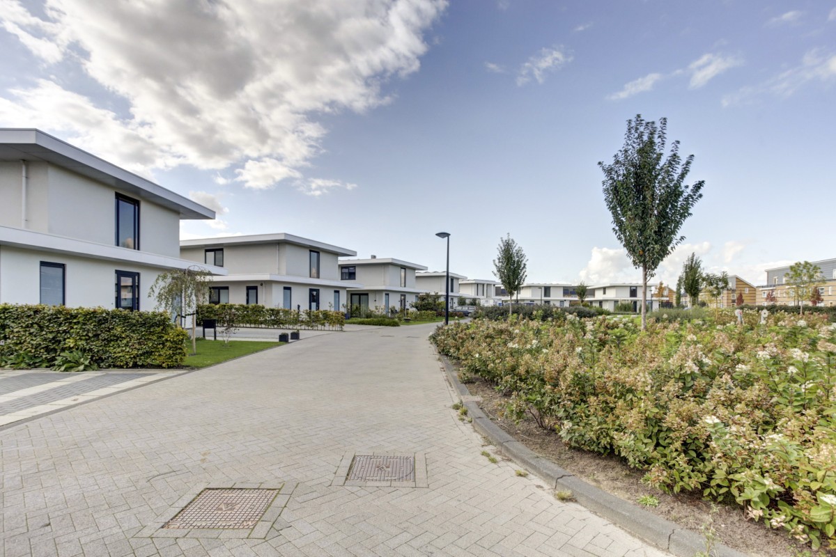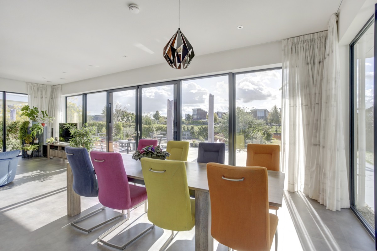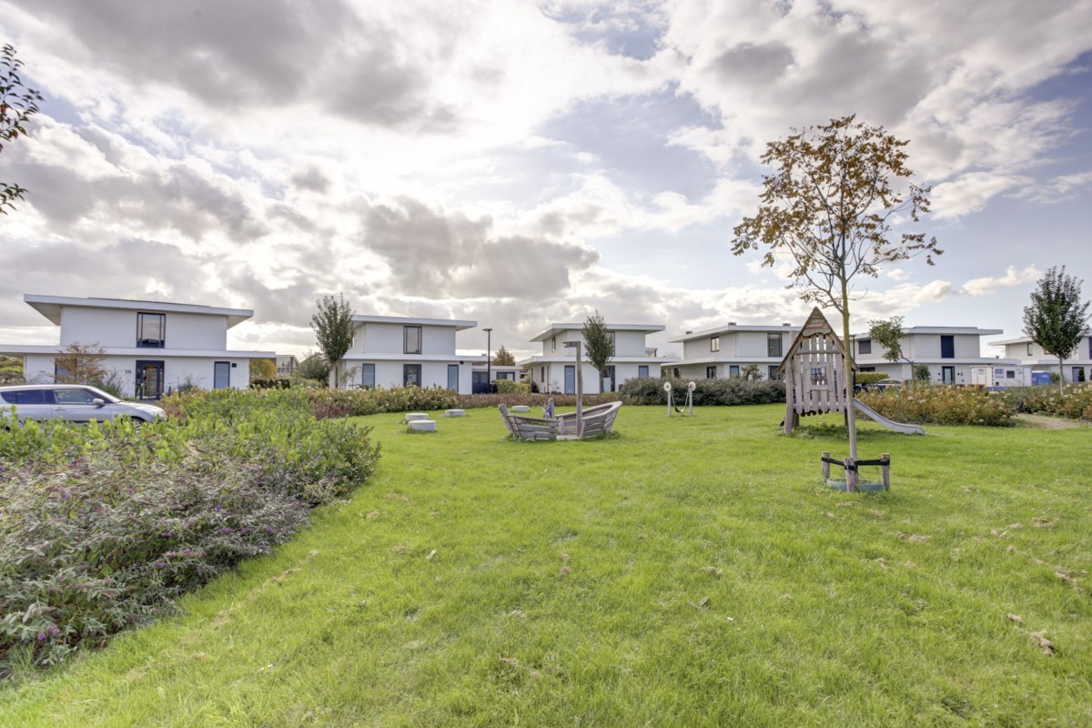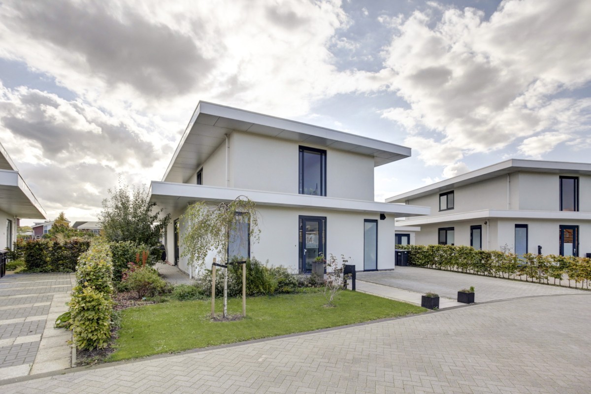 Begane grond: entree, ruime hal met vide en dubbele openslaande glazen deuren, uitgebreide meterkast, moderne ruime toiletruimte met hangcloset en fonteintje, trapopgang naar de eerste verdieping. Doorgang naar de berging/bijkeuken waar o.a. de was-apparatuur, de boiler, waterontharder, WTW en de water/water warmtepomp staan opgesteld. Vanuit de bijkeuken/berging is een mogelijkheid gebruik te maken van een loopdeur naar de oprit. De ruime slaapkamer beschikt over en een grote ingebouwde kastenwand welke op maat gemaakt is door Storhus Interieur. Aangrenzend is de luxe badkamer gesitueerd welke voorzien is van een ligbad, ruime inloopdouche, wastafel en hangcloset. Een tweede grote slaapkamer is in gebruik als multifunctionele werkkamer en eveneens voorzien van een op maak gemaakt kastenwand. De living is aan de tuinzijde gesitueerd en over de gehele breedte van de woning gerealiseerd. Het uitzicht en licht van deze ruimte is mede door de hoogte ongekend mooi! De luxe keuken bestaat uit een kastenwand met aanrechtdeel en een eiland met groot werkblad welke tevens voorzien is van ingebouwde koelkast, oven, vaatwasser, oven met magnetron functie en inductiekookplaat met geïntegreerde downdrift afzuiging. Een grote schuifpui geeft toegang tot de brede tuin. De achtertuin is op het zuiden gesitueerd en grenst aan de achterzijde aan water. Rondom de woning is de tuin aangelegd waarbij meerdere terrassen beschikbaar, ruime parkeergelegenheid en een grote vrijstaande schuur aanwezig zijn. De kap van de woning steekt ruim over, waardoor de woning rondom een overkapping biedt om droog rondom de woning te lopen. Aan de voorzijde grenst de woning aan een hofje waar een ruime speelgelegenheid gerealiseerd is.