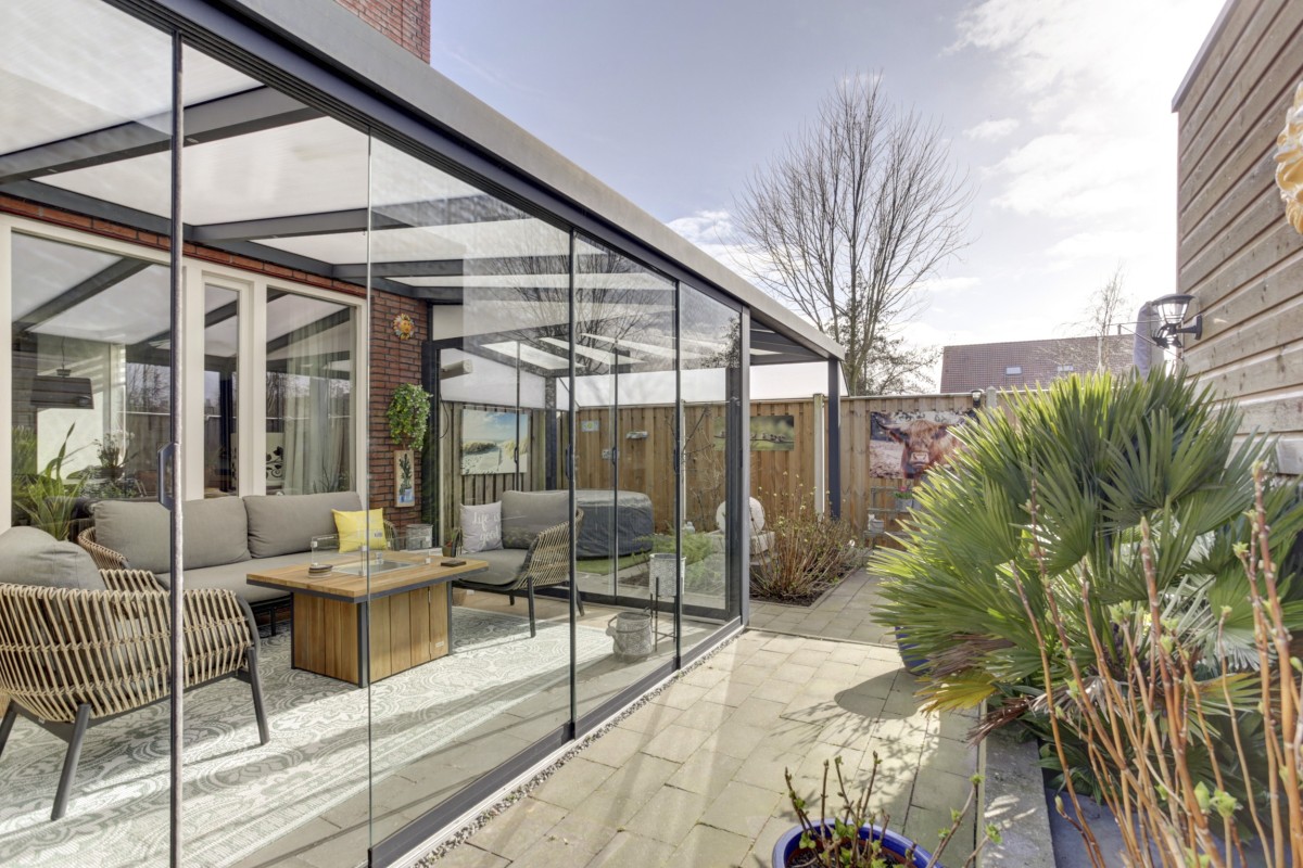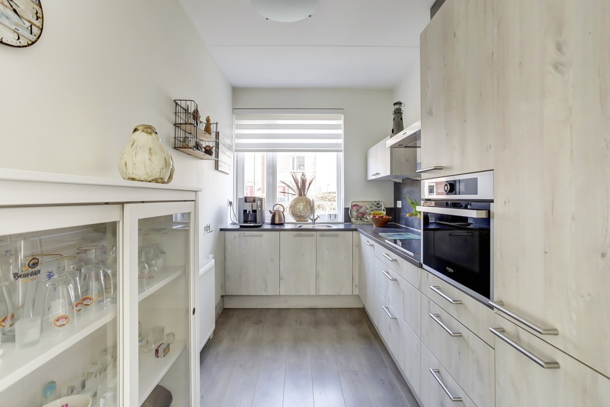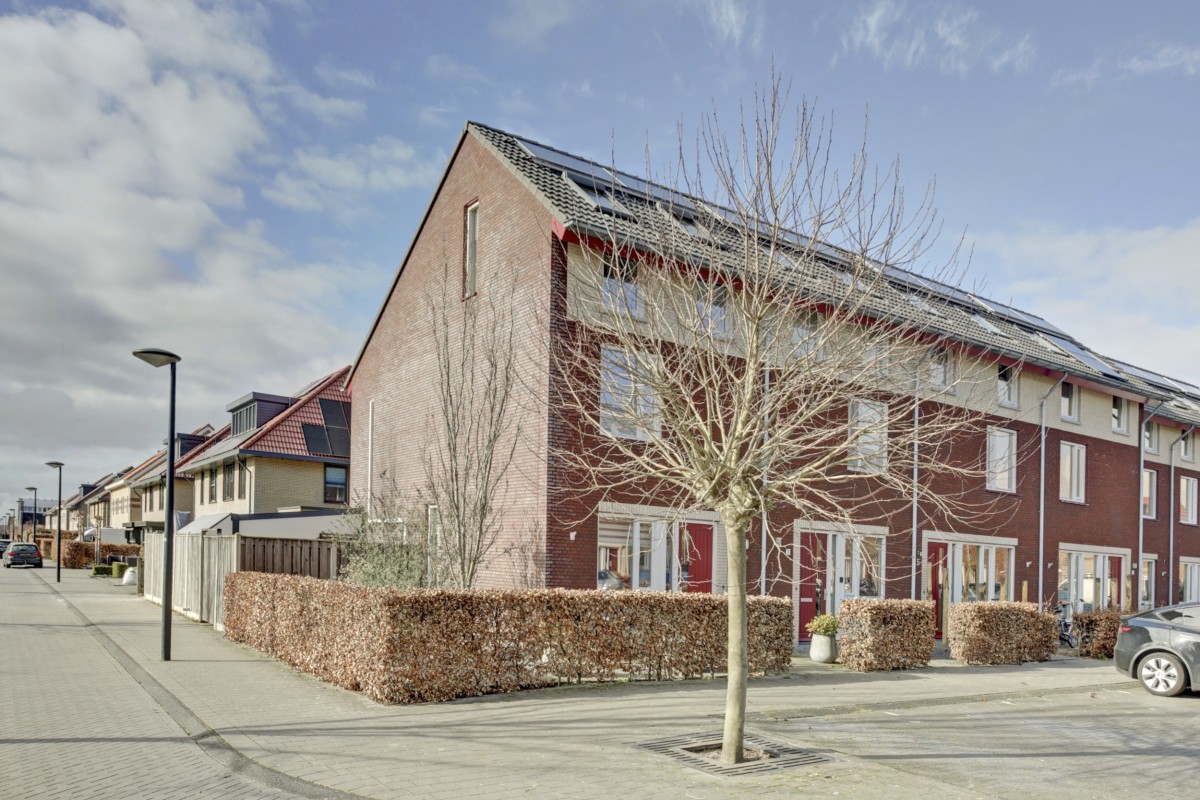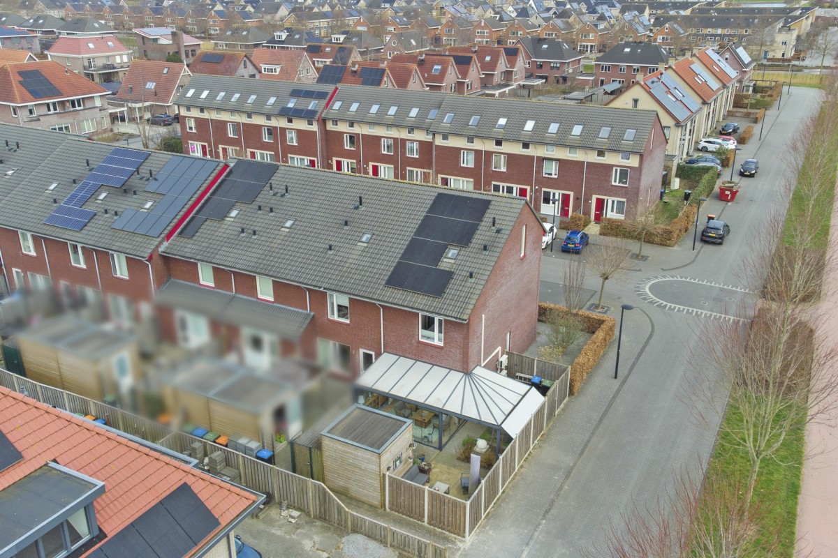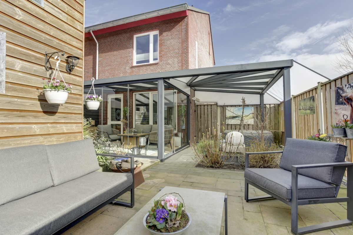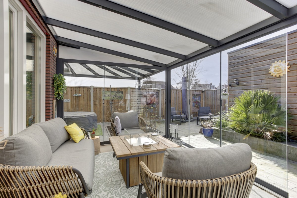 Begane grond: entree, hal met garderobe, moderne toiletruimte met hangcloset en fonteintje, uitgebreide meterkast, straatgerichte keuken welke in een hoek is opgesteld en voorzien is van een ruim werkblad, veel kastruimte en een ingebouwde vaatwasser, koelkast, vrieskast, combimagnetron, inductiekookplaat en afzuigkap. Vanuit de keuken is vrij uitzicht op de straat en de naastgelegen groenvoorziening. Aan de achterzijde van de woning is de tuingerichte woonkamer gesitueerd welke beschikt over een ruime trapkast, airconditioning en een doorgang naar de aangebouwde overkapping. De overkapping is middels glazen schuifpanelen afsluitbaar en als serre te gebruiken. De tuin is op het westen gesitueerd en bereikbaar vanuit een zijingang en achterom. De tuin is onderhoudsarm aangelegd en voorzien van een vrijstaande houten berging.