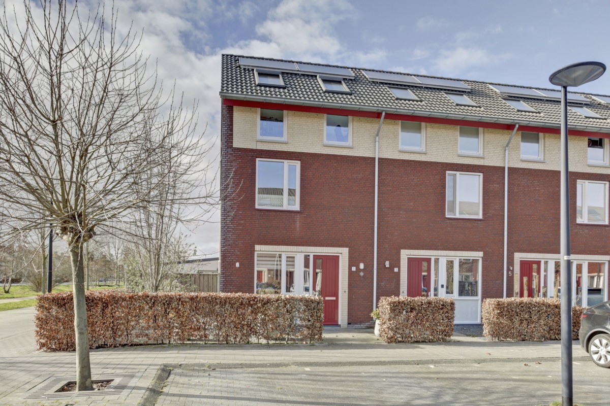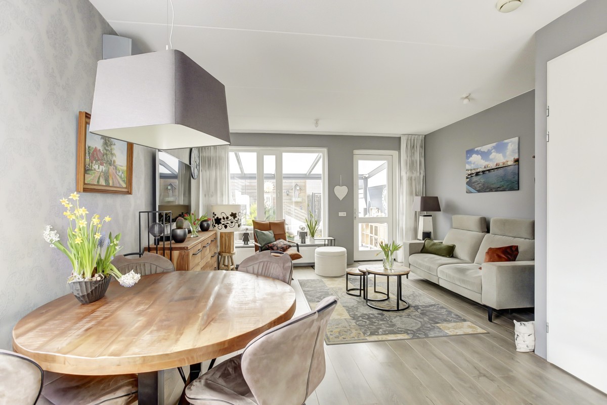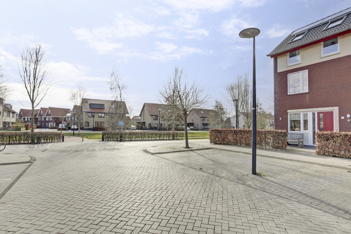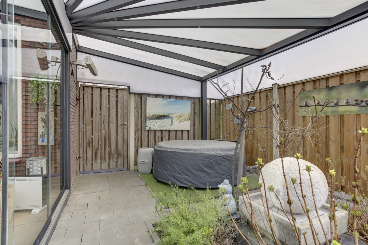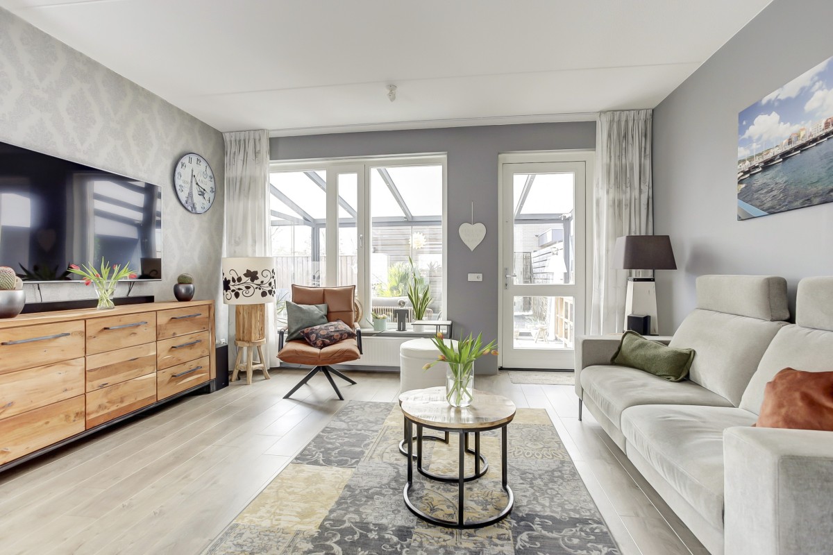 Begane grond: entree, hal met garderobe, moderne toiletruimte met hangcloset en fonteintje, uitgebreide meterkast, straatgerichte keuken welke in een hoek is opgesteld en voorzien is van een ruim werkblad, veel kastruimte en een ingebouwde vaatwasser, koelkast, vrieskast, combimagnetron, inductiekookplaat en afzuigkap. Vanuit de keuken is vrij uitzicht op de straat en de naastgelegen groenvoorziening. Aan de achterzijde van de woning is de tuingerichte woonkamer gesitueerd welke beschikt over een ruime trapkast, airconditioning en een doorgang naar de aangebouwde overkapping. De overkapping is middels glazen schuifpanelen afsluitbaar en als serre te gebruiken. De tuin is op het westen gesitueerd en bereikbaar vanuit een zijingang en achterom. De tuin is onderhoudsarm aangelegd en voorzien van een vrijstaande houten berging.