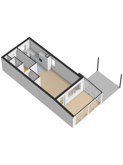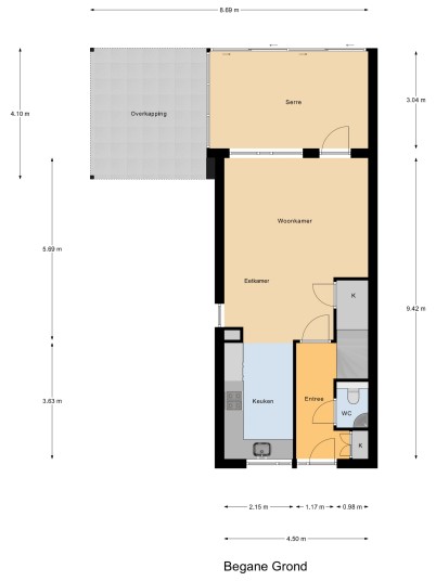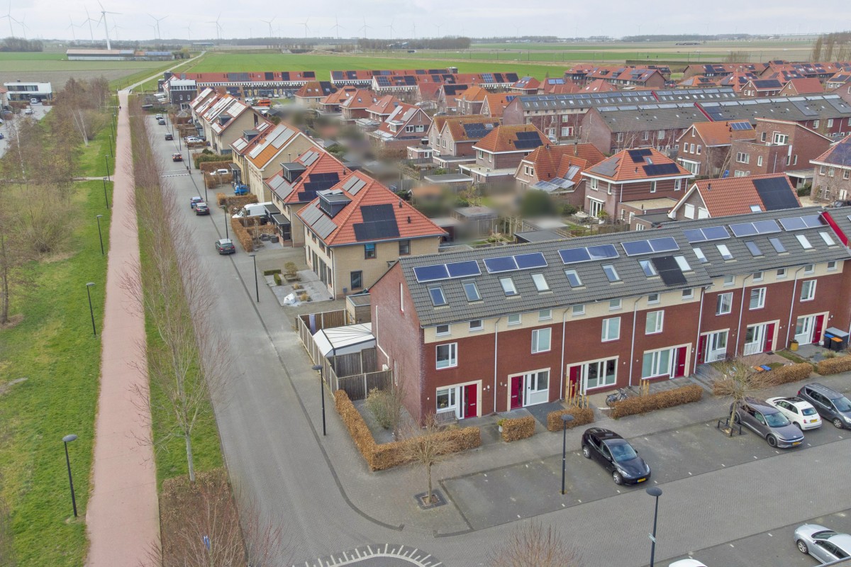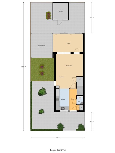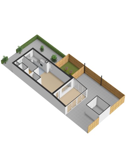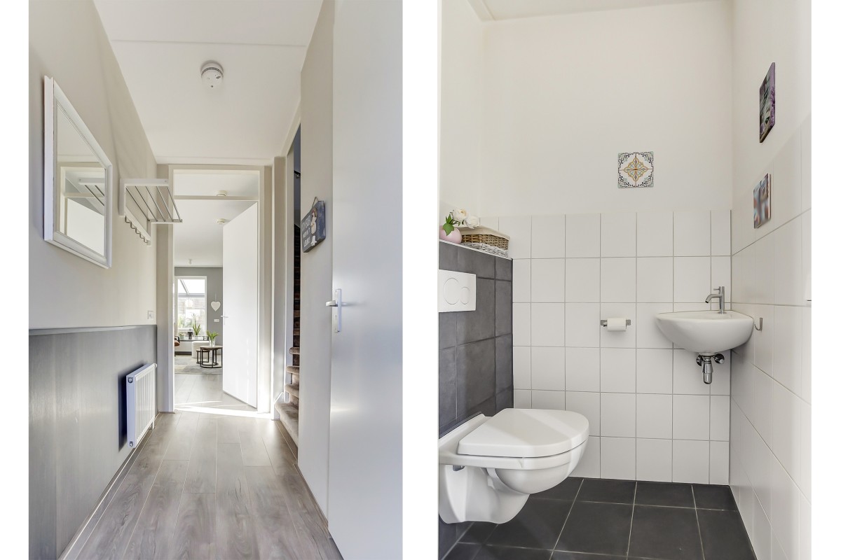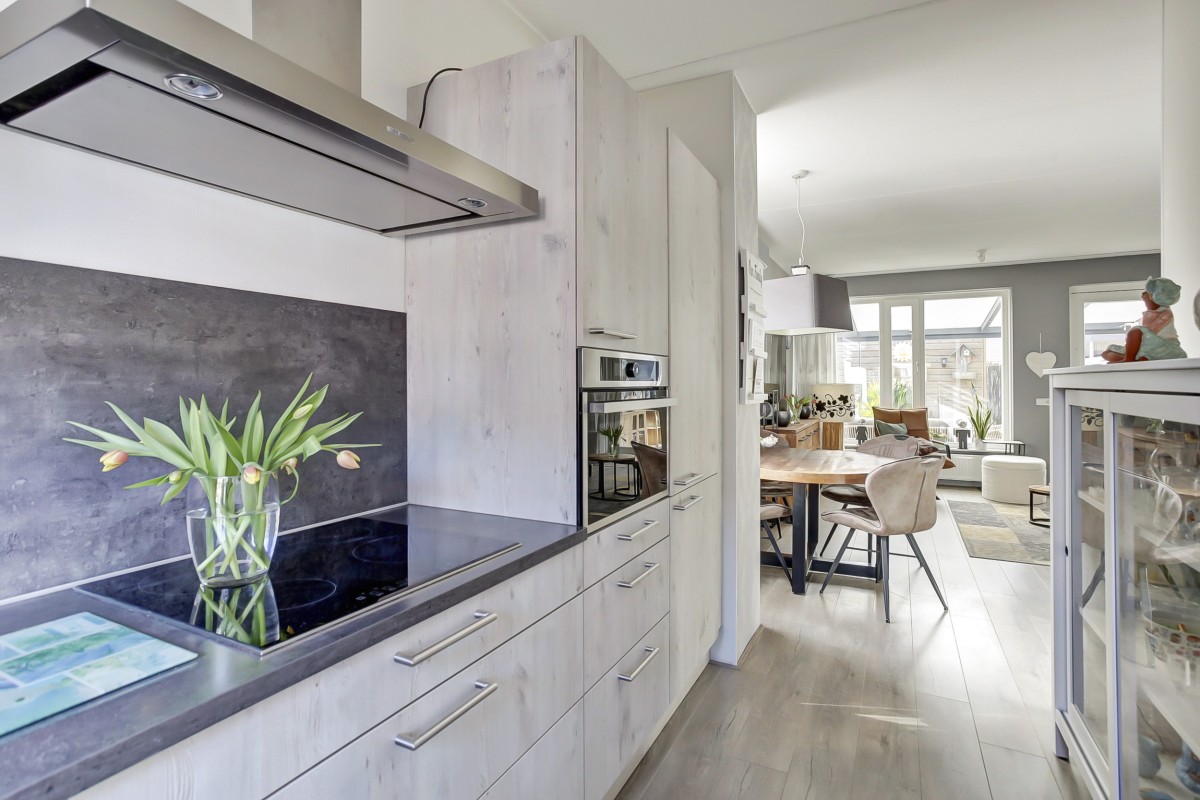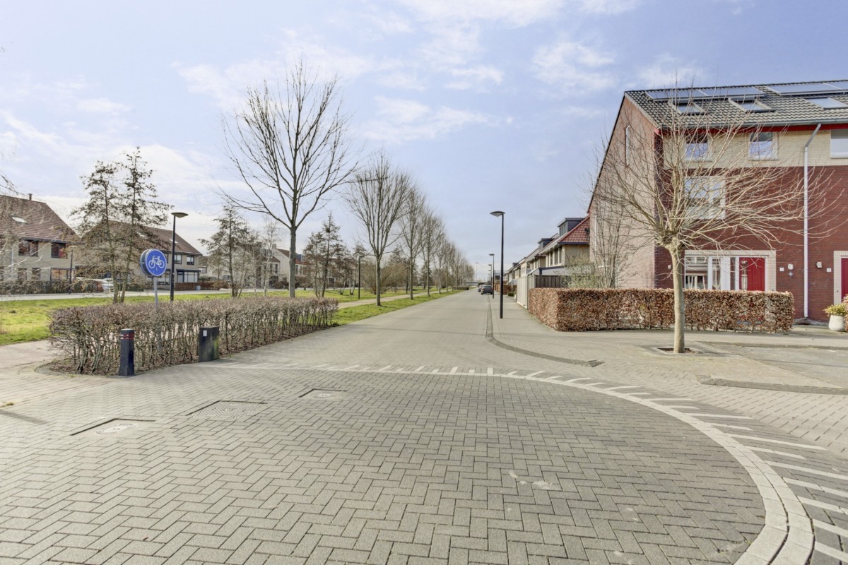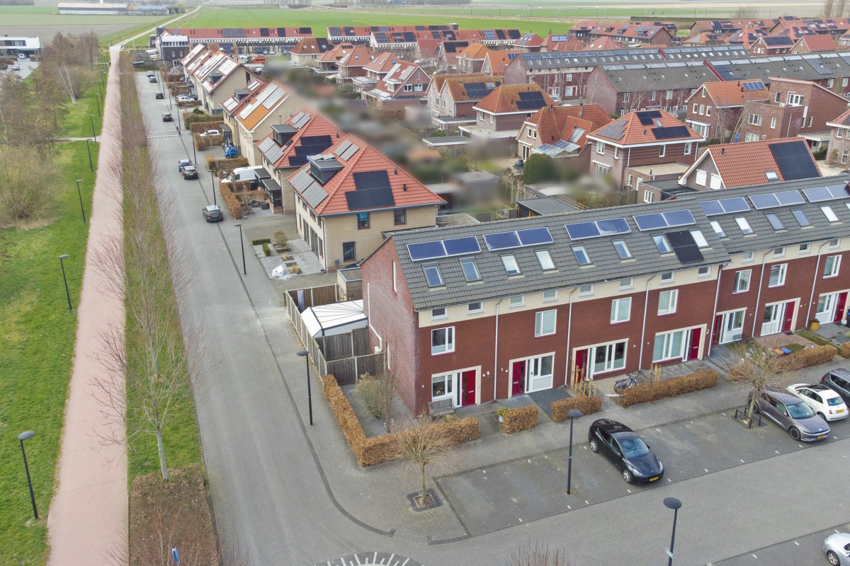 Begane grond: entree, hal met garderobe, moderne toiletruimte met hangcloset en fonteintje, uitgebreide meterkast, straatgerichte keuken welke in een hoek is opgesteld en voorzien is van een ruim werkblad, veel kastruimte en een ingebouwde vaatwasser, koelkast, vrieskast, combimagnetron, inductiekookplaat en afzuigkap. Vanuit de keuken is vrij uitzicht op de straat en de naastgelegen groenvoorziening. Aan de achterzijde van de woning is de tuingerichte woonkamer gesitueerd welke beschikt over een ruime trapkast, airconditioning en een doorgang naar de aangebouwde overkapping. De overkapping is middels glazen schuifpanelen afsluitbaar en als serre te gebruiken. De tuin is op het westen gesitueerd en bereikbaar vanuit een zijingang en achterom. De tuin is onderhoudsarm aangelegd en voorzien van een vrijstaande houten berging.