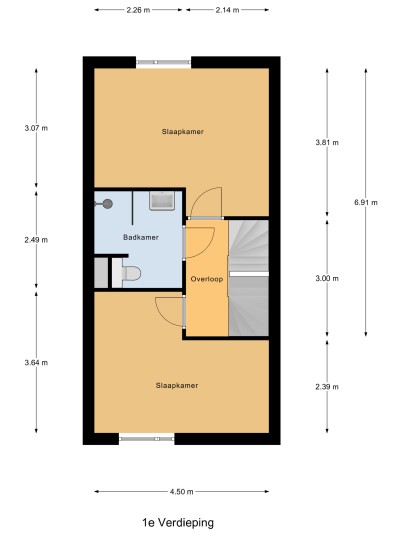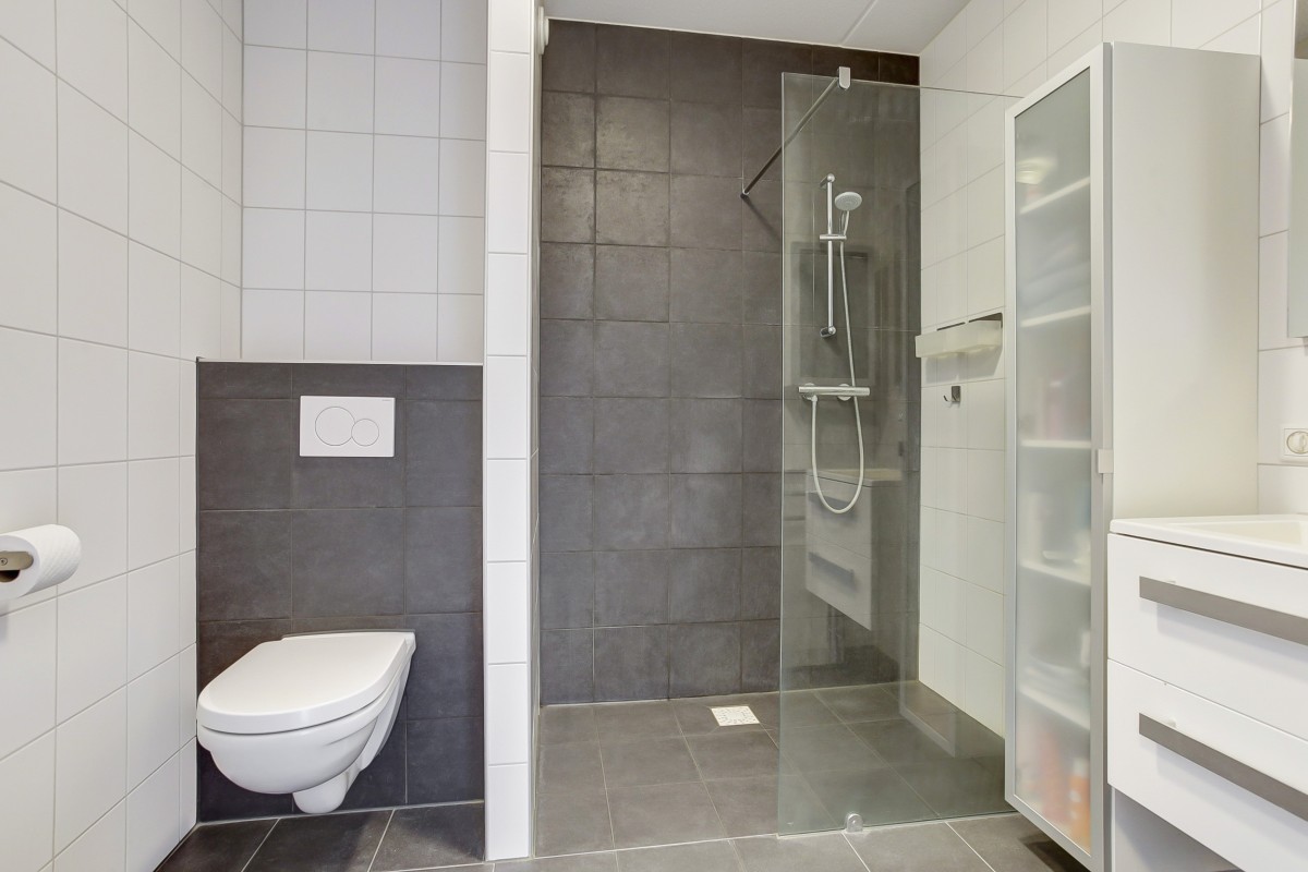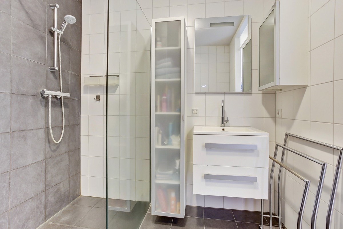 Eerste verdieping: overloop met aansluitend 2 mooie slaapkamers welke over de gehele breedte van de woning gesitueerd zijn. De slaapkamer aan de tuinzijde is eveneens voorzien van airconditioning. De badkamer beschikt over een wastafelmeubel, 2e hangcloset en een grote inloopdouche.