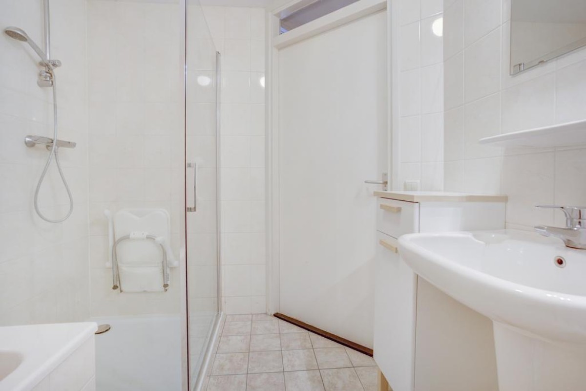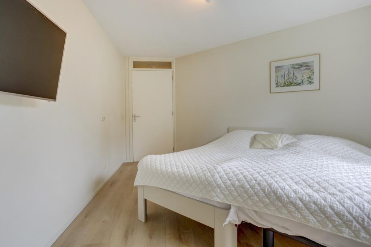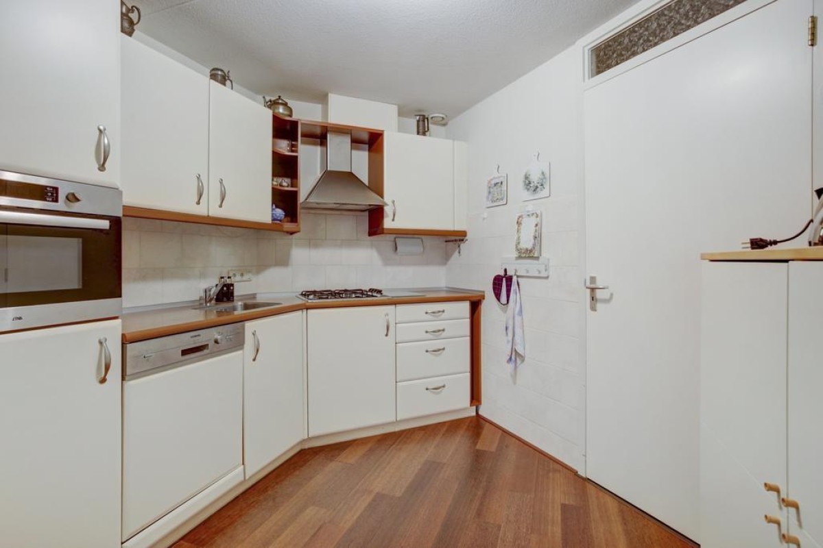 De open hoekkeuken is voorzien van veel kastruimte, lades en een ingebouwde combimagnetron, koelkast, vaatwasser, een 4-pits gaskookplaat kookplaat met rvs afzuigkap. Aansluitend is de bijkeuken gesitueerd waar de mechanische ventilatie, HR c.v.-ketel (Intergas HRE 2020) en wasmachineaansluiting staan opgesteld. Een tweede hal biedt toegang tot 2 mooie slaapkamers en de badkamer. De hoofdslaapkamer alsmede de hal zijn in 2022 voorzien van een moderne pvc laminaatvloer. De badkamer is tot het plafond betegeld en voorzien van een ligbad, wastafel, 2e hangcloset en een inloop douche.