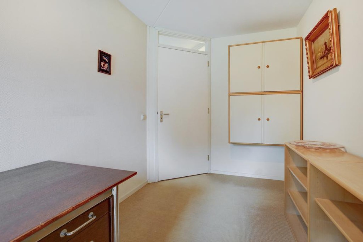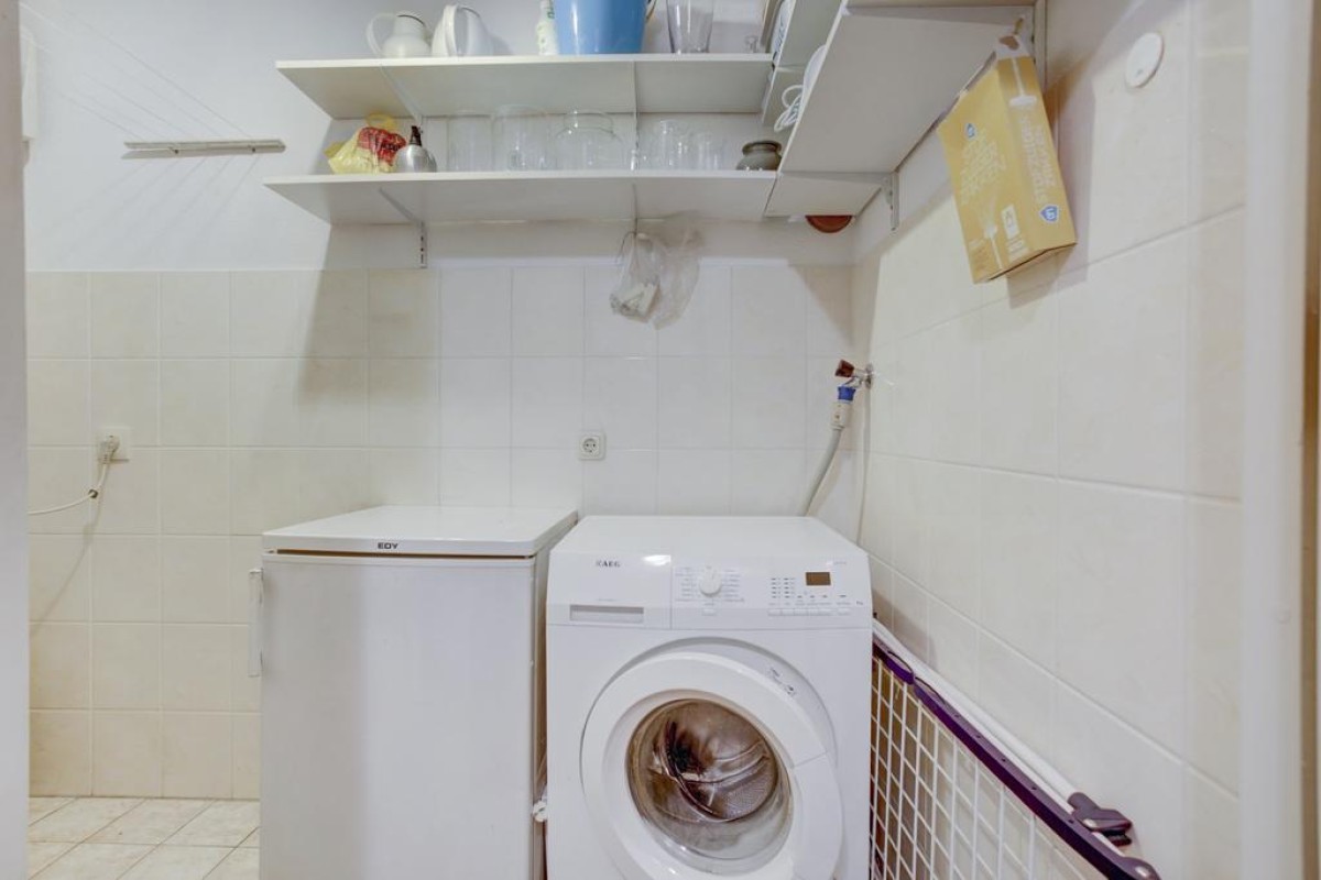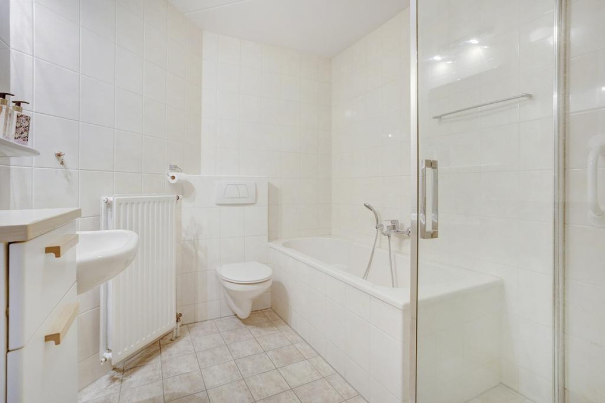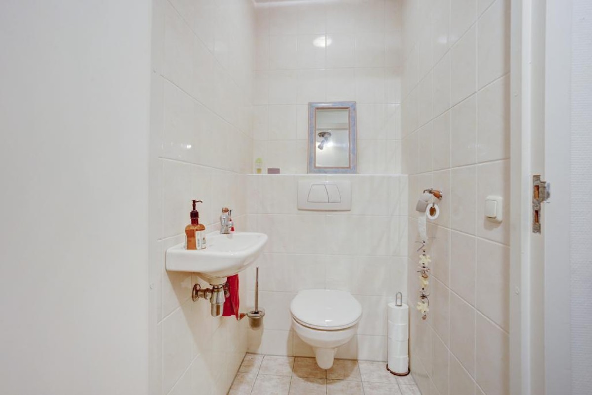 De open hoekkeuken is voorzien van veel kastruimte, lades en een ingebouwde combimagnetron, koelkast, vaatwasser, een 4-pits gaskookplaat kookplaat met rvs afzuigkap. Aansluitend is de bijkeuken gesitueerd waar de mechanische ventilatie, HR c.v.-ketel (Intergas HRE 2020) en wasmachineaansluiting staan opgesteld. Een tweede hal biedt toegang tot 2 mooie slaapkamers en de badkamer. De hoofdslaapkamer alsmede de hal zijn in 2022 voorzien van een moderne pvc laminaatvloer. De badkamer is tot het plafond betegeld en voorzien van een ligbad, wastafel, 2e hangcloset en een inloop douche.