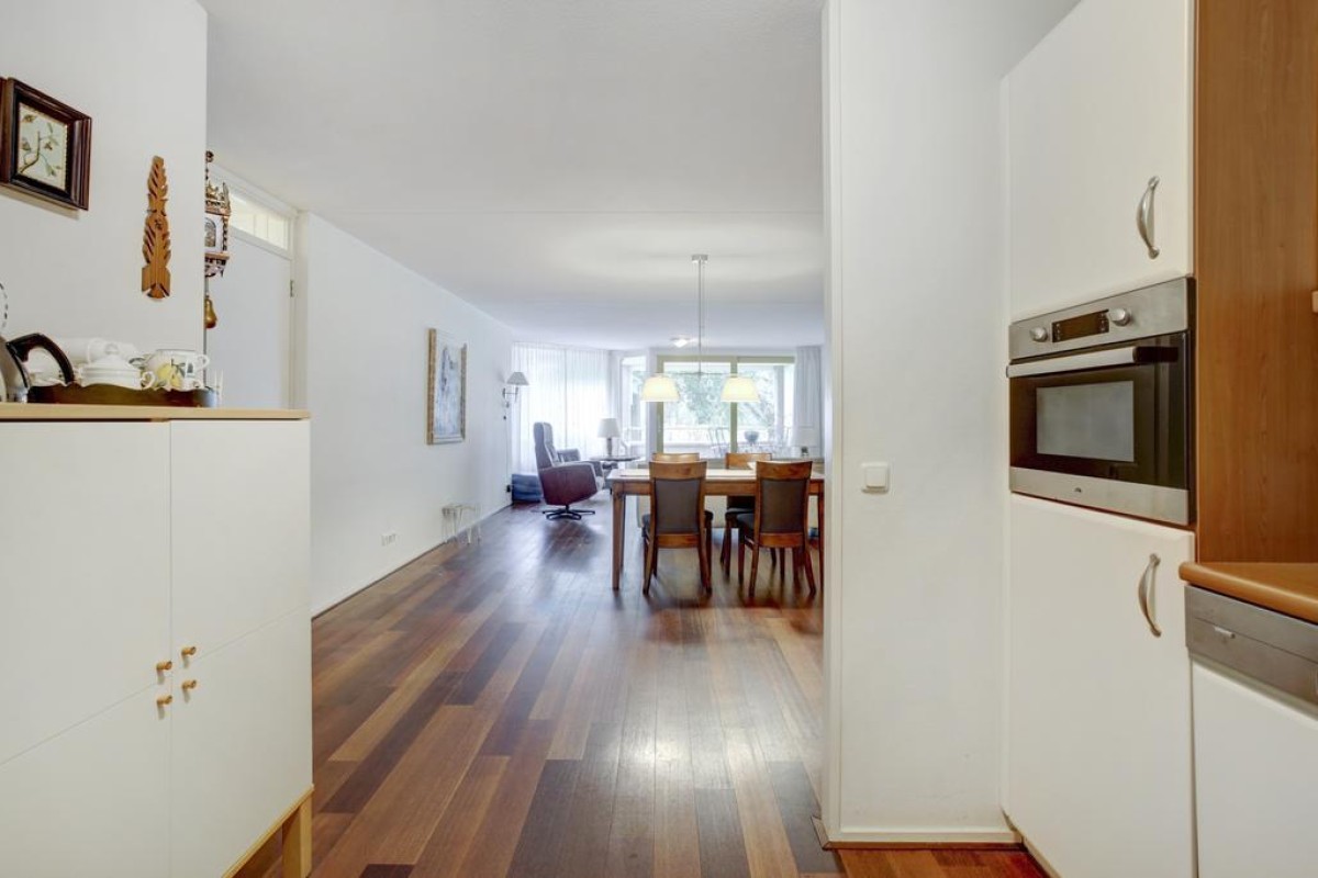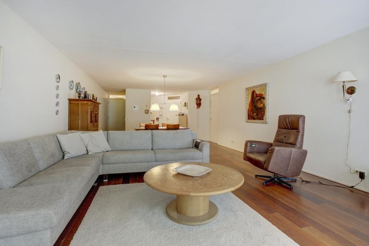 Lees verderDe privé-hal beschikt over een toiletruimte met hangcloset en fonteintje, een garderobe en toegang naar de ruime woonkamer. De woonkamer is door de diepte zeer riant en biedt middels een schuifpui toegang tot een groot terras op het westen. Het terras heeft een fraai weids uitzicht