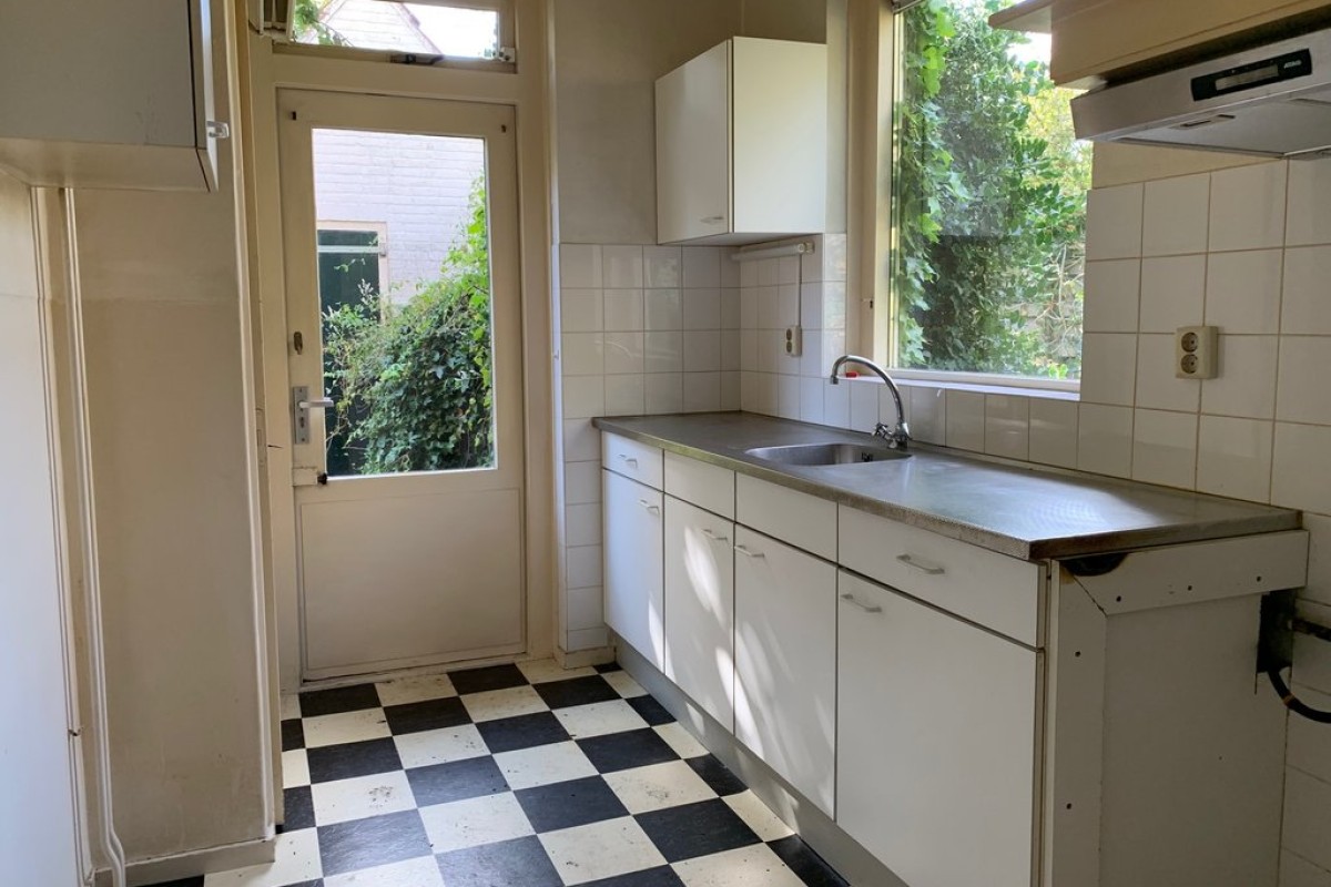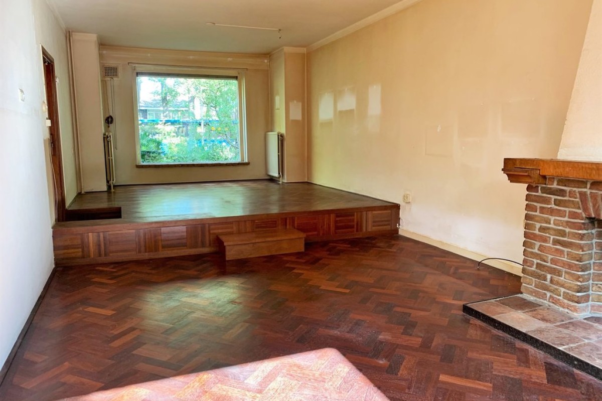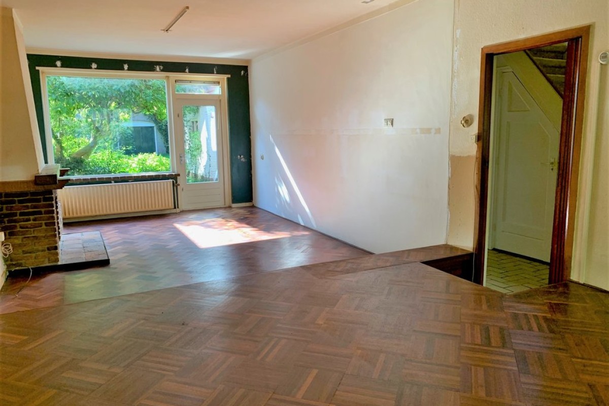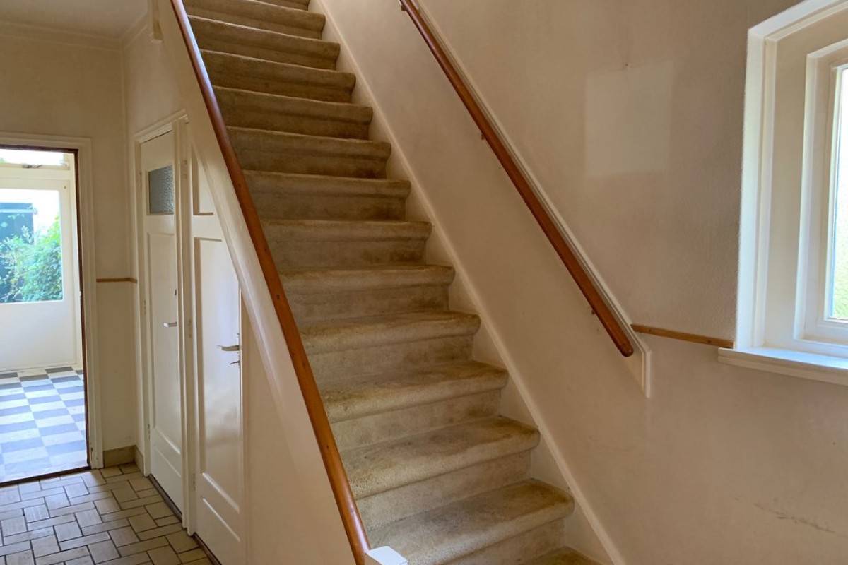 Begane grond: entree, hal met trapopgang, toegang naar de grote kelder, toilet, dichte keuken, royale woonkamer met erker aan de voorzijde;