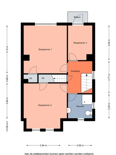 1e Verdieping: overloop, drie slaapkamers met vaste kasten en een badkamer voorzien van een douche, wastafel en toilet (sanibroyeur);