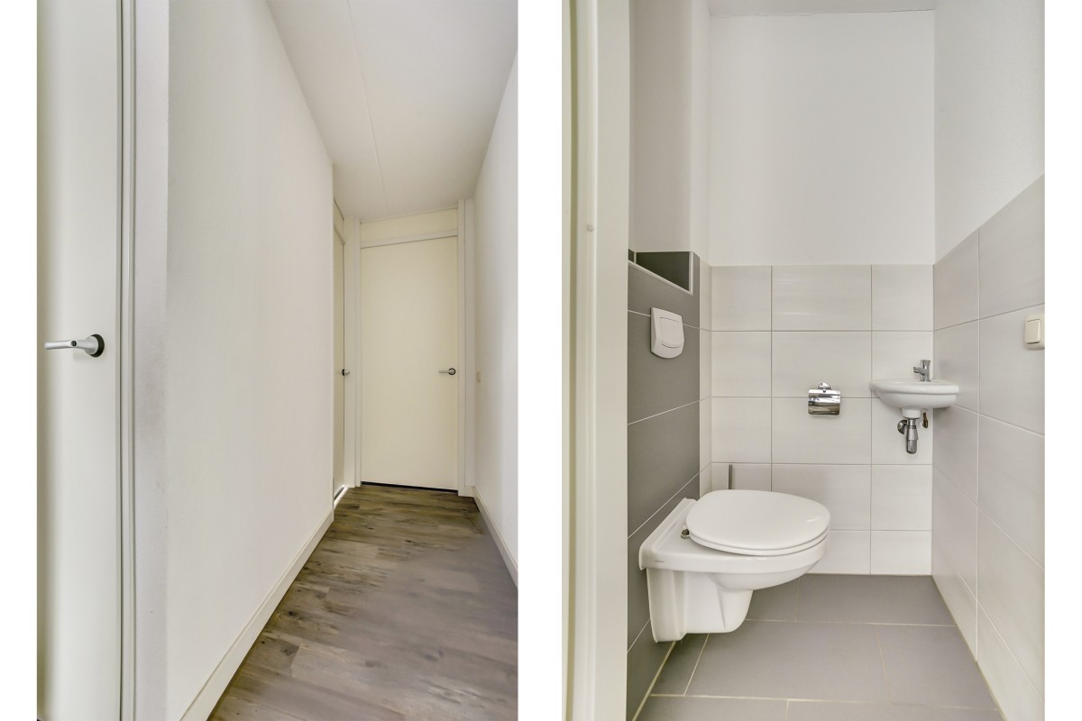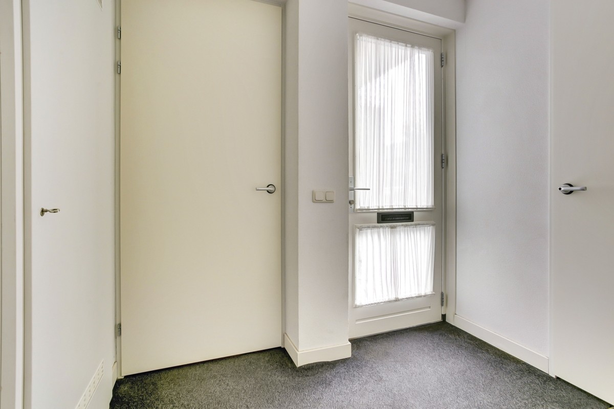 Begane grond: overdekt entree, hal met garderobe mogelijkheid, toiletruimte met hangcloset en fonteintje, meterkast, binnendoor naar de aangebouwde en geïsoleerde garage welke beschikt over een betonvloer voorzien van plavuizen, wasmachineaansluiting, opstelplaats van de c.v.-ketel, mechanische ventilatie unit en openslaande houten deuren naar de oprit.
