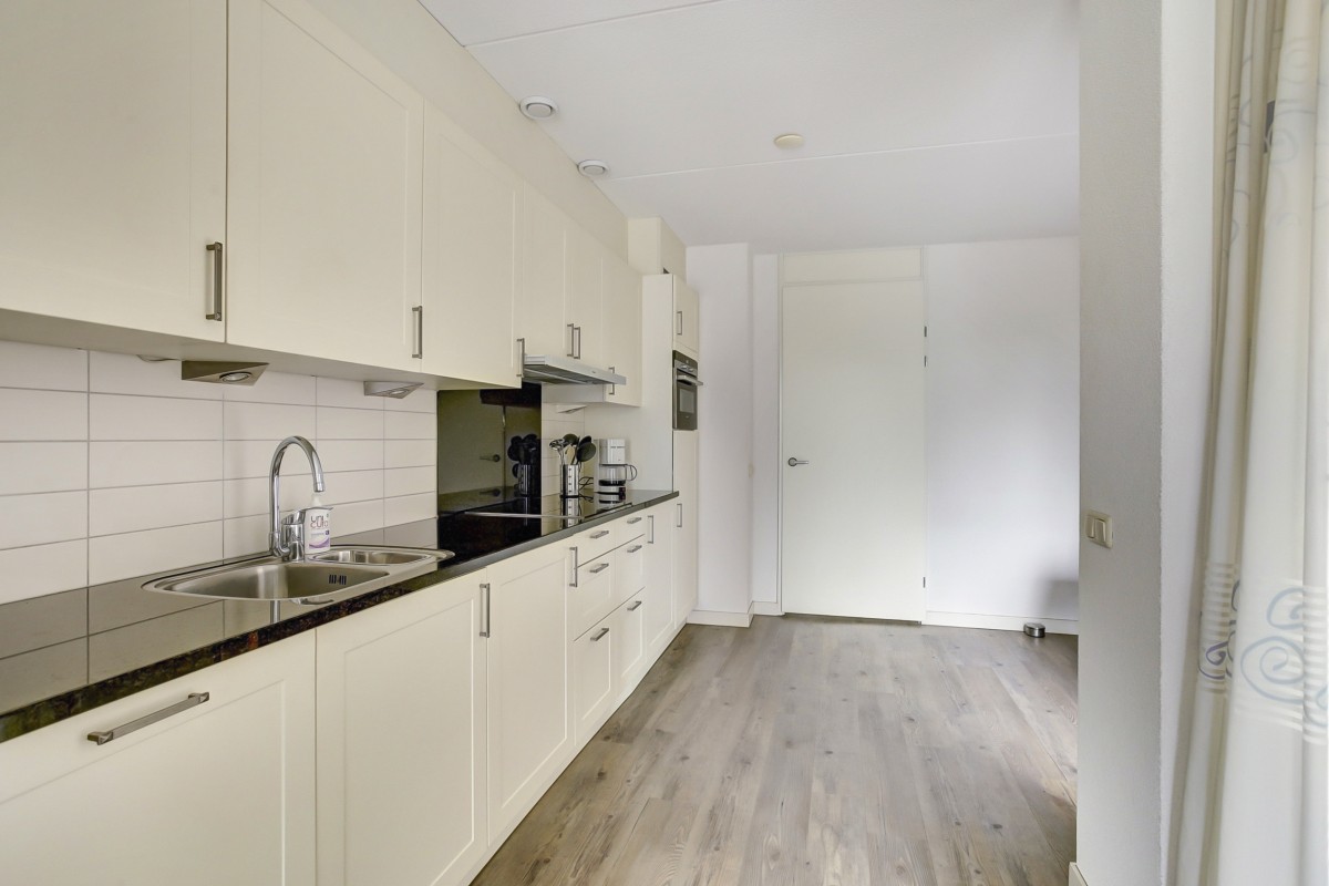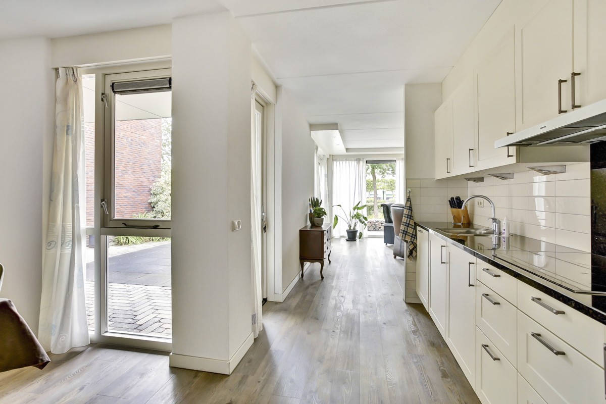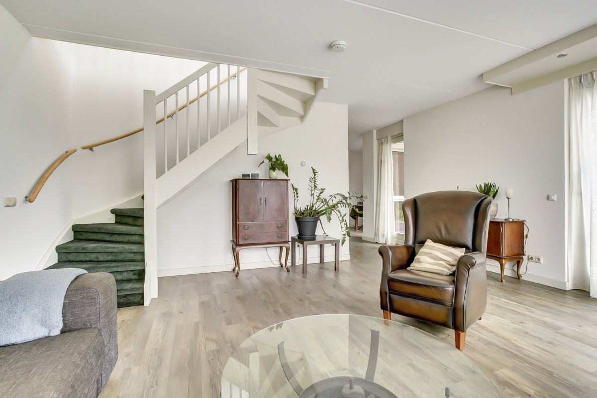 Vanuit de hal kom je in de luxe moderne open keuken met aangrenzend de eethoek en doorgang naar de woonkamer. De keuken is voorzien van veel kastruimte en beschikt over een ingebouwde koelkast, vaatwasser, 1,5 spoelbak, combimagnetron, 4 pits inductie kookplaat en een rvs afzuigkap en een loopdeur naar de tuin. De tuingerichte woonkamer is ruim van opzet en heerlijk licht door de grote raampartijen. De woonkamer is voorzien van een dichte vaste trap naar de etage en een schuifpui naar het terras en de tuin.