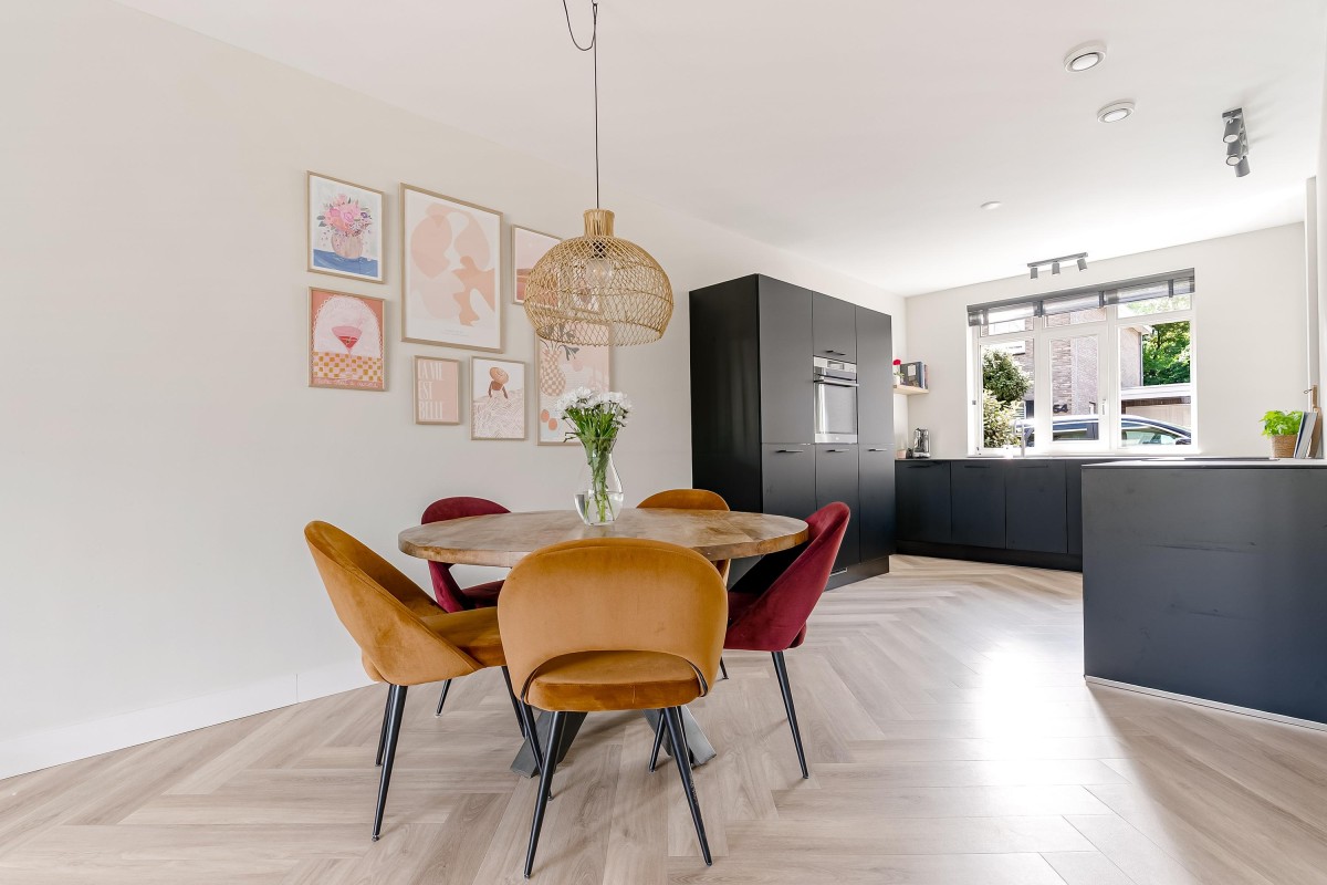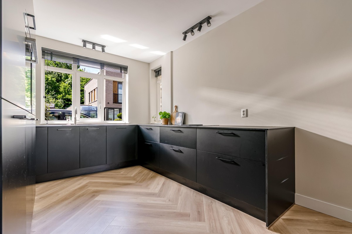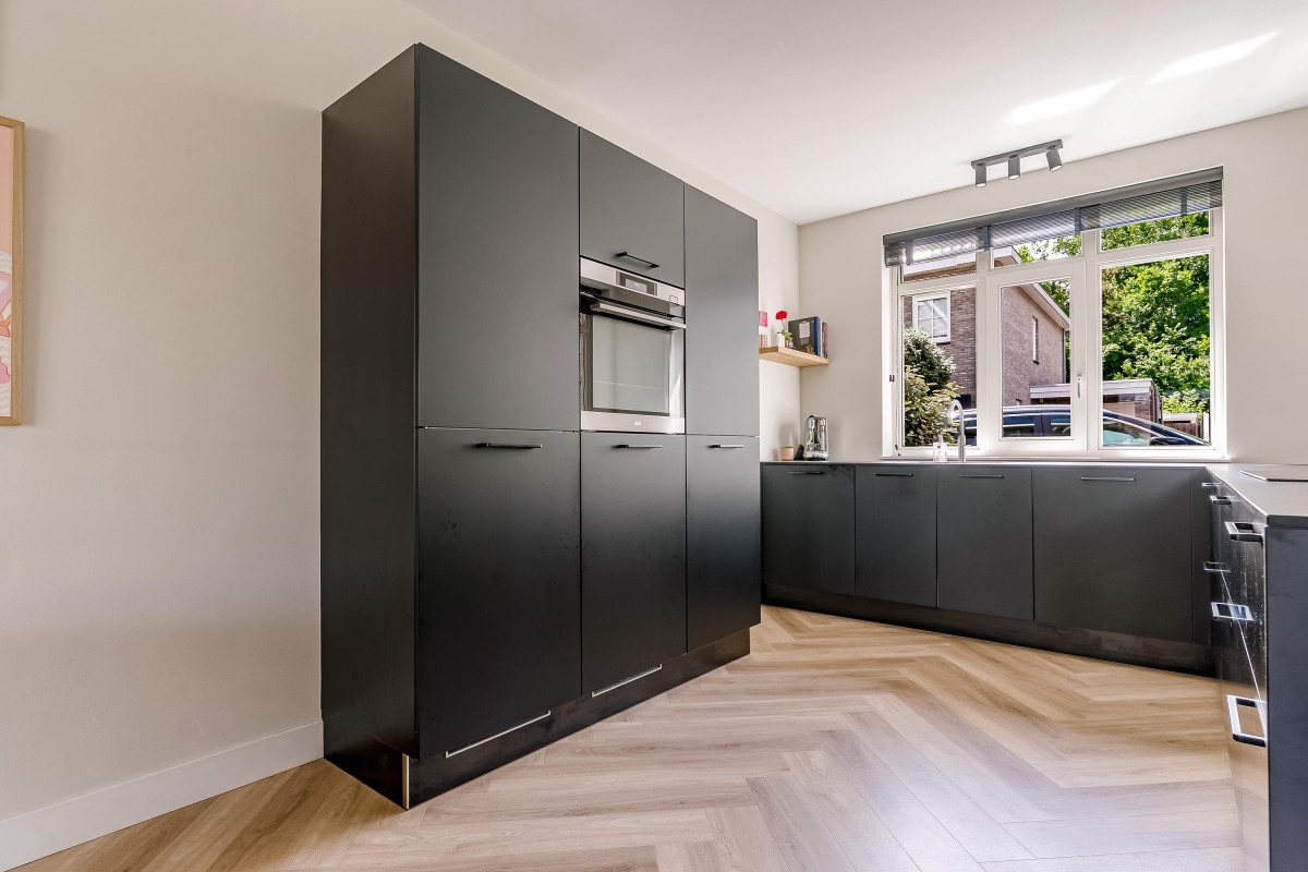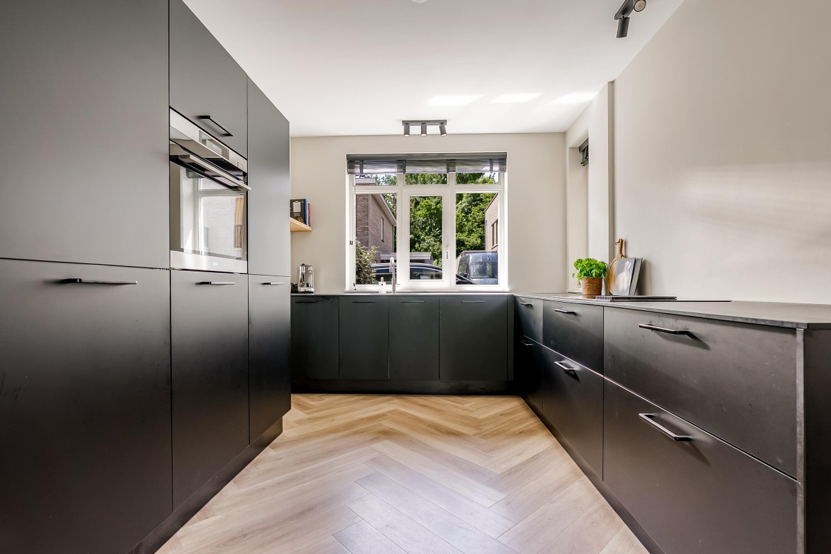 Aan de voorzijde van de woning vindt u de open keuken in praktische U-opstelling, uitgerust met hoogwaardige inbouwapparatuur: een vaatwasser, stoomoven, inductiekookplaat met geïntegreerde afzuiging, koelkast, vriezer en een Quooker.