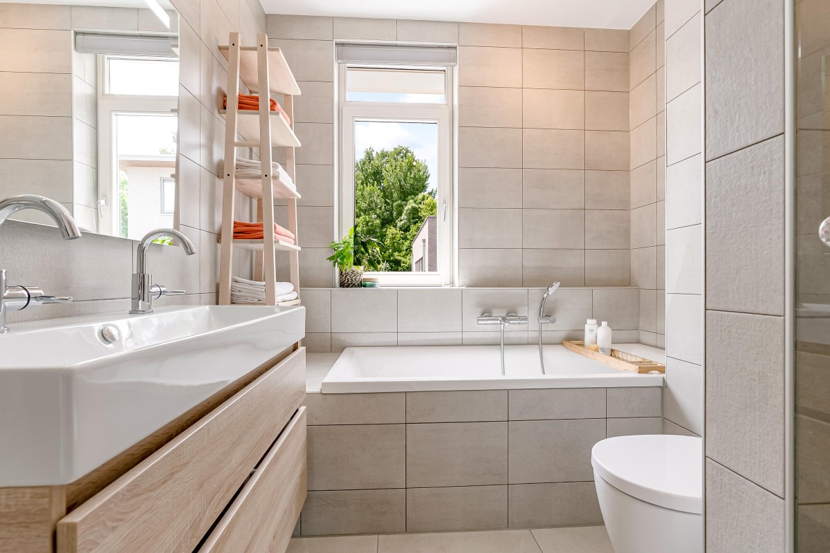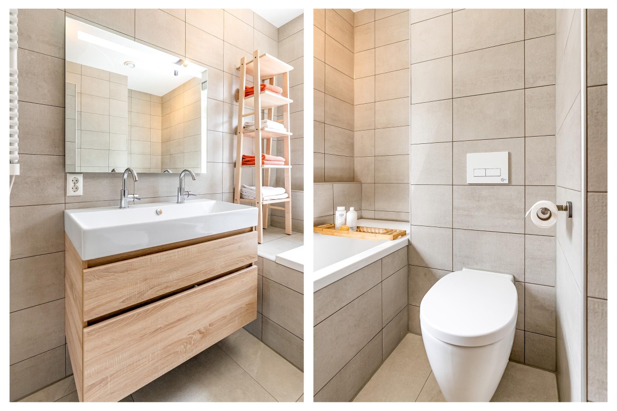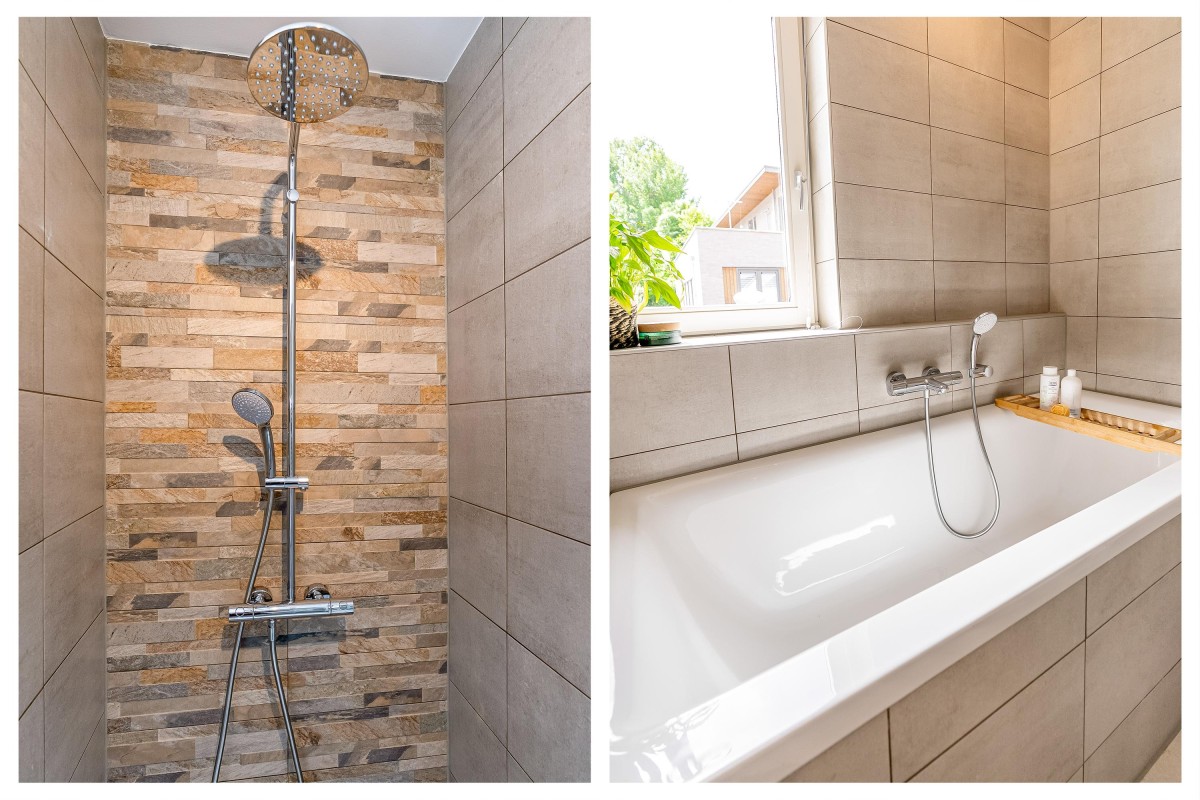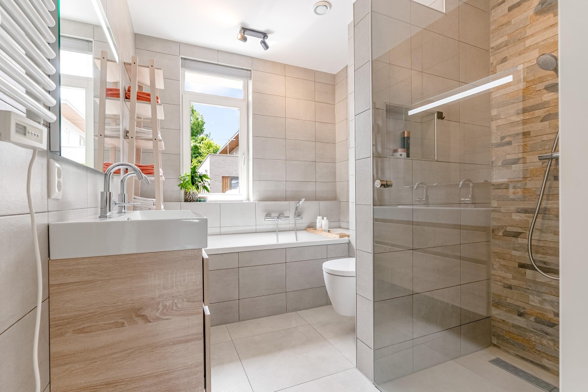 De badkamer is uitgerust met een inloopdouche, een stijlvol wastafelmeubel, een ligbad en een tweede toilet.
