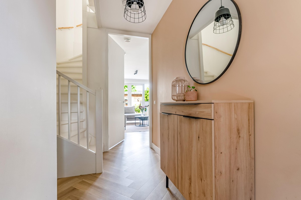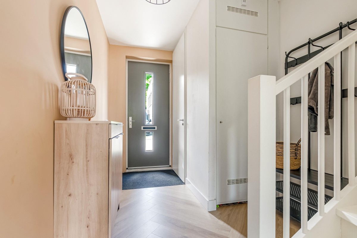Via de verzorgde voortuin bereikt u de entree van de woning. In de hal bevinden zich het moderne toilet, de meterkast, de trapopgang en de toegang tot de woonkamer.